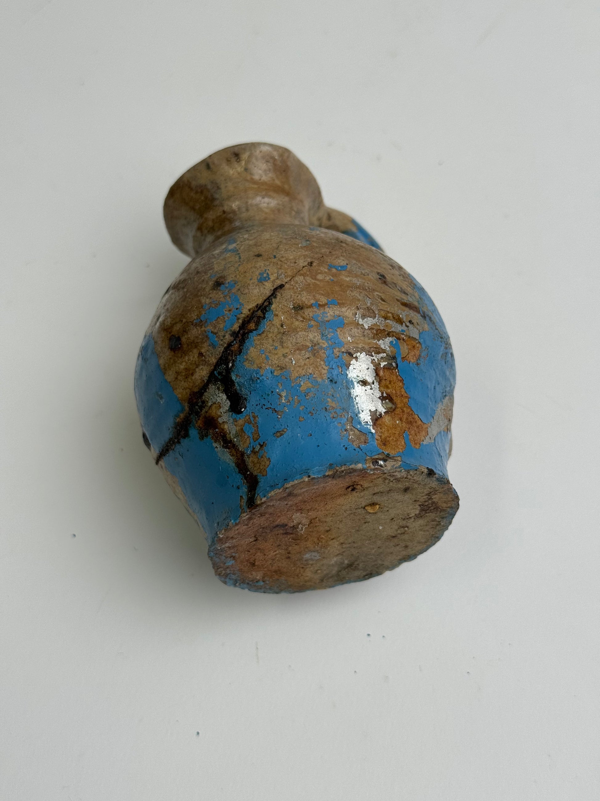 This vintage Mediterranean jug features details of blue peeled paint over years of wear. A beautiful piece showing off its patina and character.