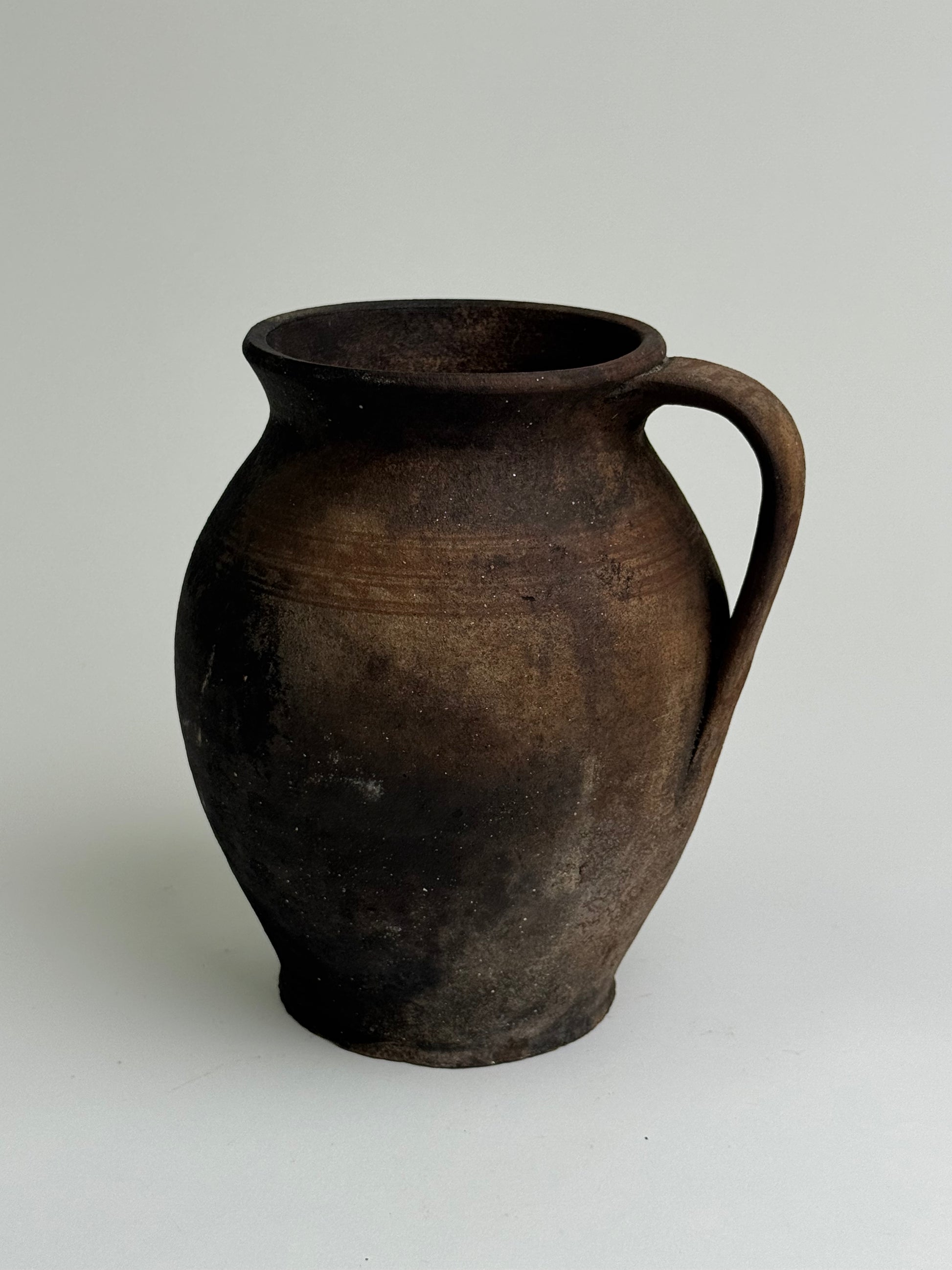 This Mediterranean Jug features a deep earthy brown finish with charcoaled texture and visible patina. A statement piece, beautiful styled alone or with preserved olive.