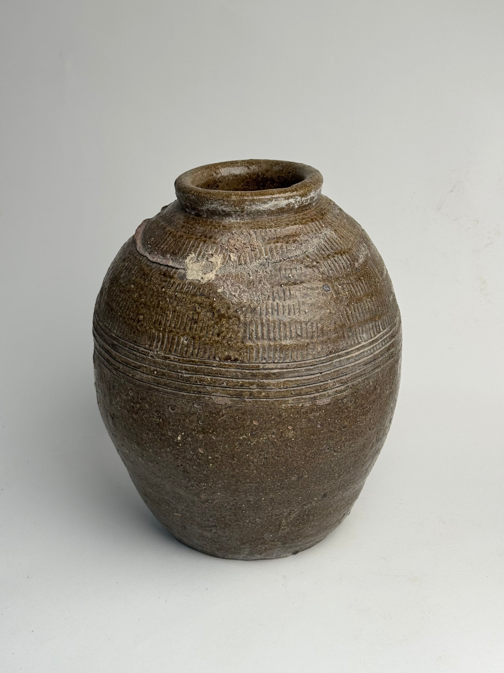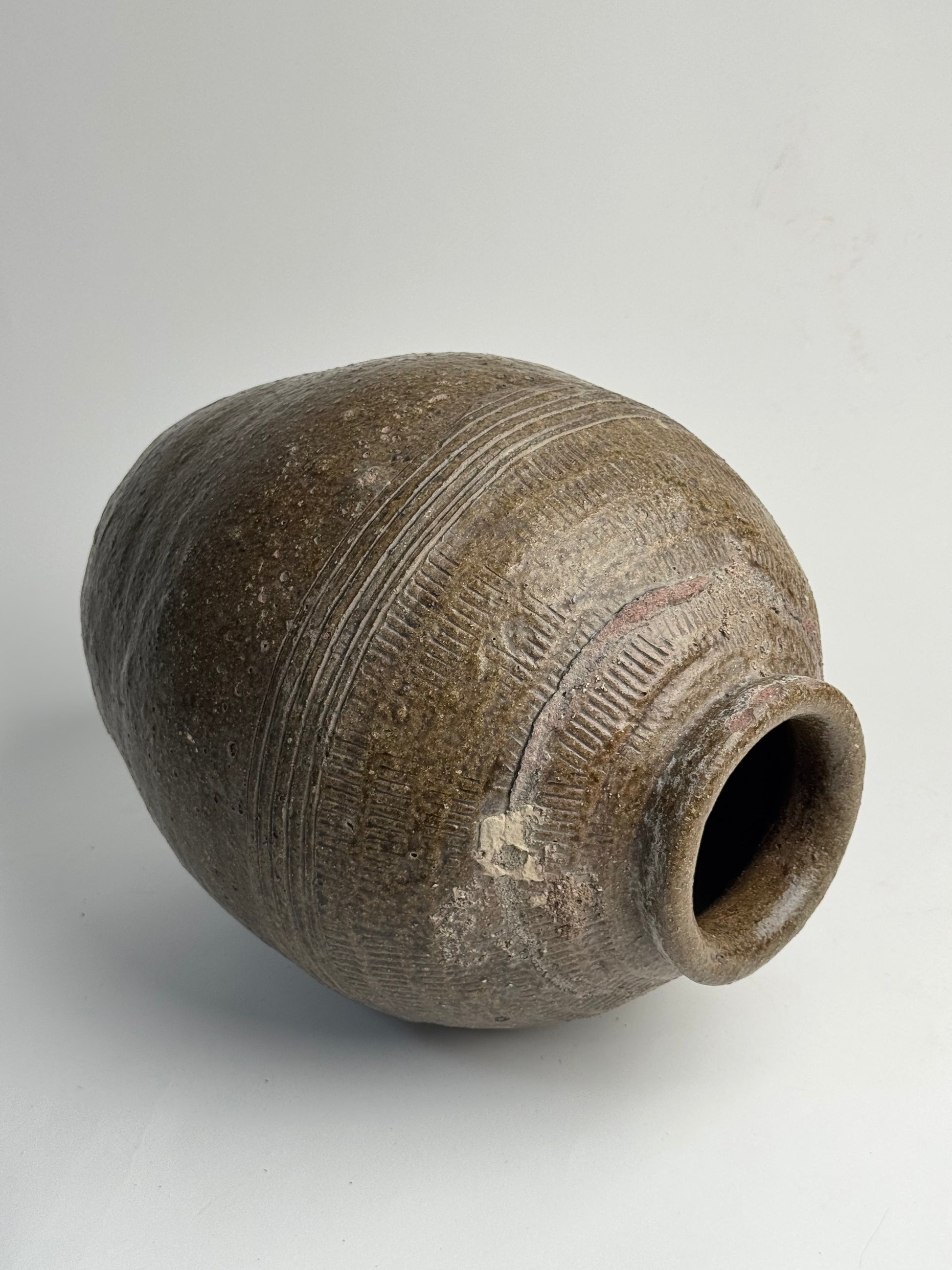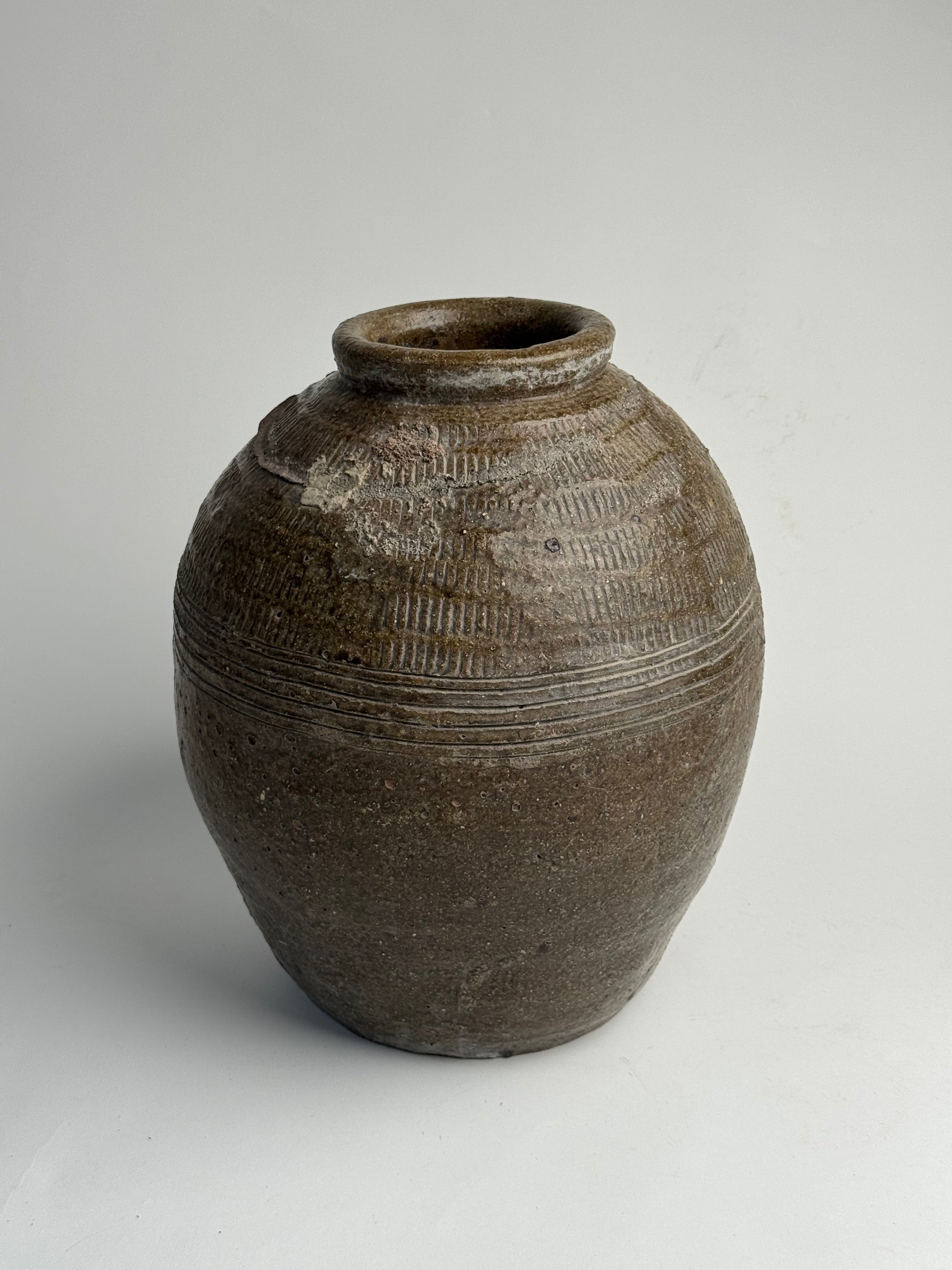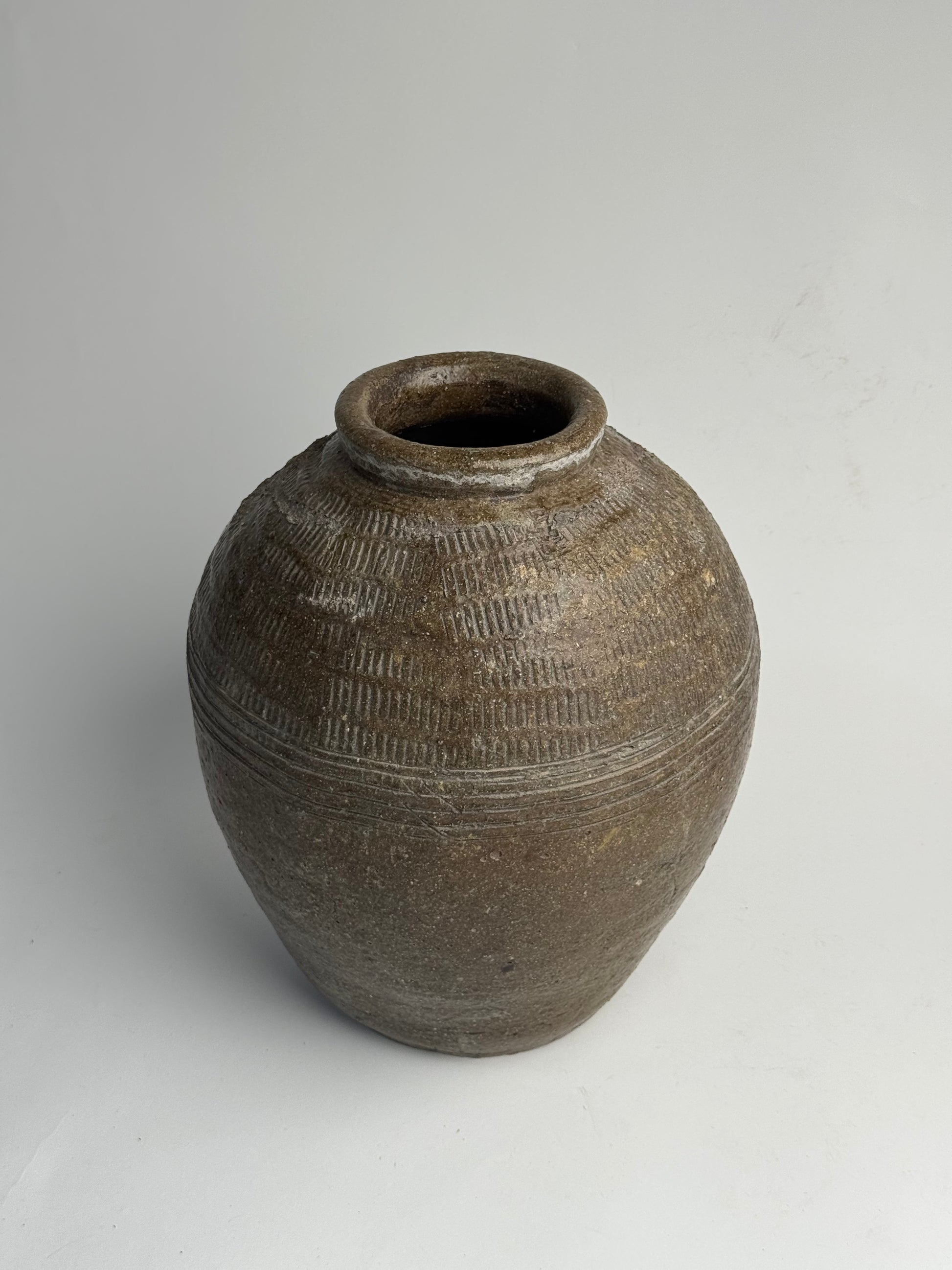 A real statement piece! This Chinese rice wine jar features etched line detailing and a lovely round, tapered form. Once used for storing and fermenting rice-based drinks, often buried and sealed for years and years! A truly special piece with so much history within.
