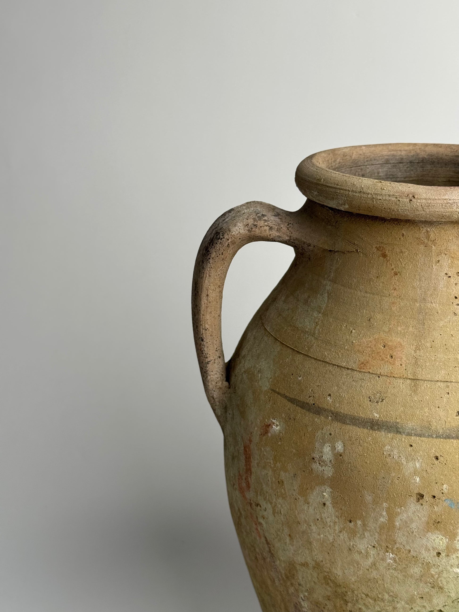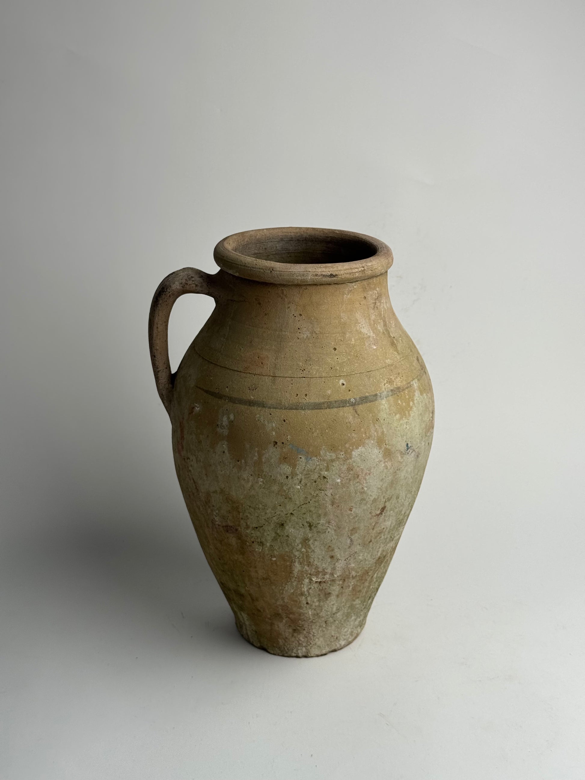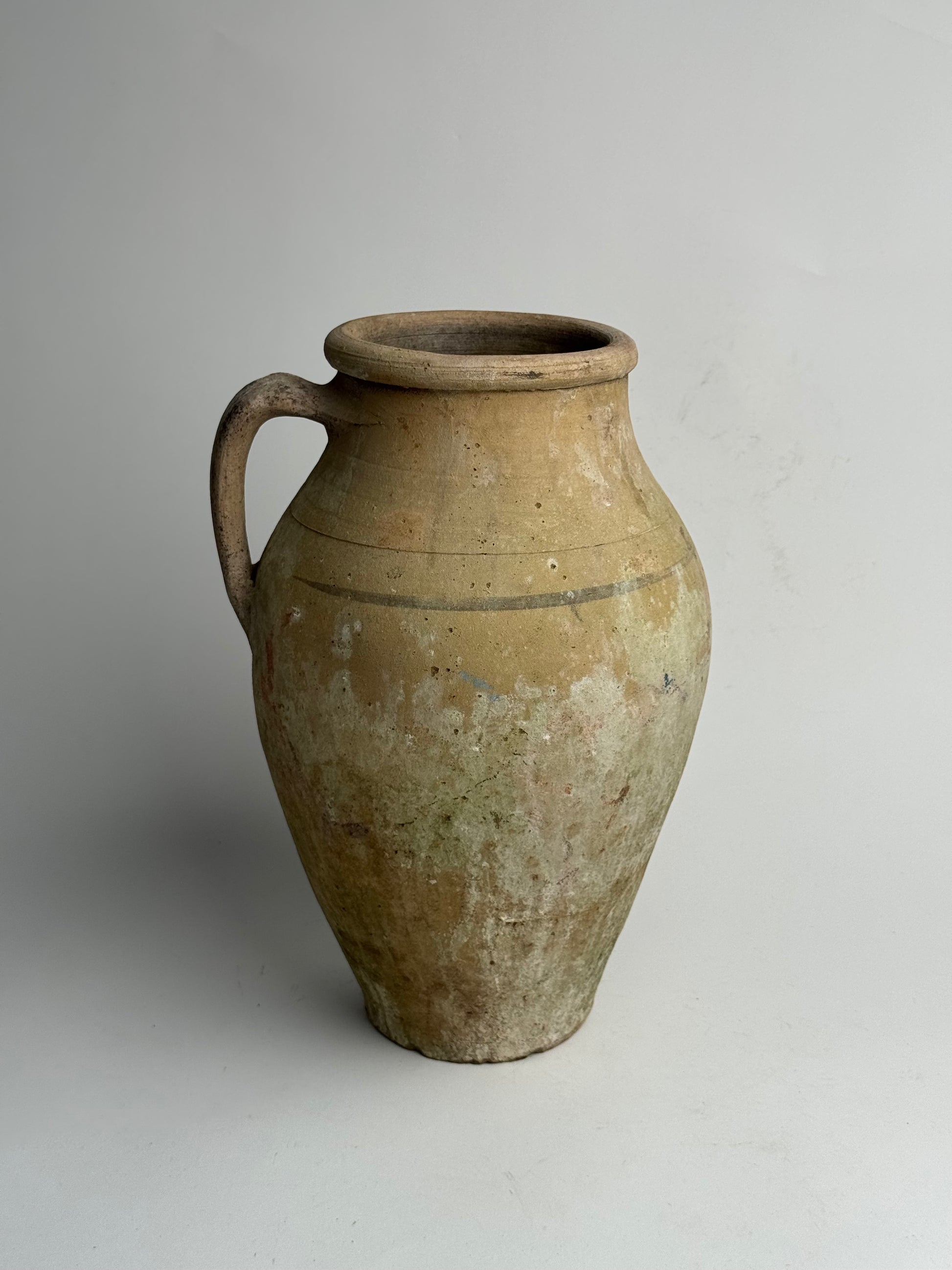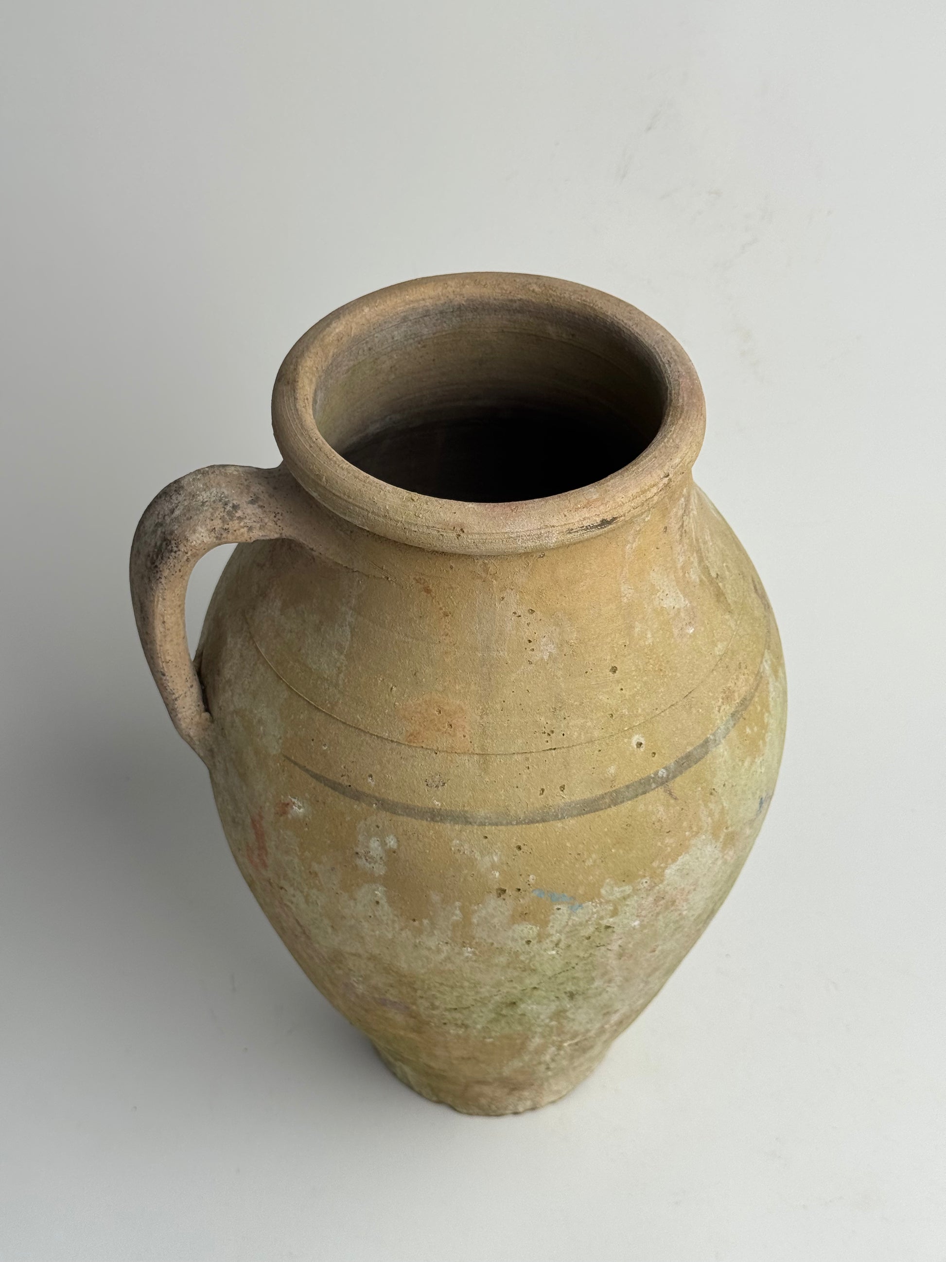 This large Turkish vessel, a traditional oil jug features a soft, sandy finish, a line detail around the wider point of the vessel and a single handle. Visible signs of wear and patina, a beautiful piece styled alone or with preserved olive for a Mediterranean look.