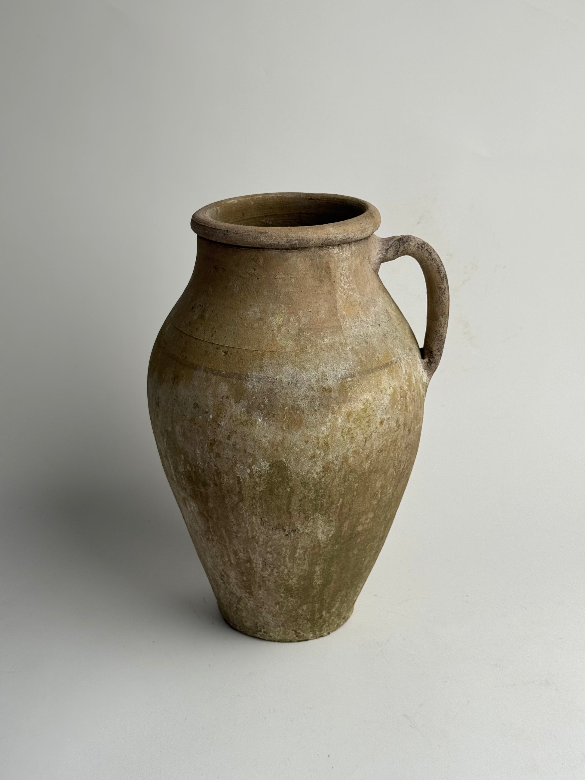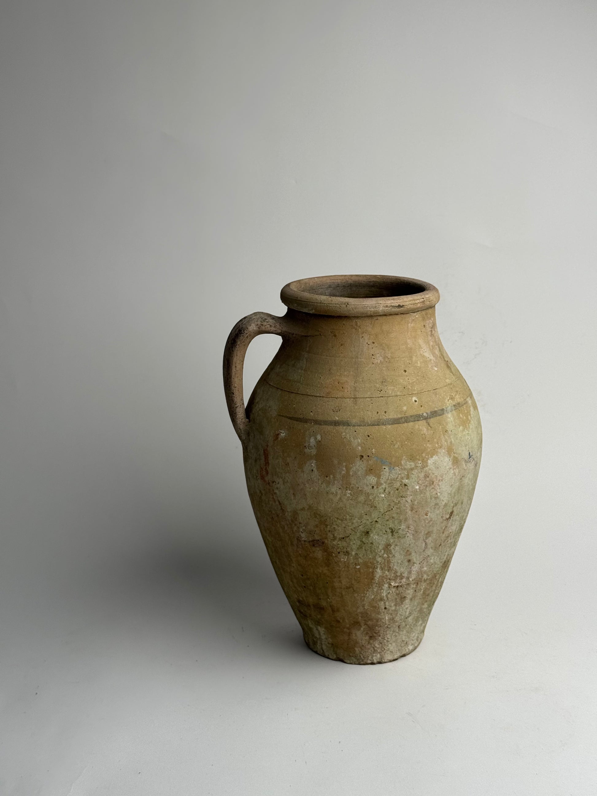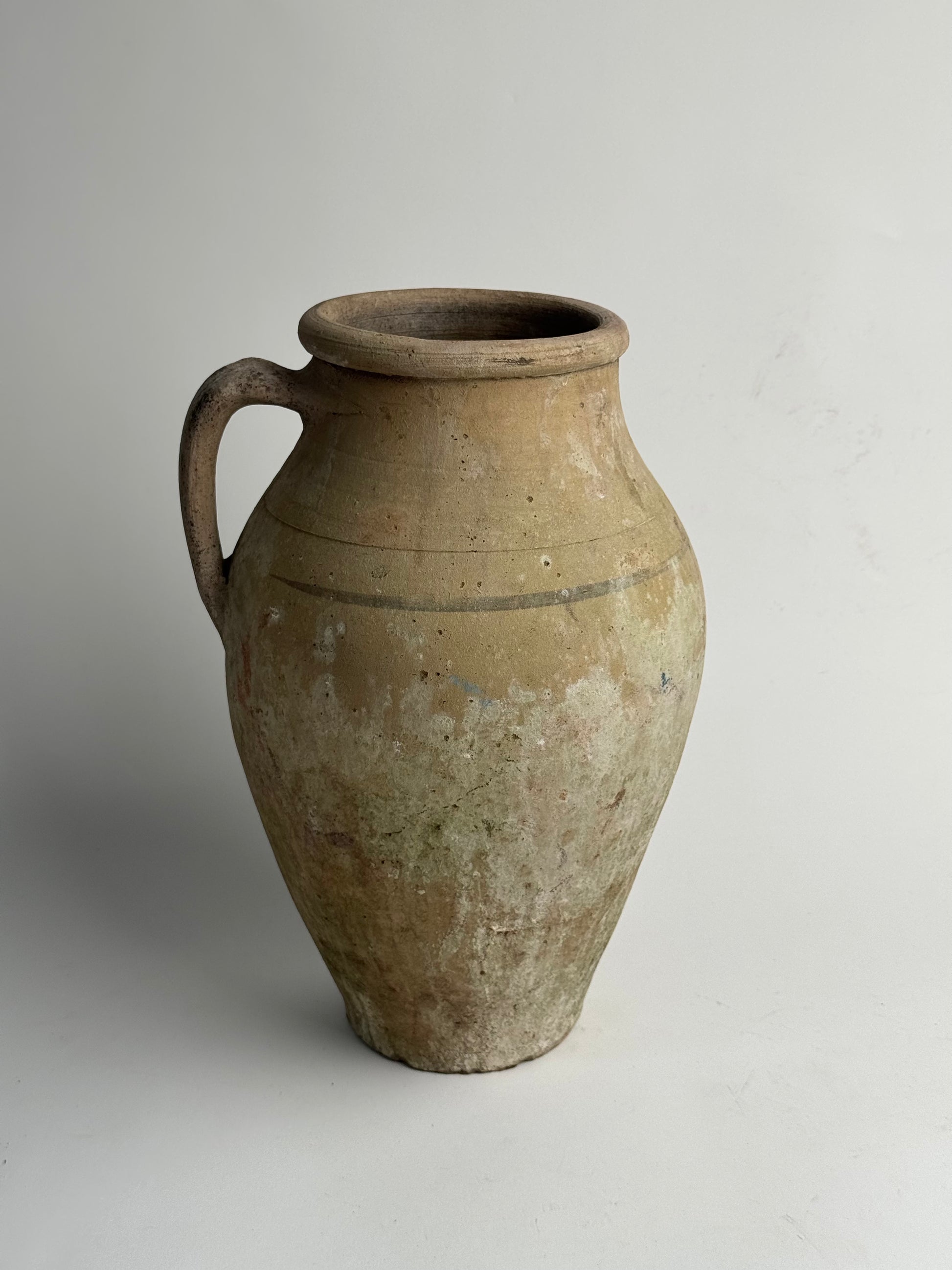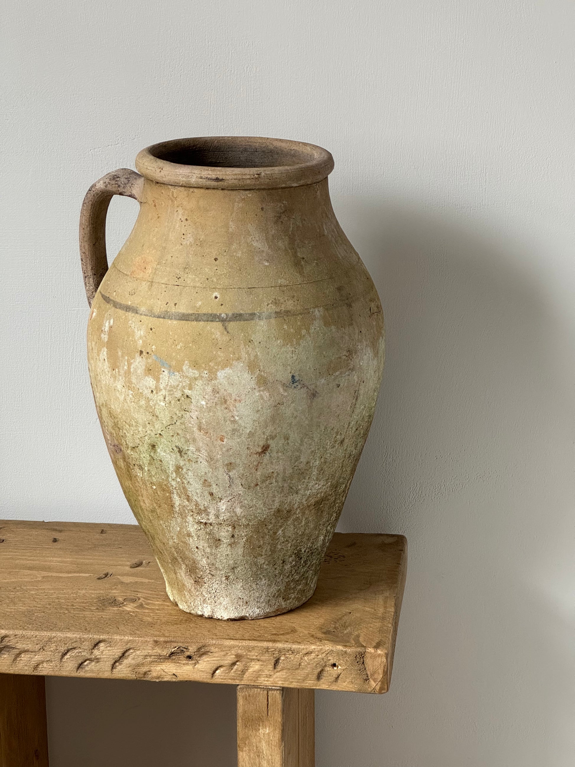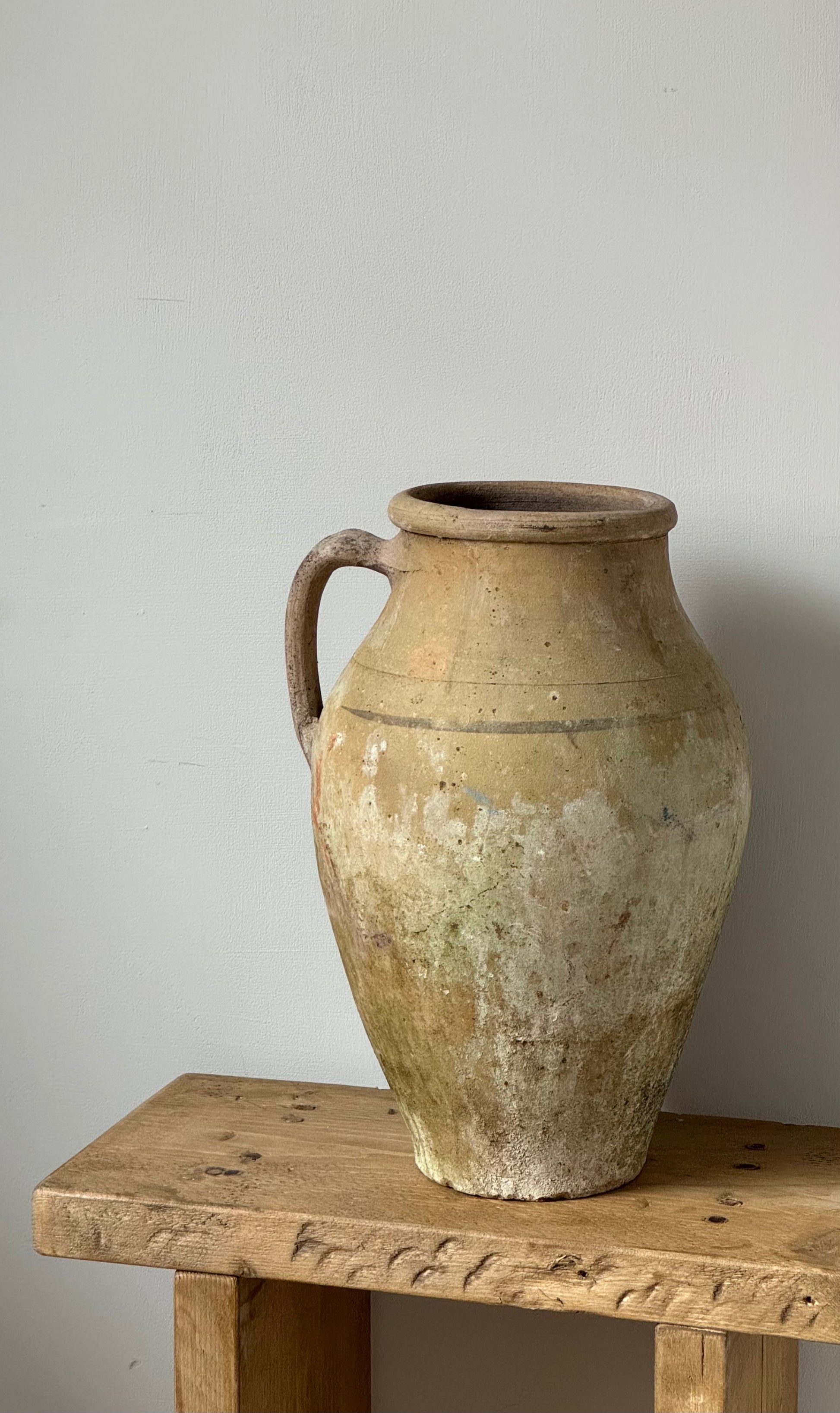 This large Turkish vessel, a traditional oil jug features a soft, sandy finish, a line detail around the wider point of the vessel and a single handle. Visible signs of wear and patina, a beautiful piece styled alone or with preserved olive for a Mediterranean look.