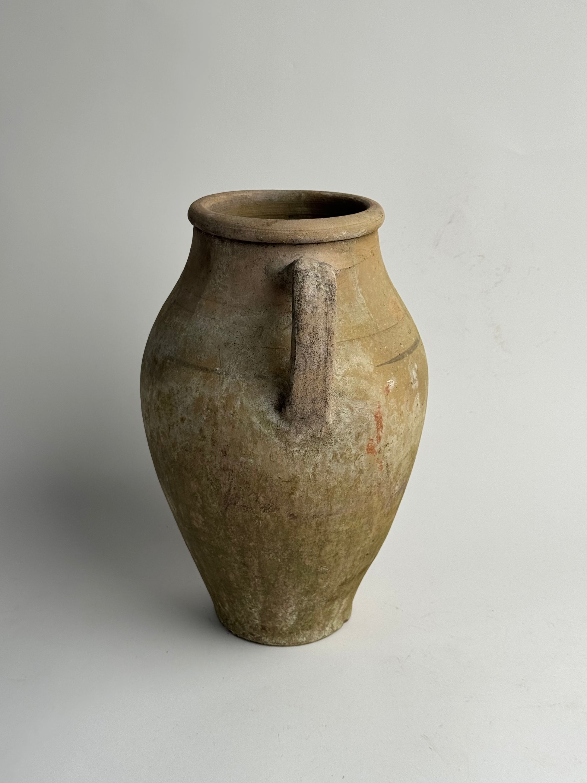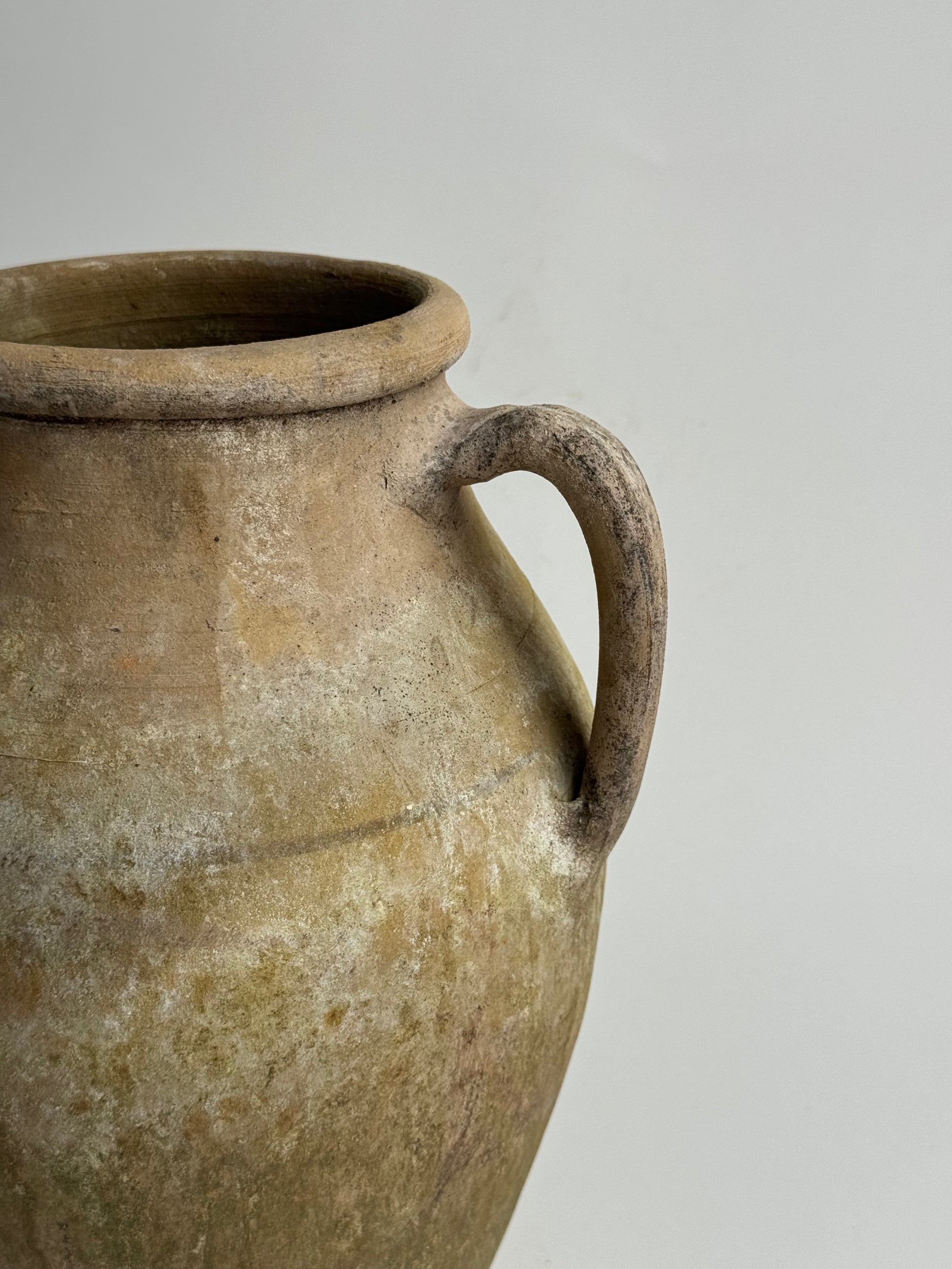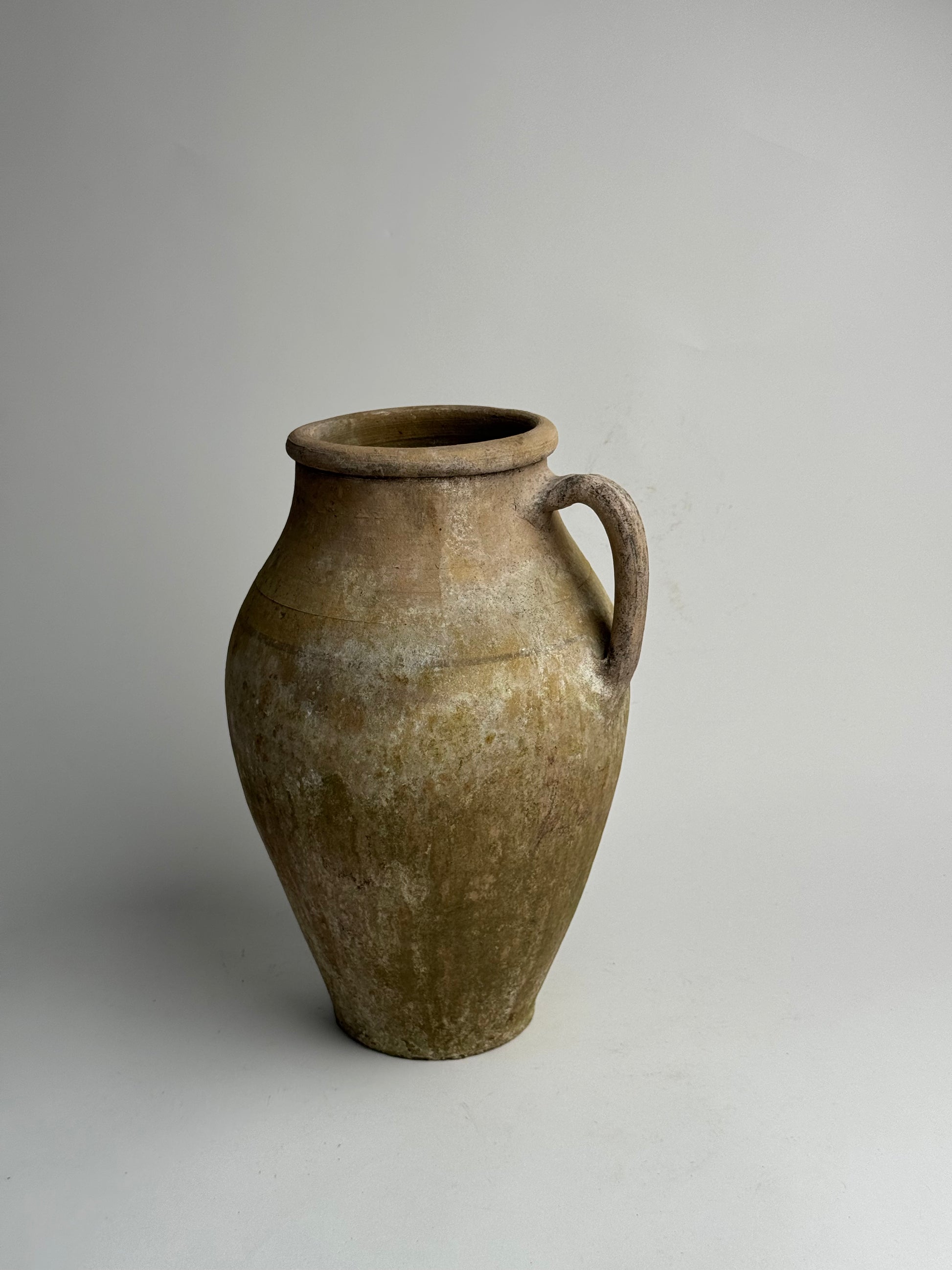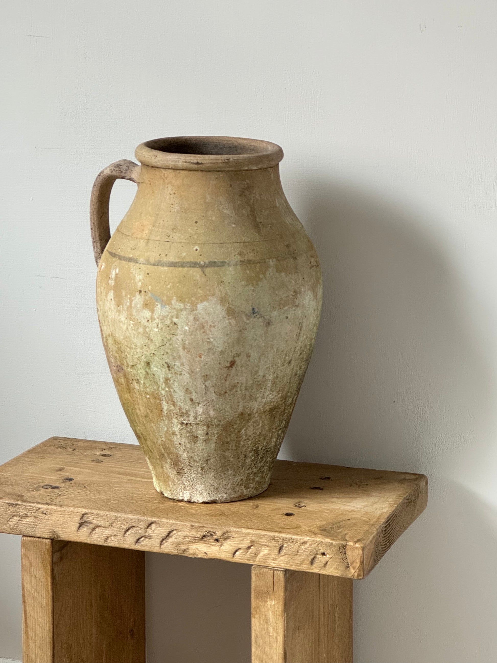 This large Turkish vessel, a traditional oil jug features a soft, sandy finish, a line detail around the wider point of the vessel and a single handle. Visible signs of wear and patina, a beautiful piece styled alone or with preserved olive for a Mediterranean look.