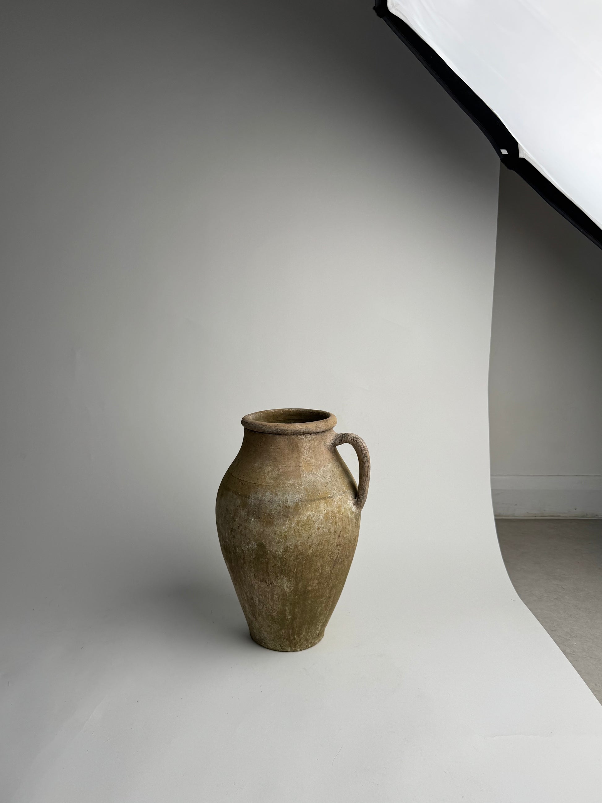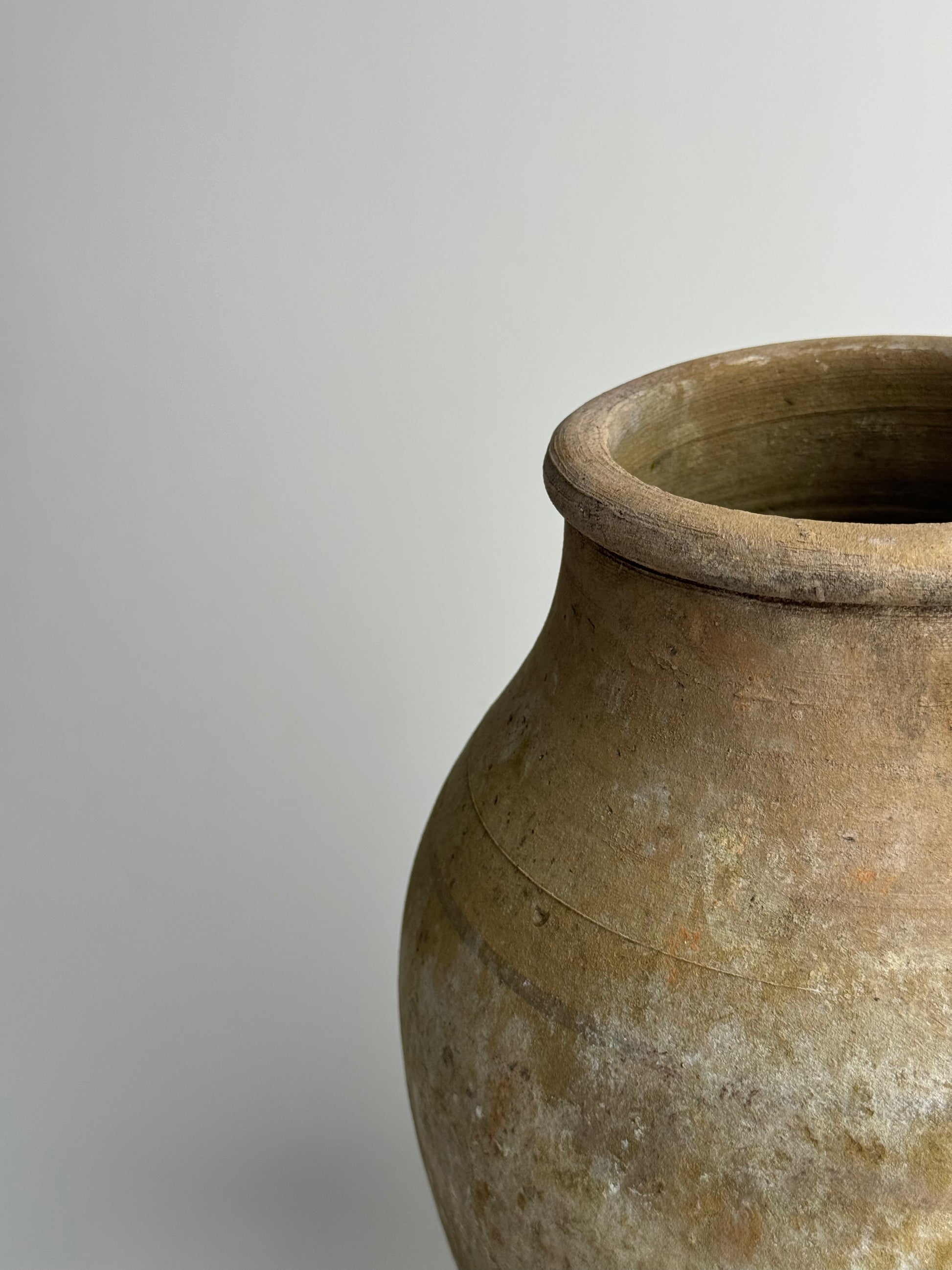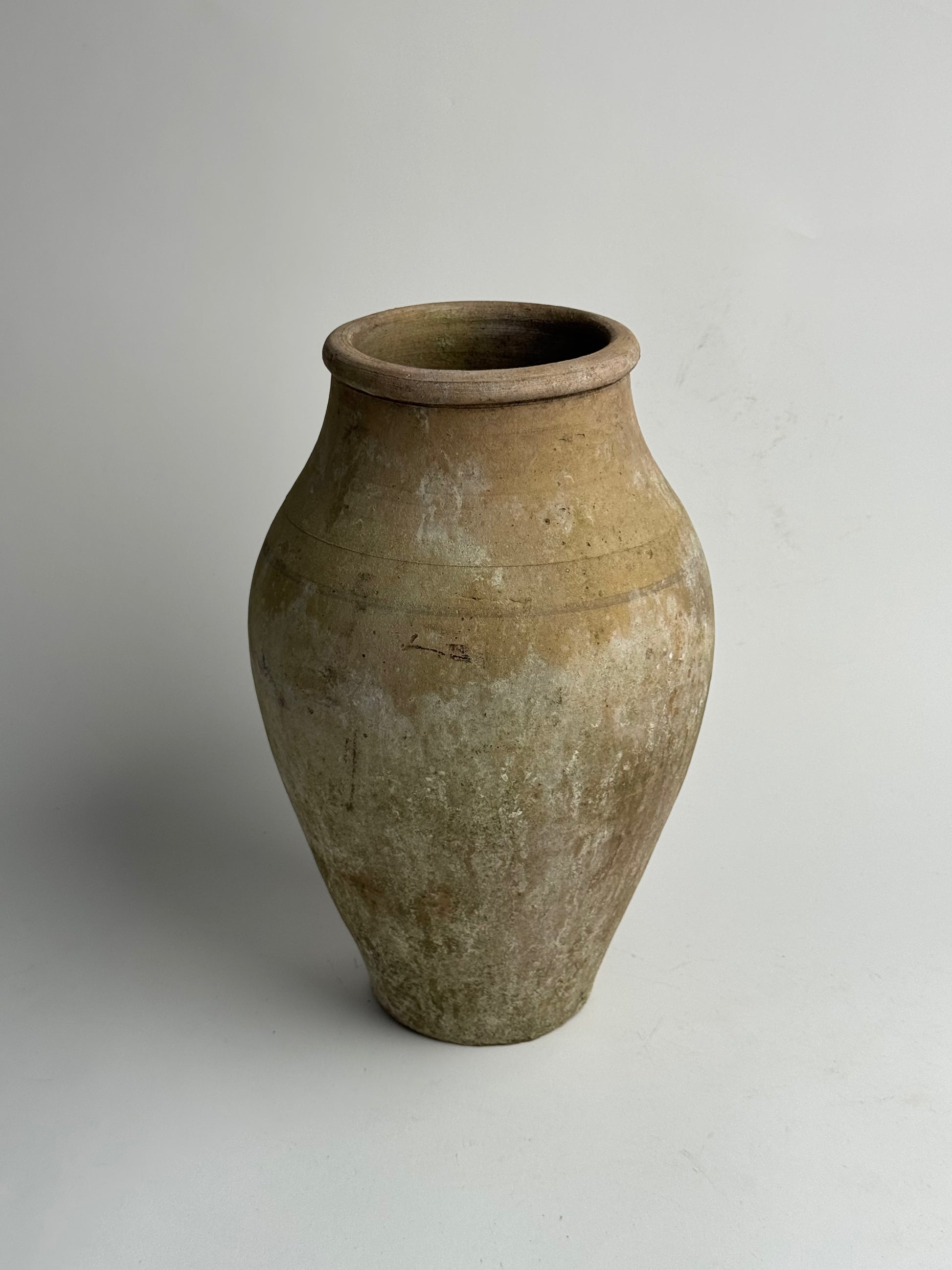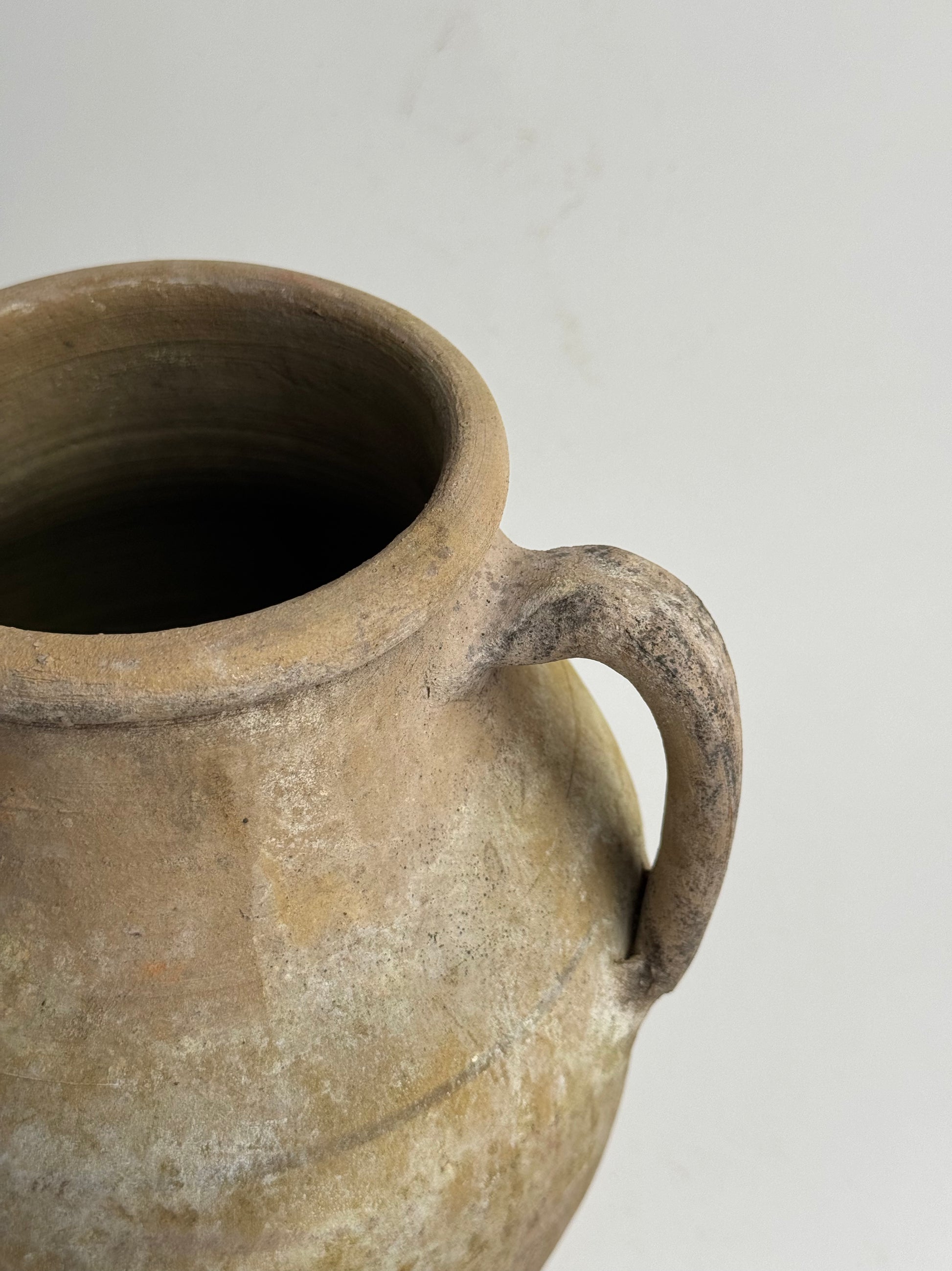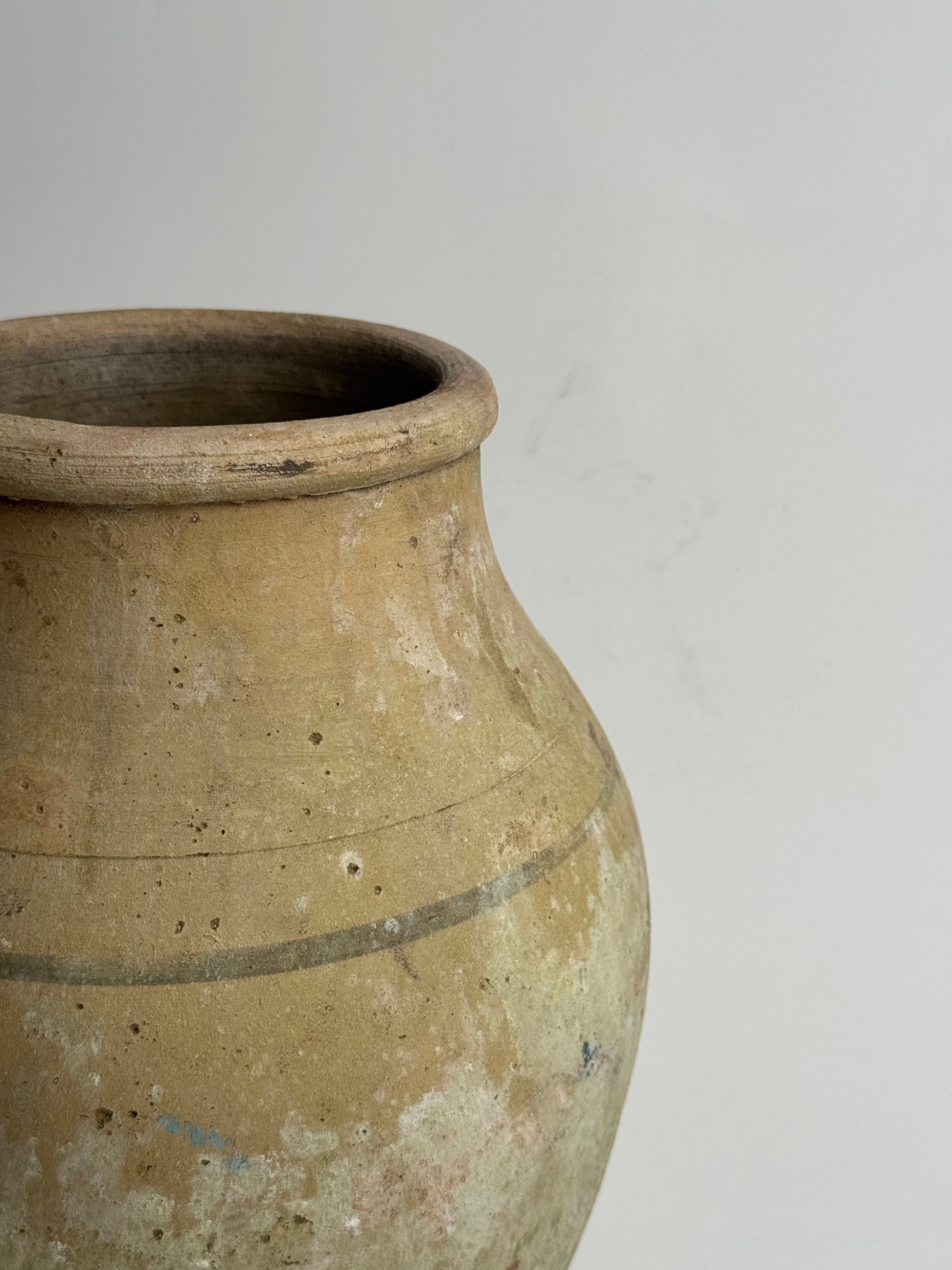 This large Turkish vessel, a traditional oil jug features a soft, sandy finish, a line detail around the wider point of the vessel and a single handle. Visible signs of wear and patina, a beautiful piece styled alone or with preserved olive for a Mediterranean look.
