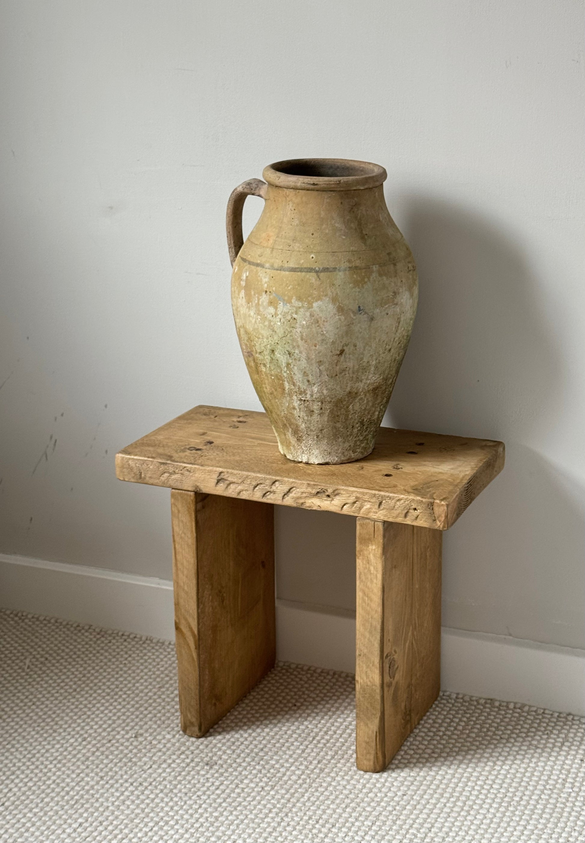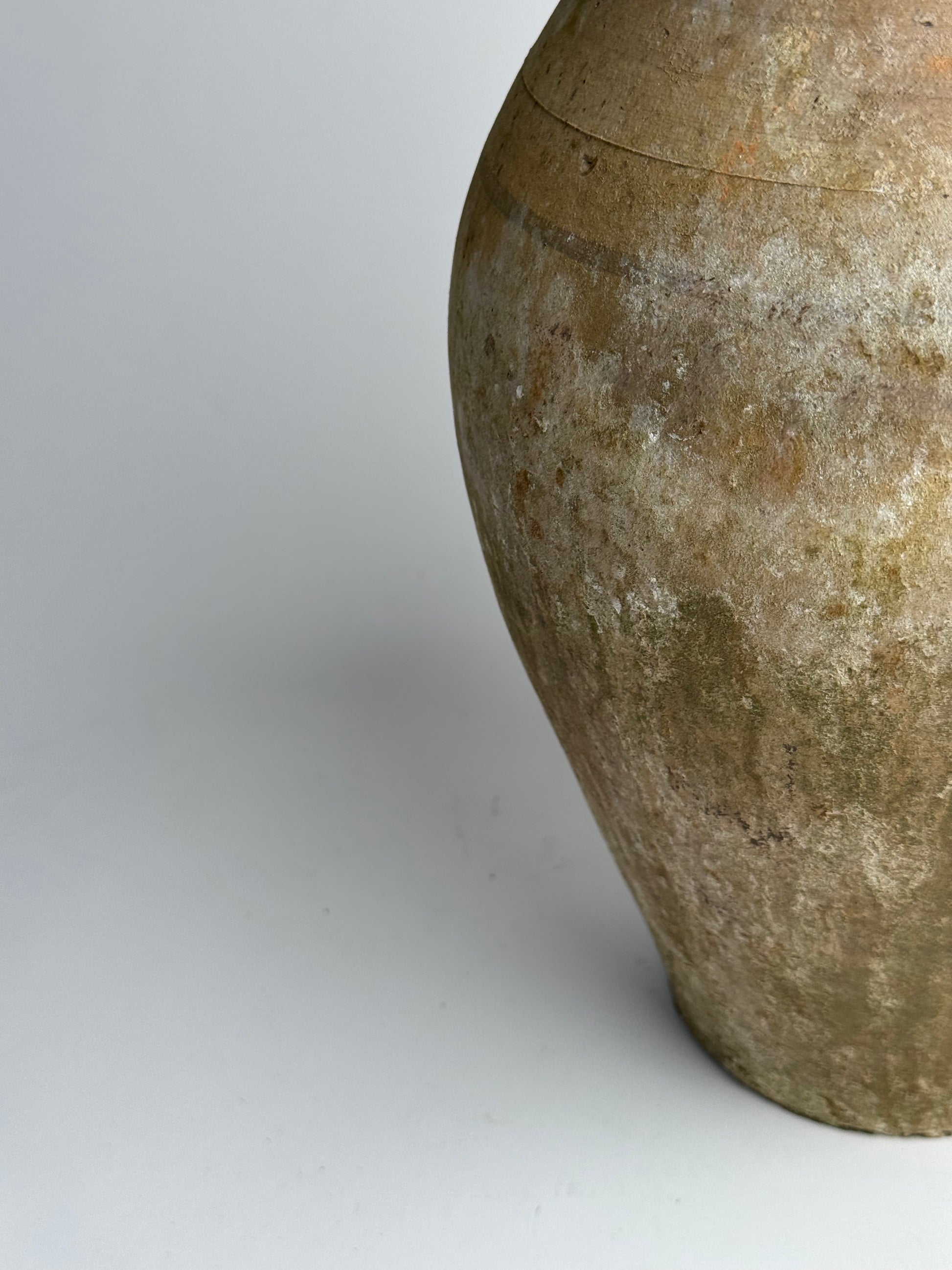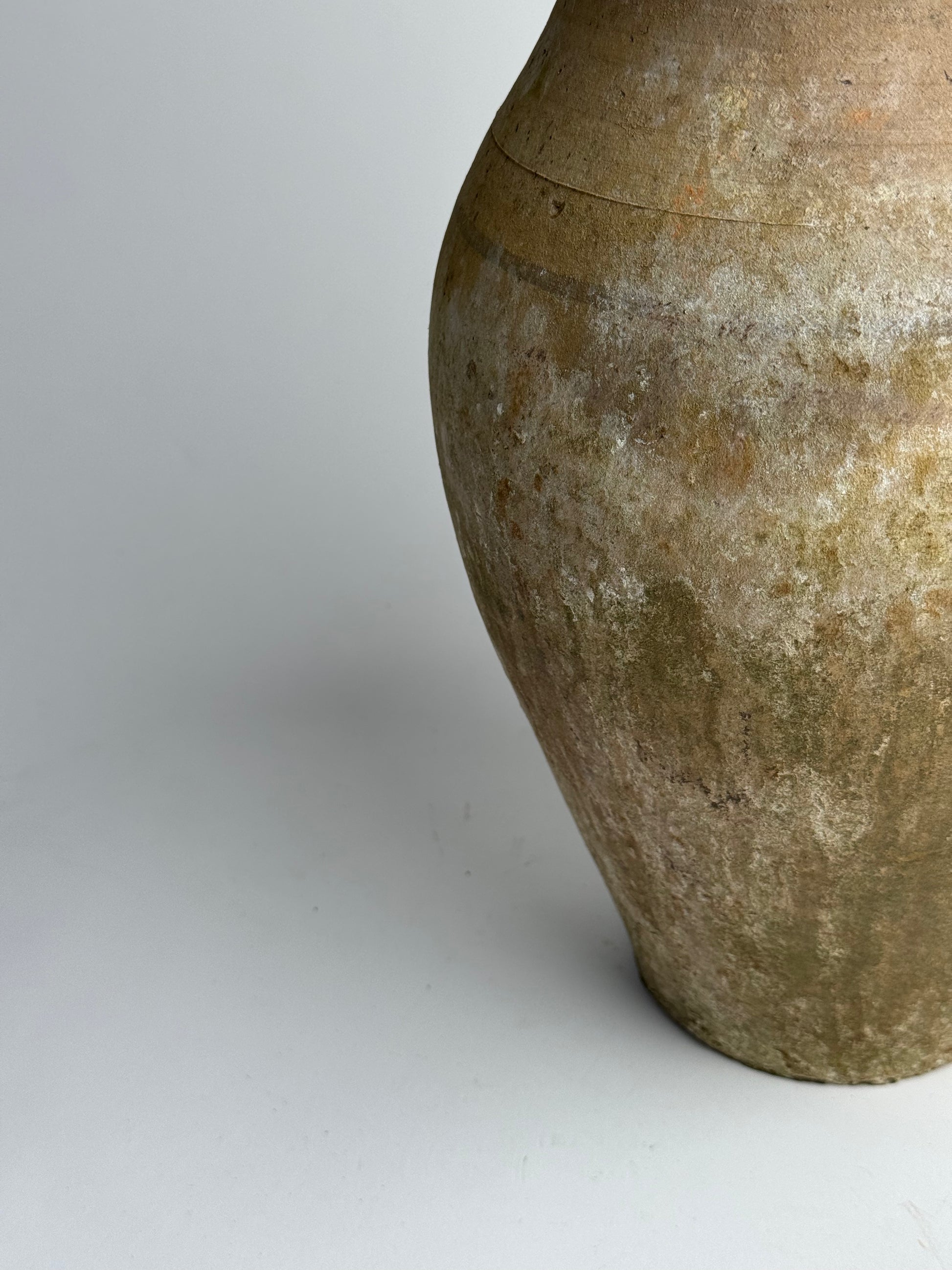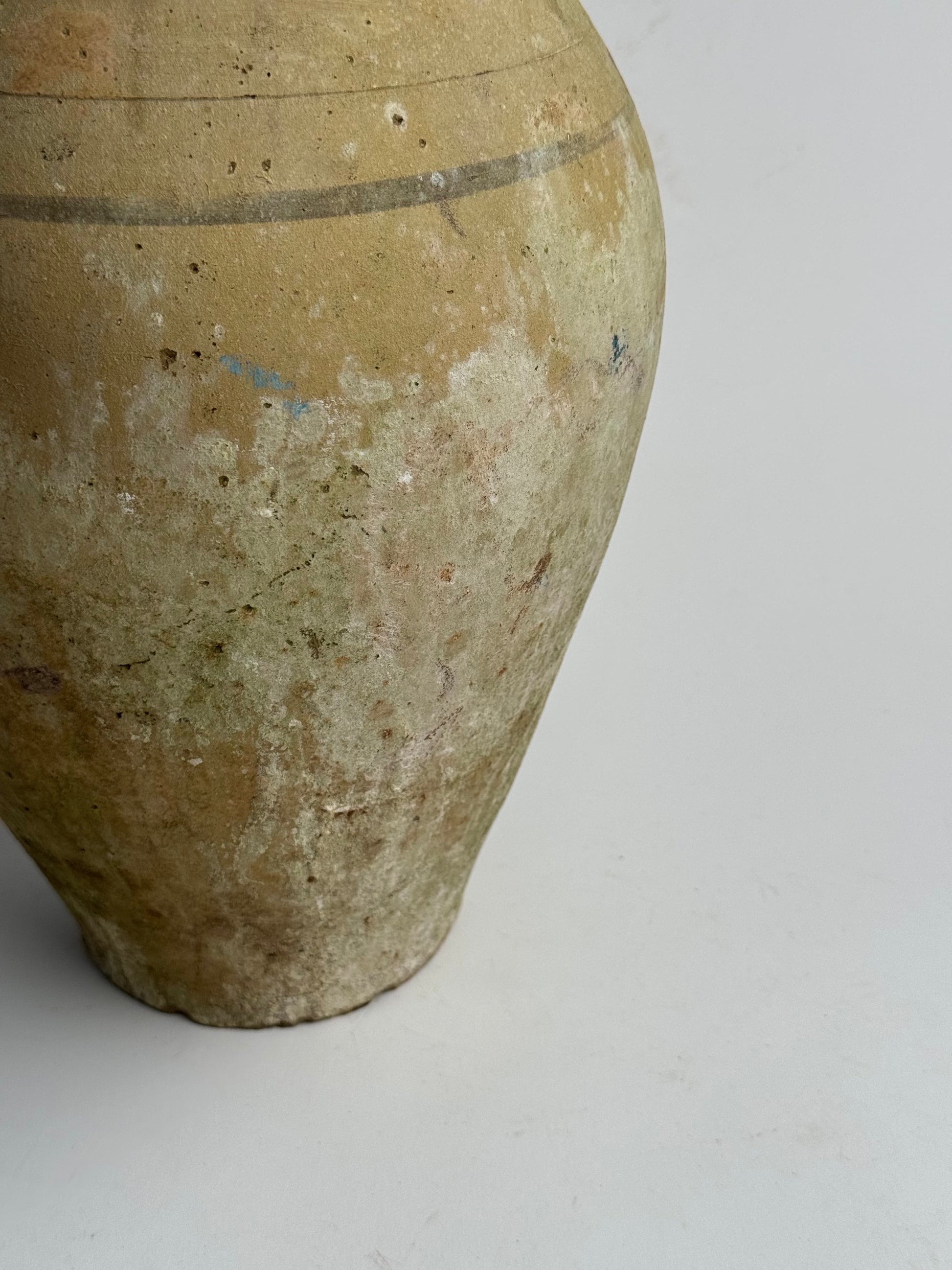 This large Turkish vessel, a traditional oil jug features a soft, sandy finish, a line detail around the wider point of the vessel and a single handle. Visible signs of wear and patina, a beautiful piece styled alone or with preserved olive for a Mediterranean look.