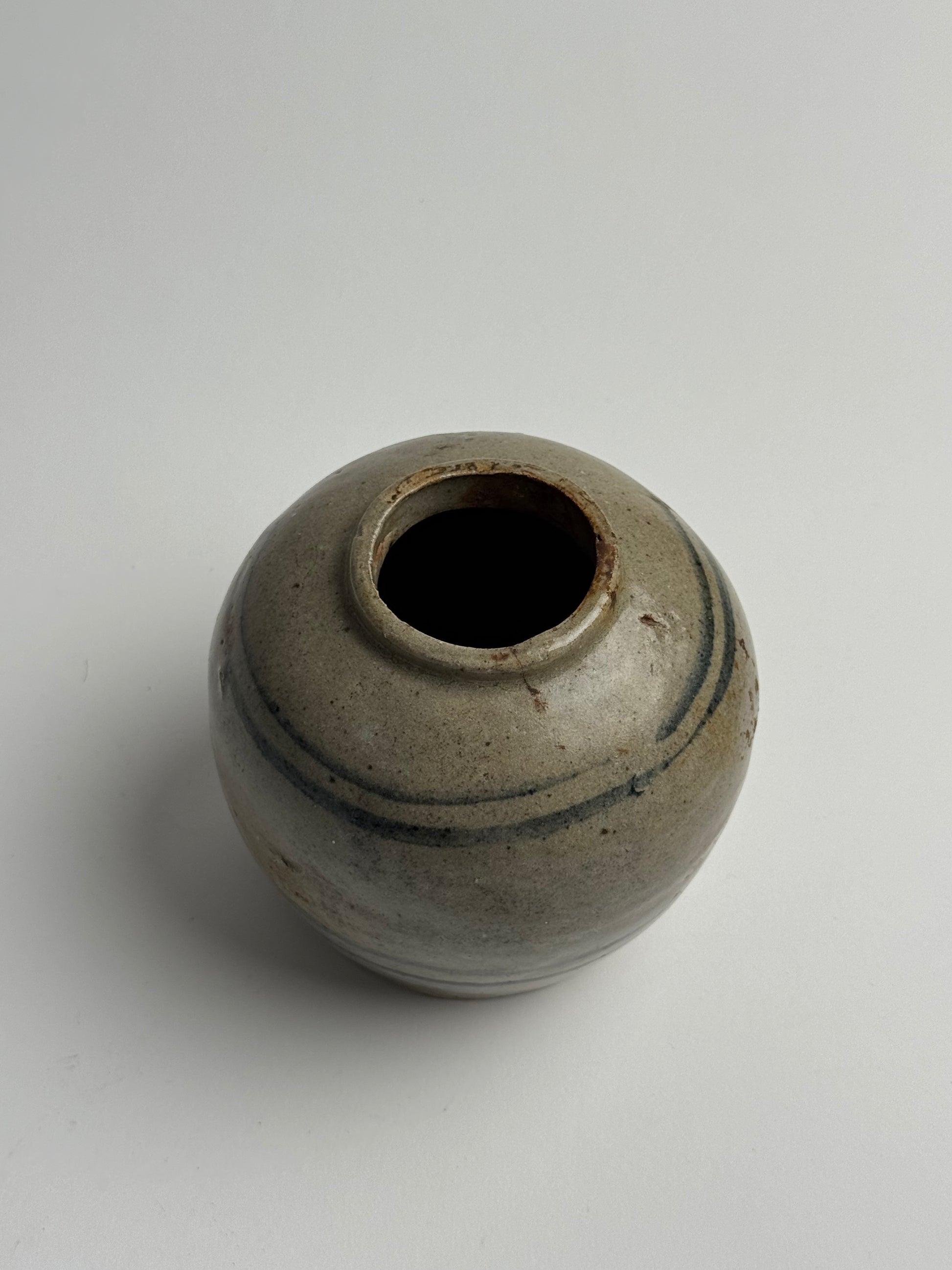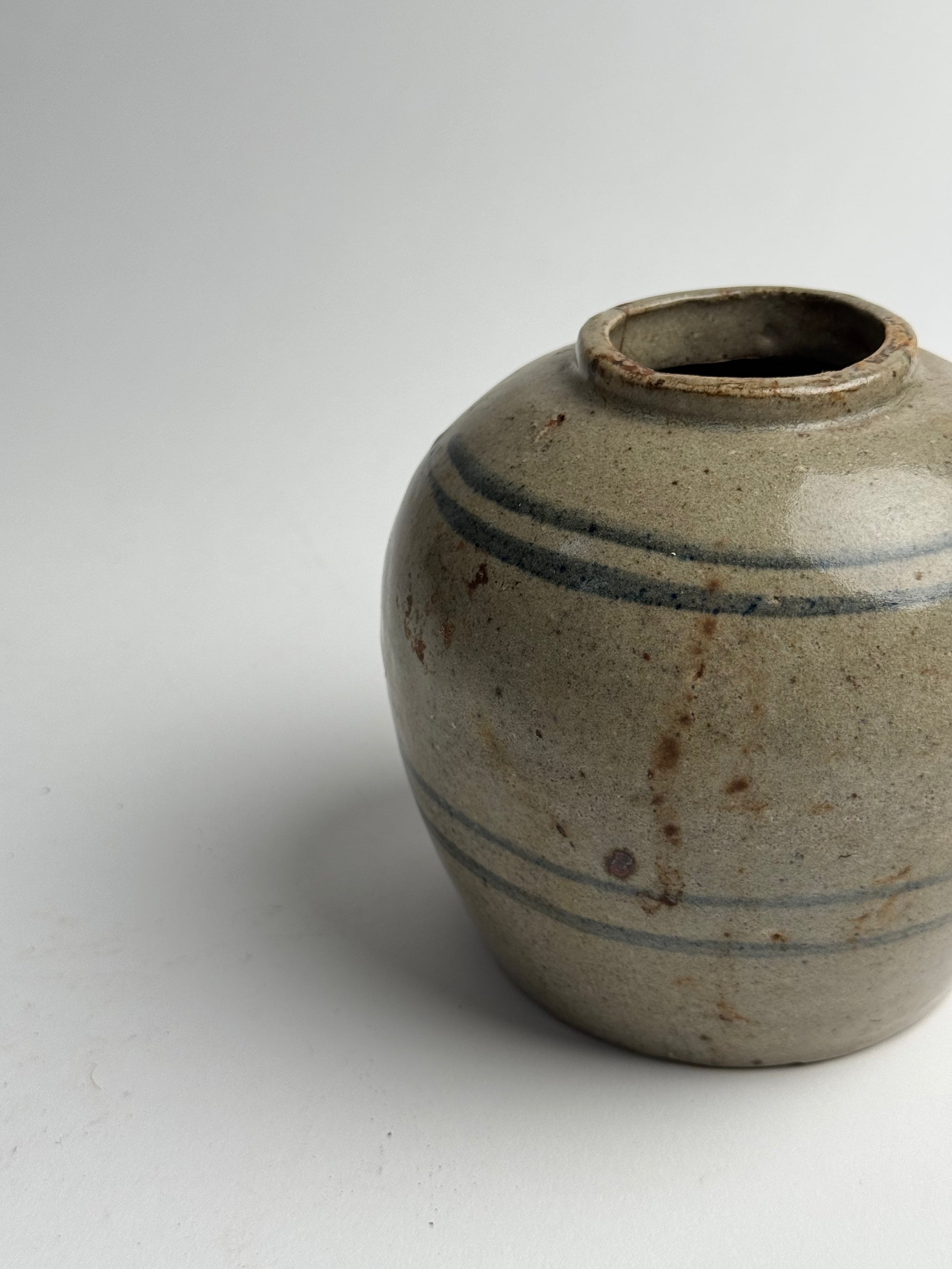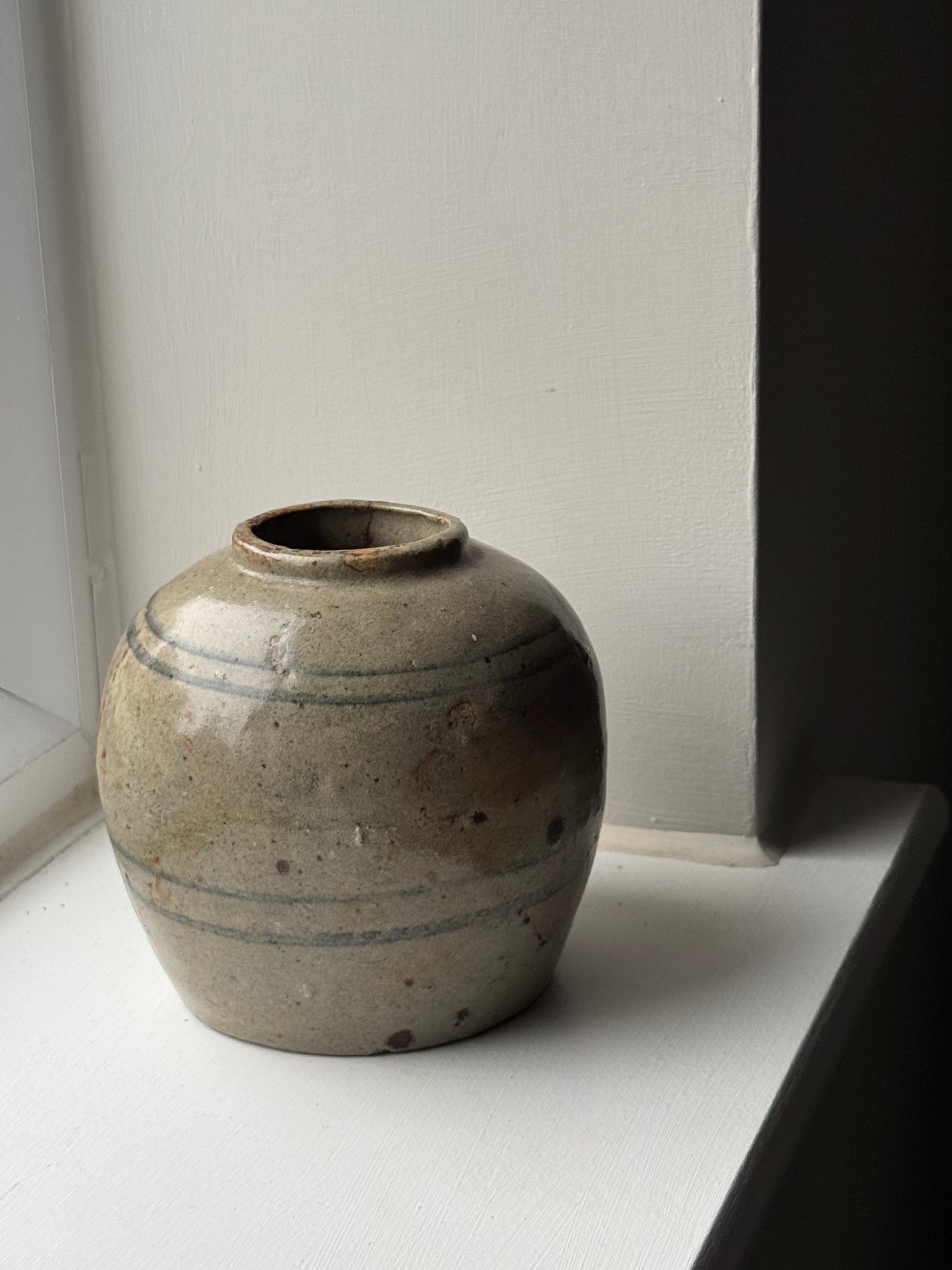 This antique ginger jar features line detailing in a muted blue. With its rounded form and visible signs of wear, this is a beautifully characterful piece, sure to bring charm to any home.