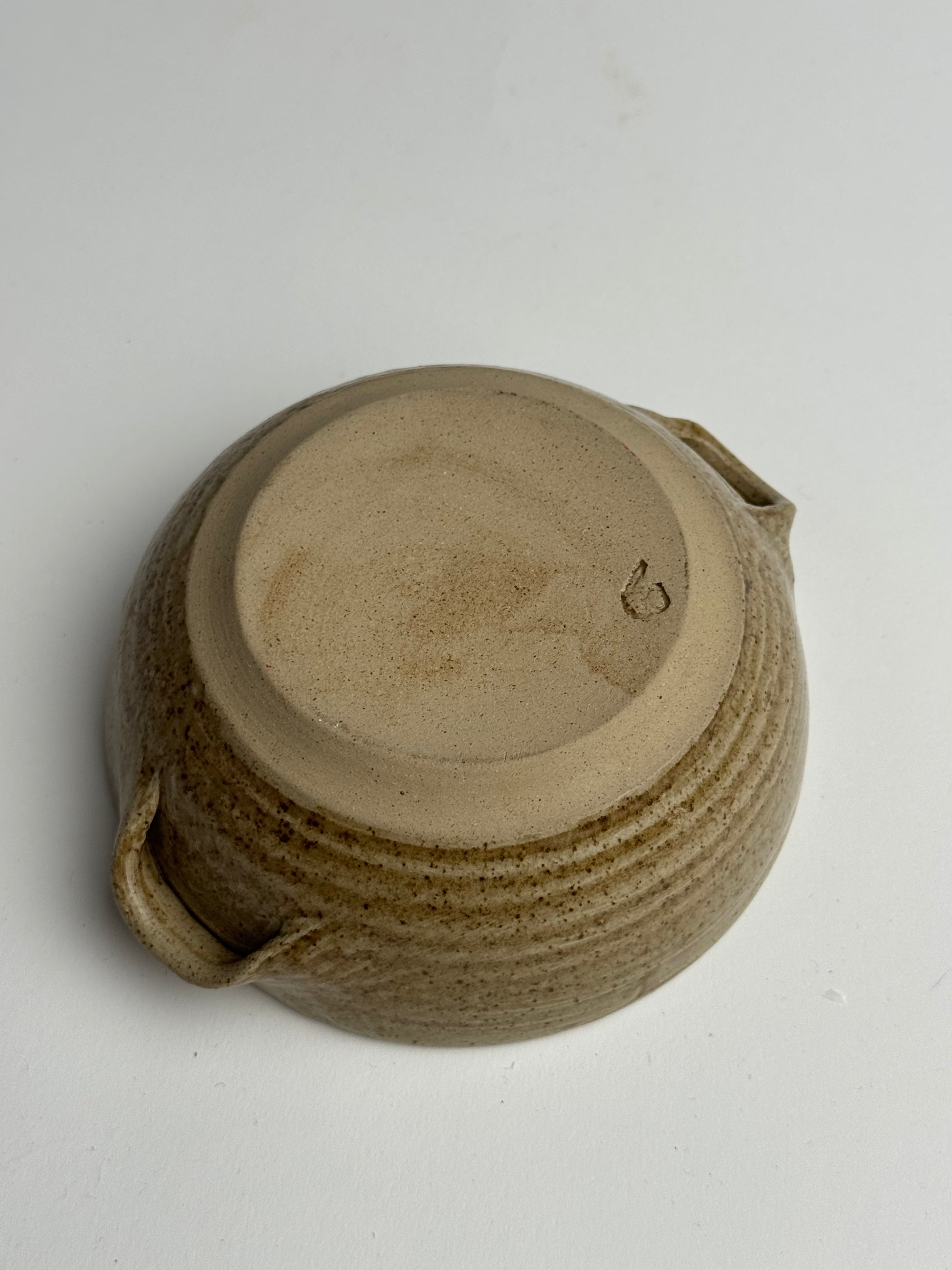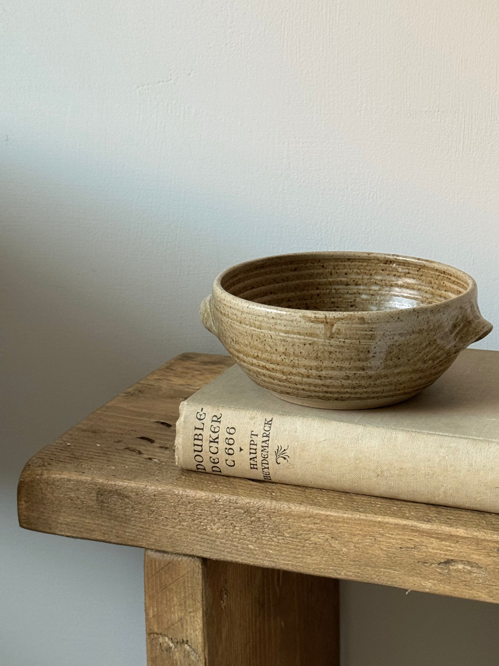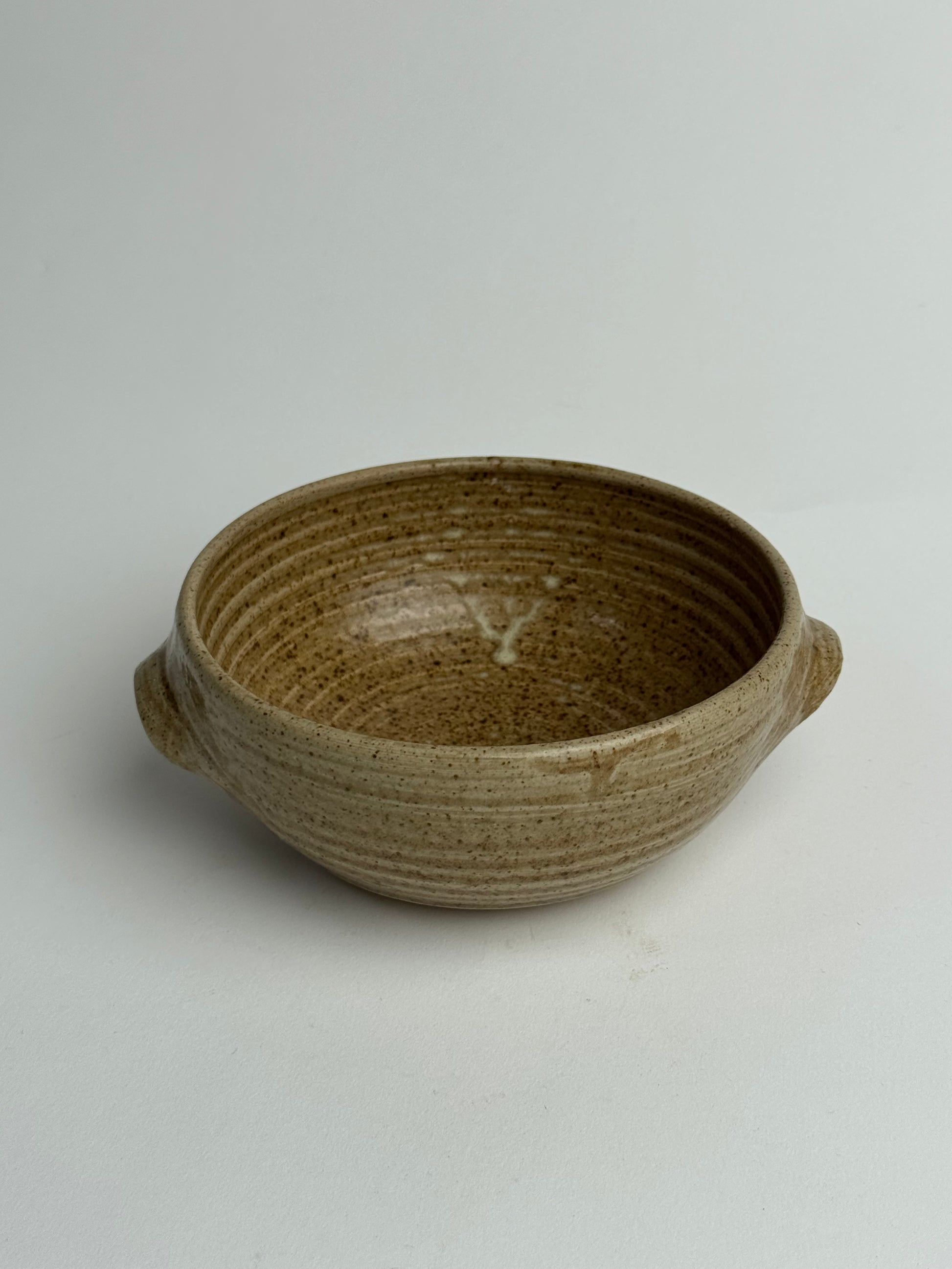 This low, rounded Vintage bowl features a warm beige finish with subtle mustard undertones, details of dripped glaze and two small ears. A perfect piece for styling on shelves and table-tops.