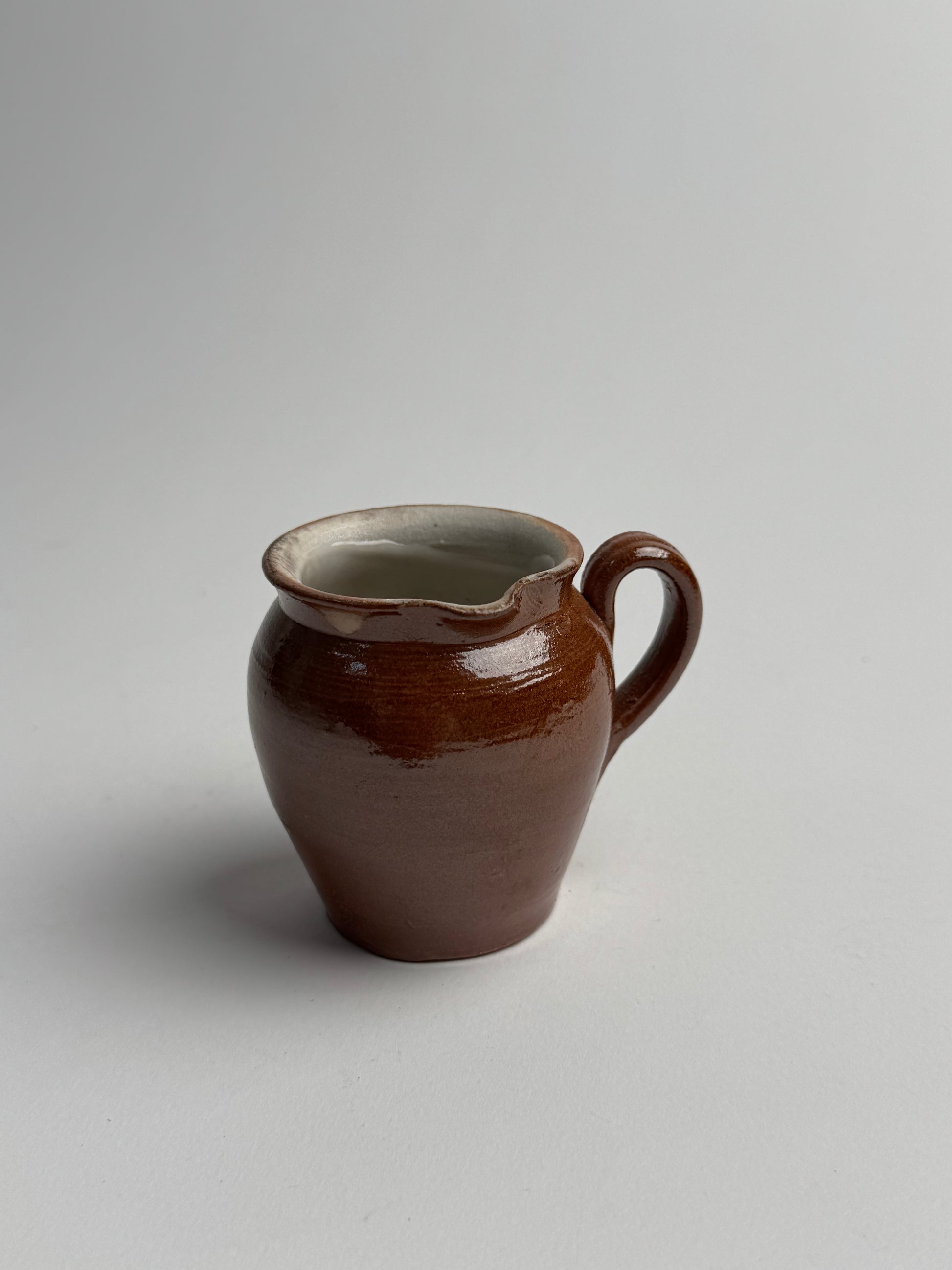 This miniature french jug features a rich brown glaze and a delicate shape. Perfect for shelf styling or staggering with different sized pottery.