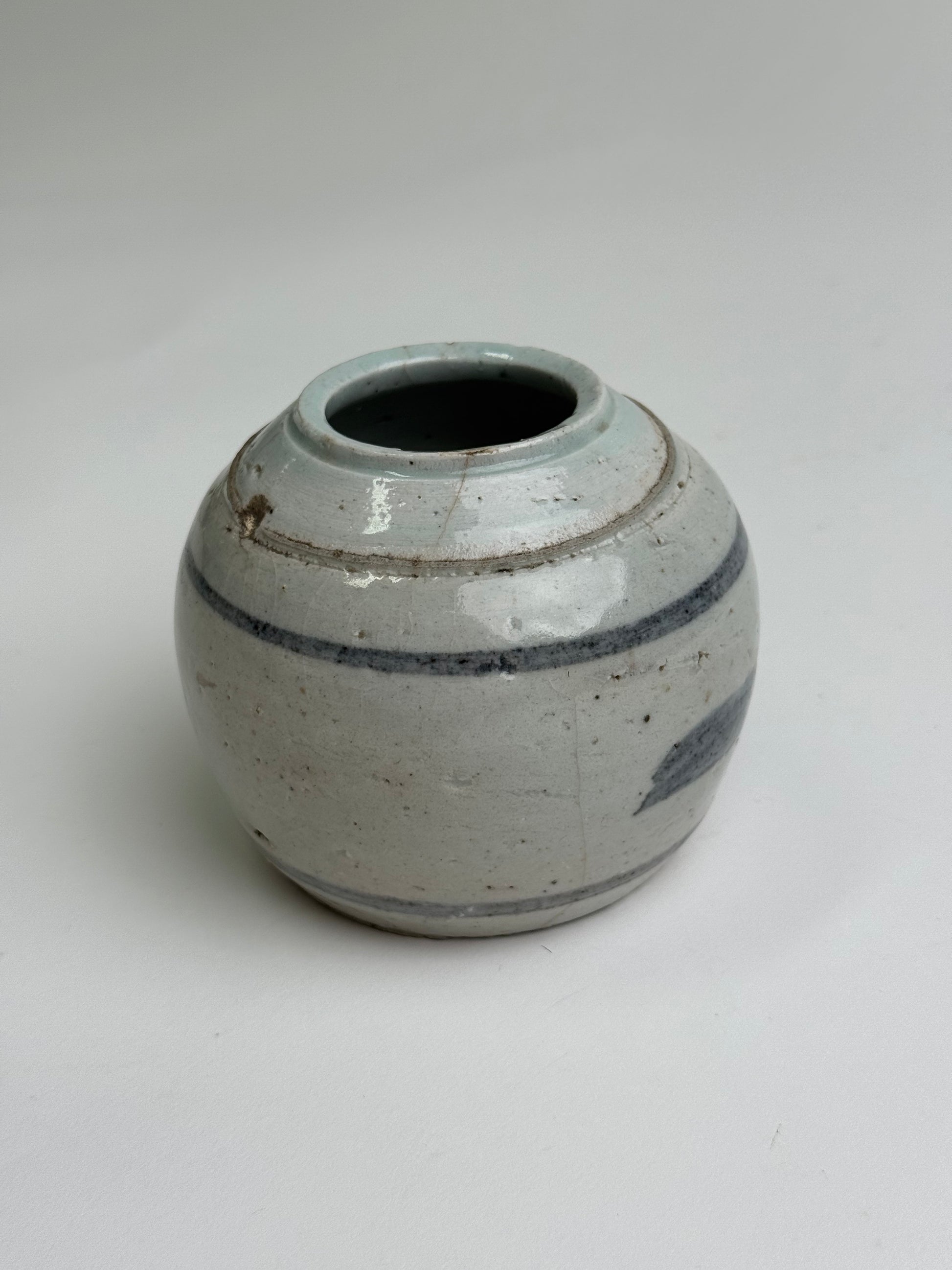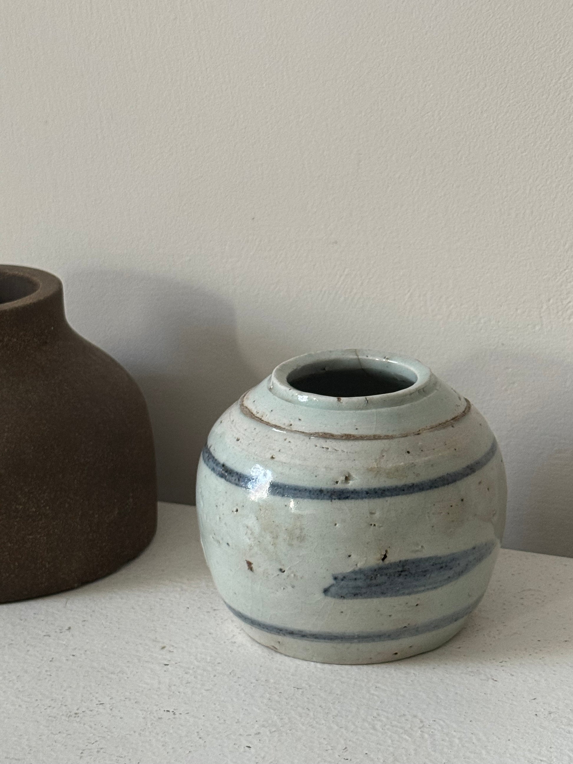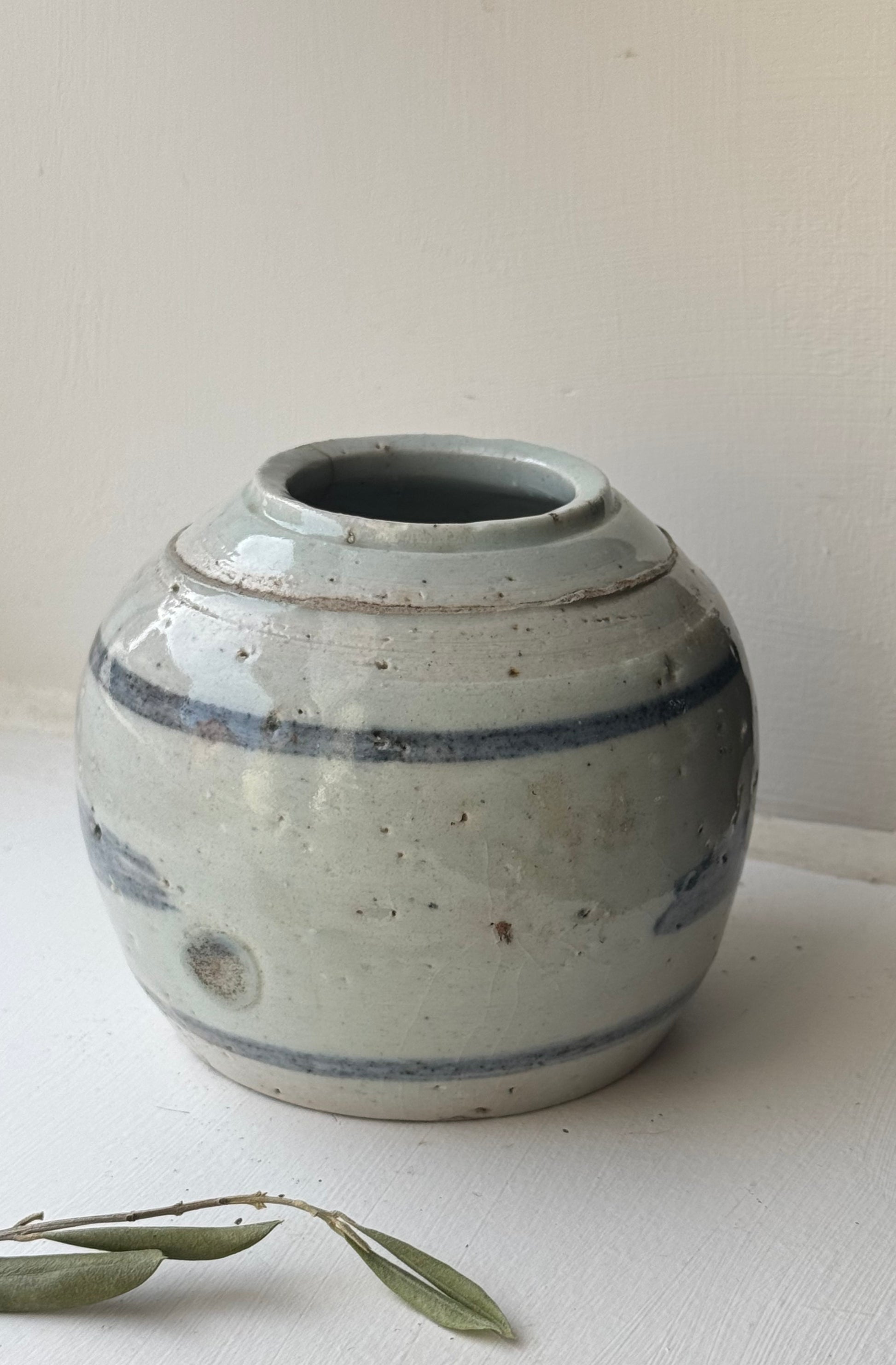 This antique ginger jar features a pale blue glaze with striking darker blue line detailing. A rounded form, perfect for styling on shelves.