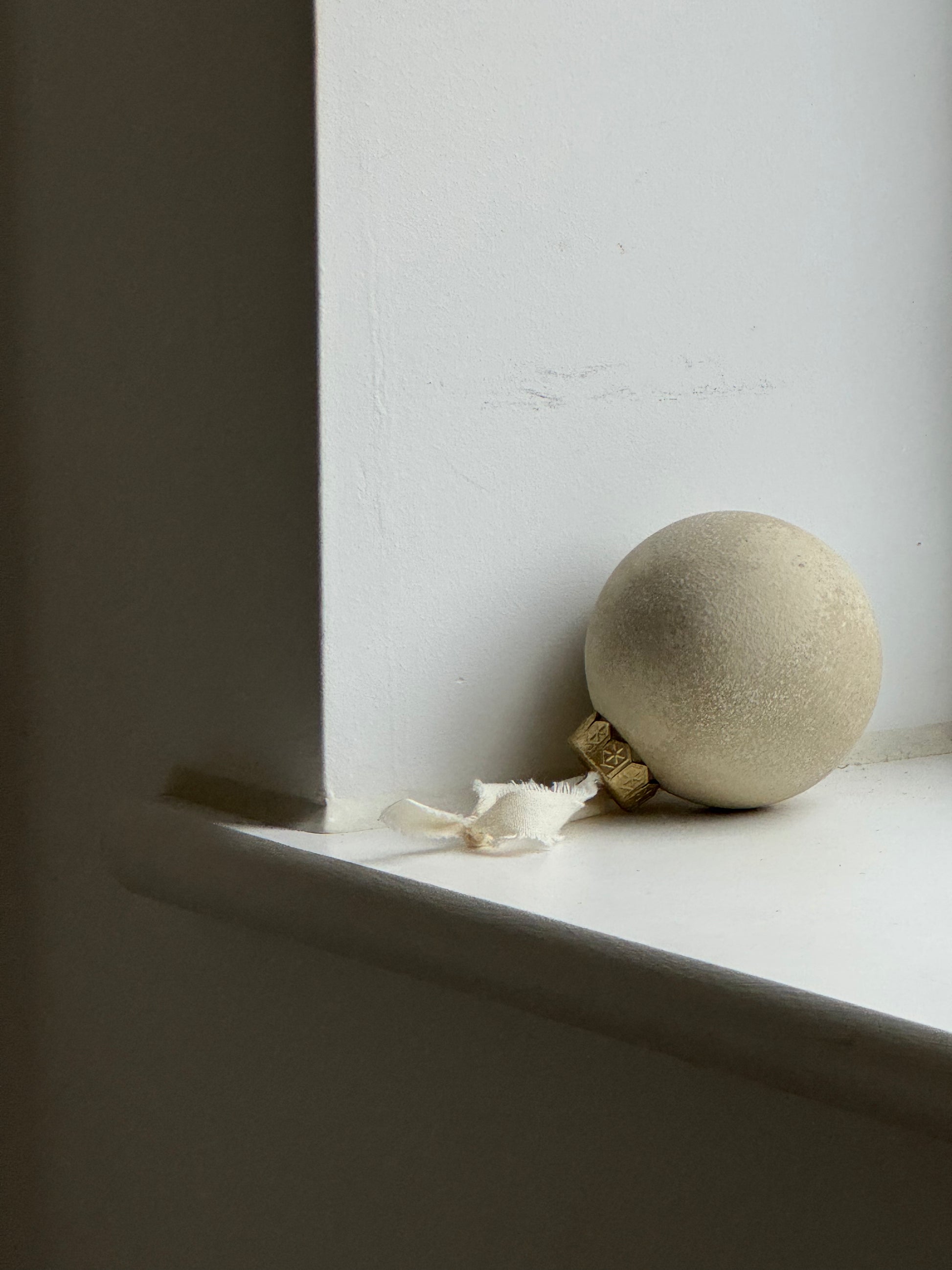 MADE TO ORDER Neutral hand up-cycled bauble finished in a light beige stone-effect, hung with an ivory linen ribbon. Shatterproof and light-weight.