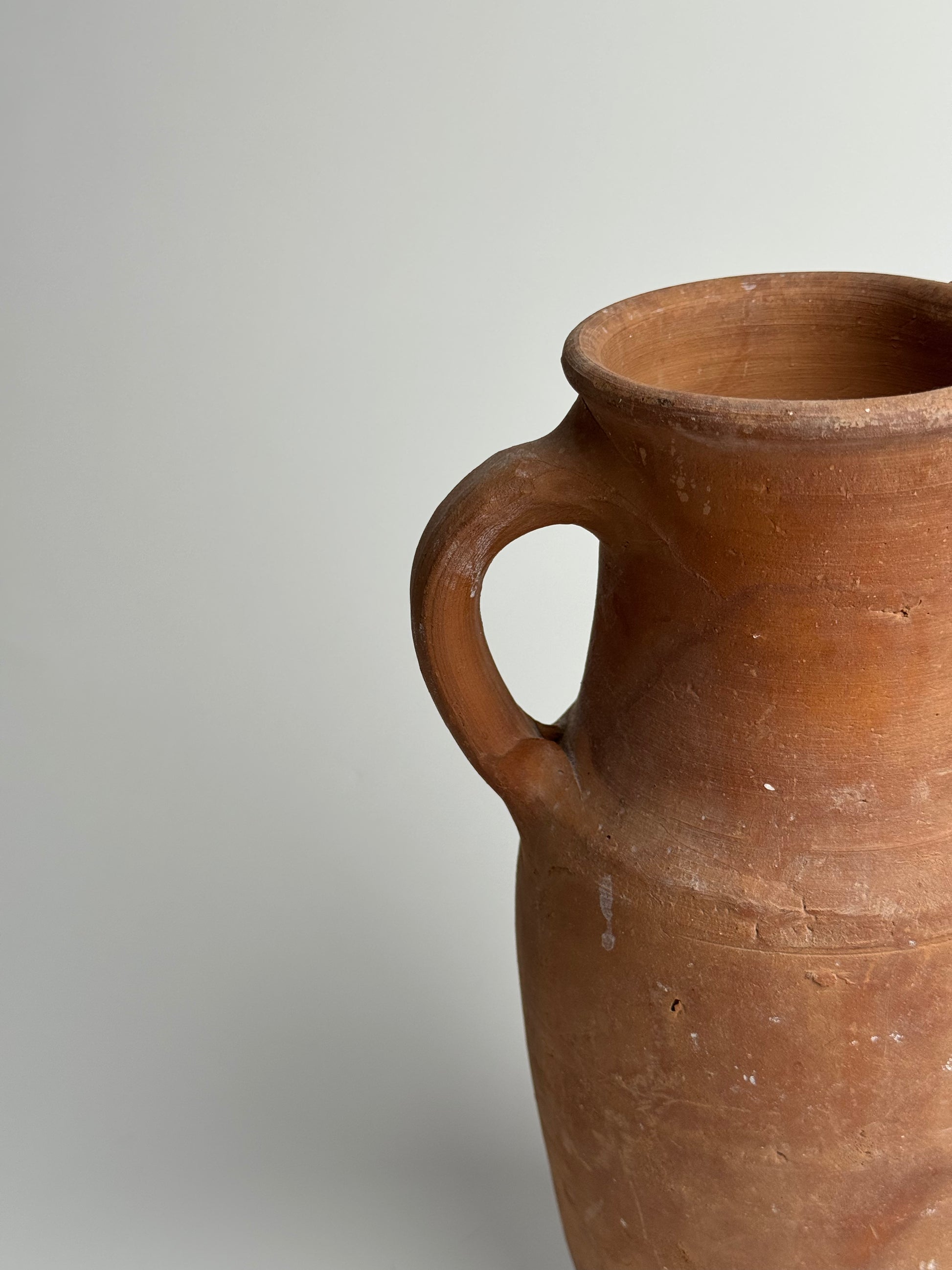 This slim terracotta jug features a small handle detail and subtle chalky patina, adding to the elegance and character of the piece. Style alone or with dried stems for a farmhouse look.