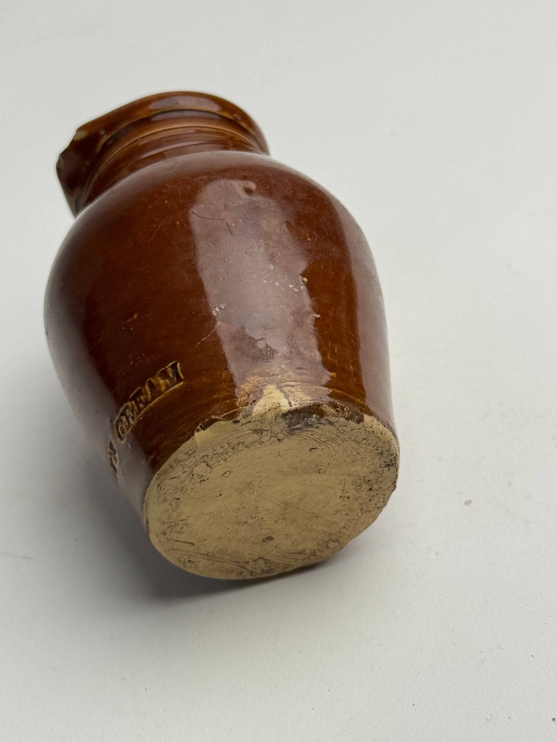 This small Vintage jug features a rich, warm brown glaze and a line detail just below the opening. A perfect piece for either styling alone or with a few sprigs for a farmhouse look. Small chip at the opening of the jug (see images)