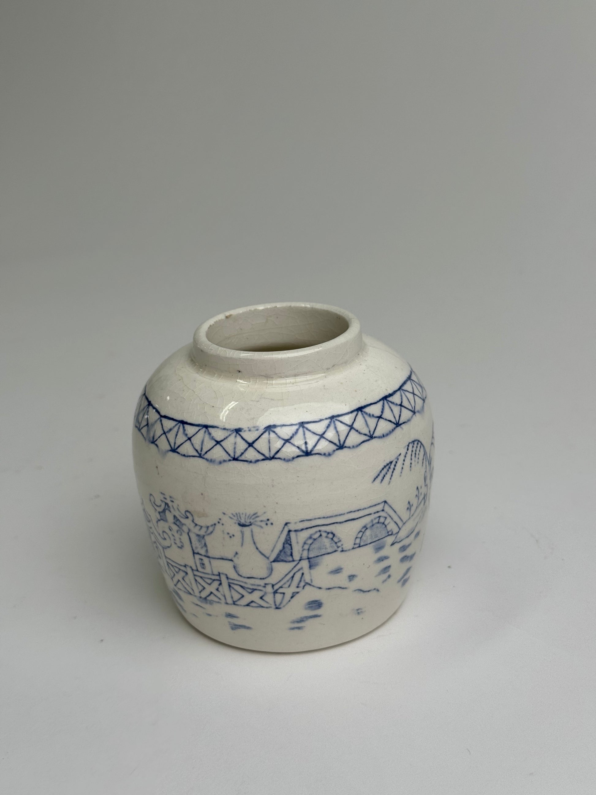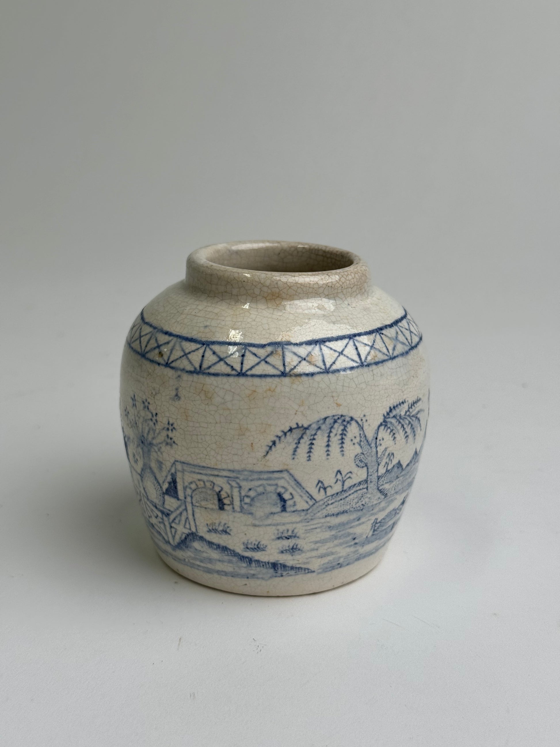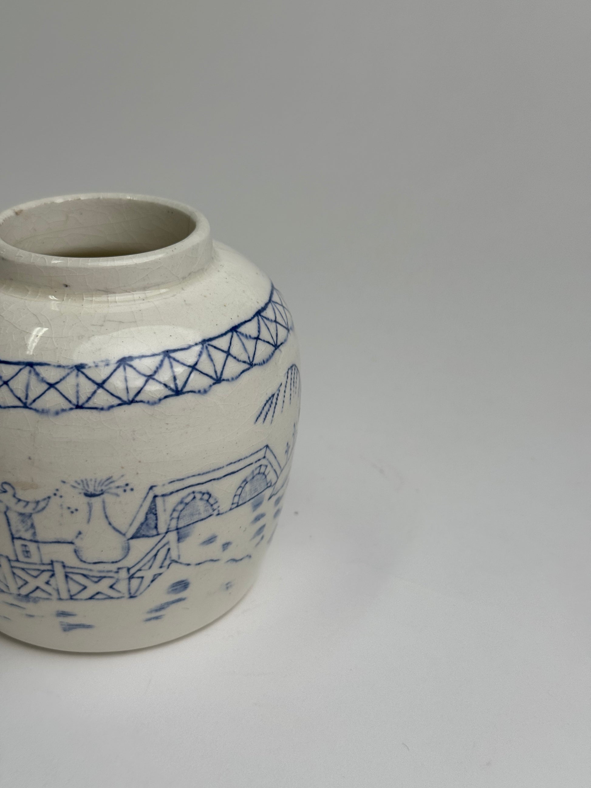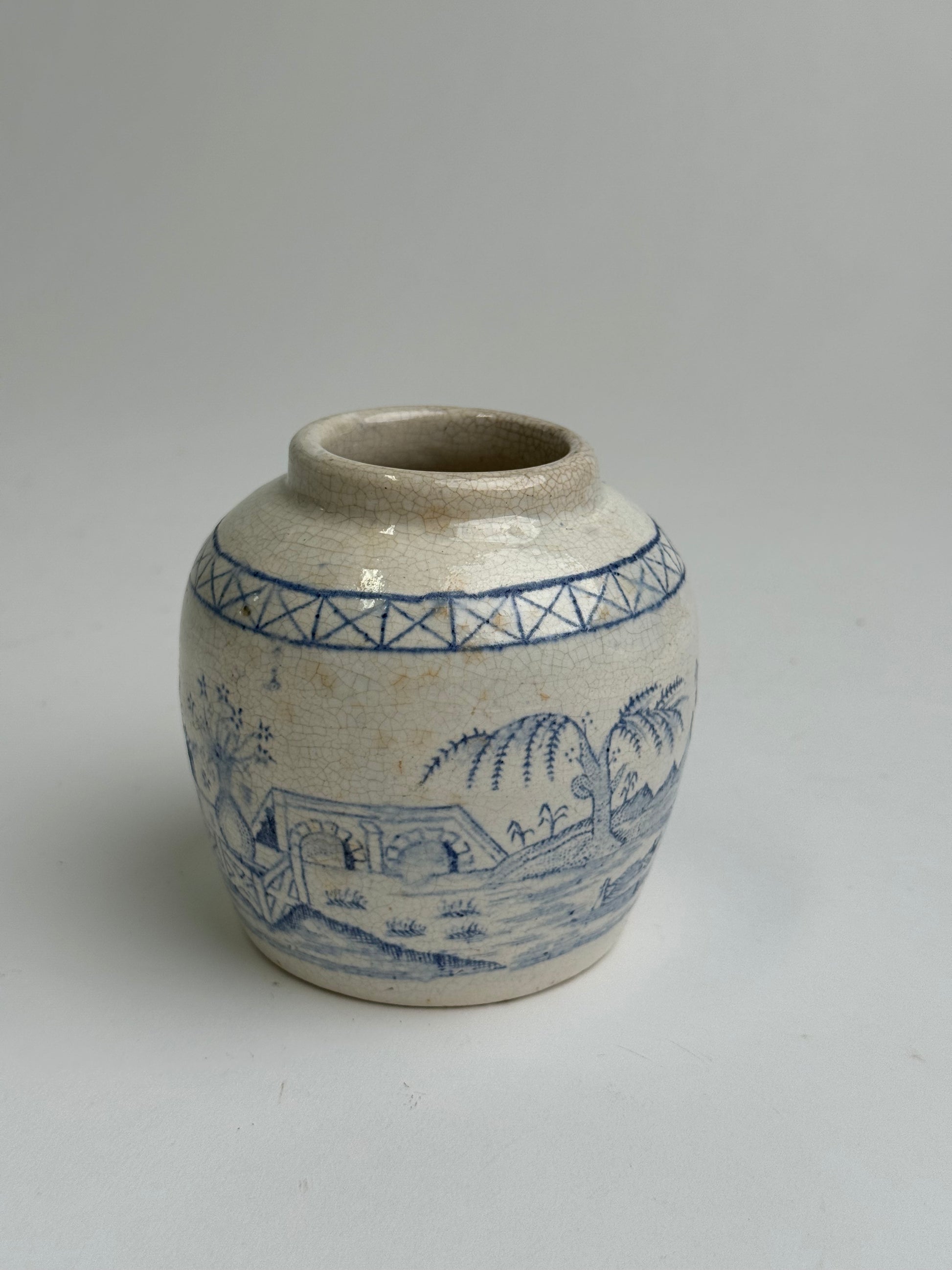 These small vintage chinese ginger jars feature traditional blue detailing & subtle signs of wear, showing the age of the pot and adding timeless character. 2 available. 1 features a crisp white glaze, the other features an off-white glaze with cracked detailing.