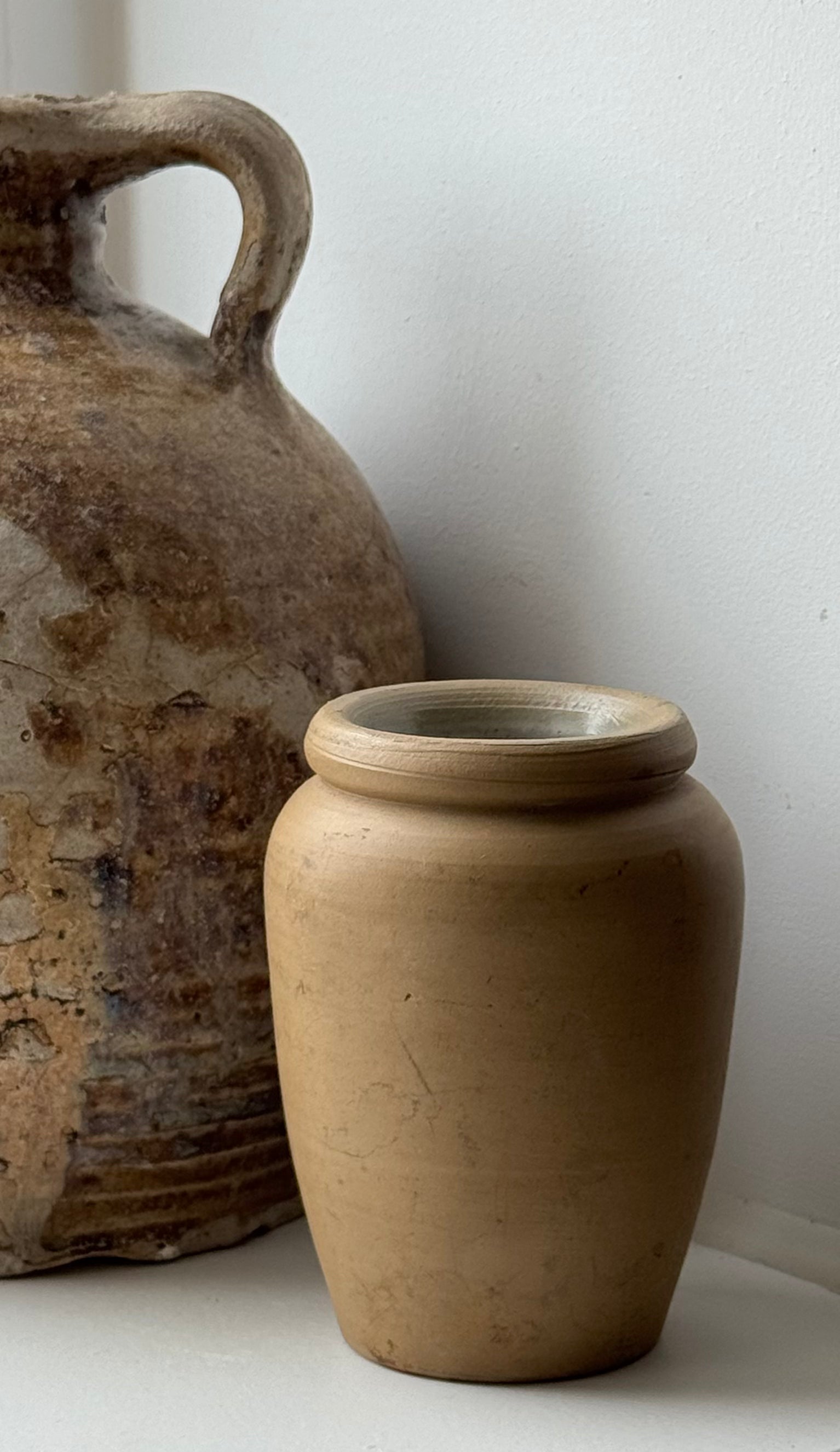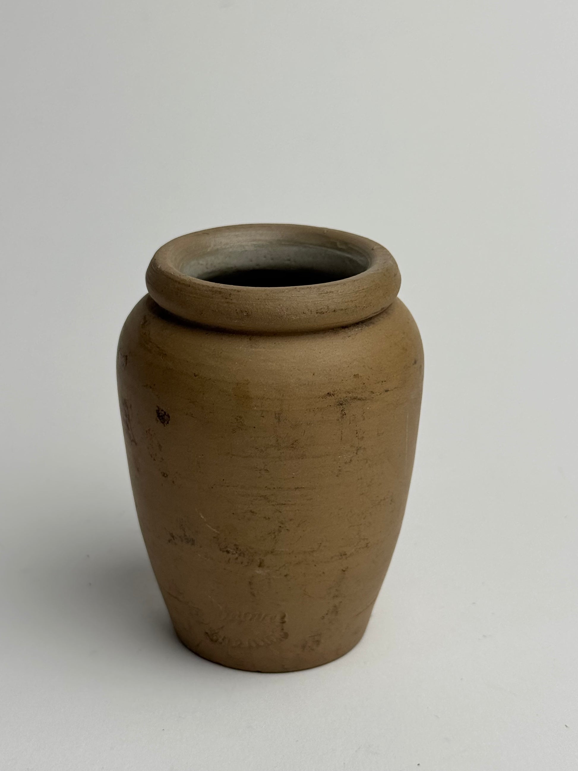 This small Vintage cream pot features a soft matte caramel-brown finish with small signs of wear. A perfect mini piece for styling on shelves/table-tops.
