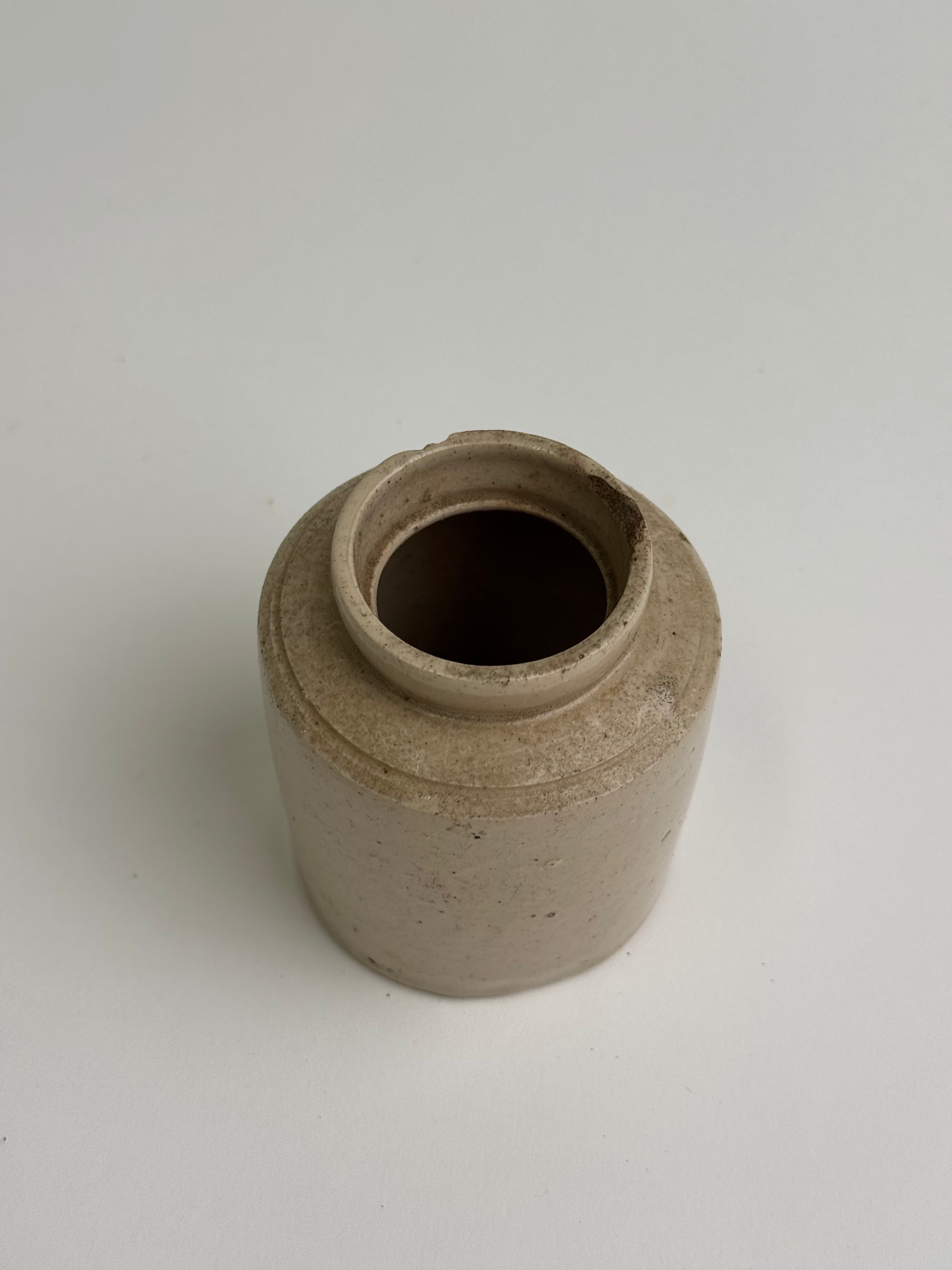 This small stoneware pot features an oatmeal glaze and some subtle signs of wear. Style on shelves for a timeless, vintage feel.