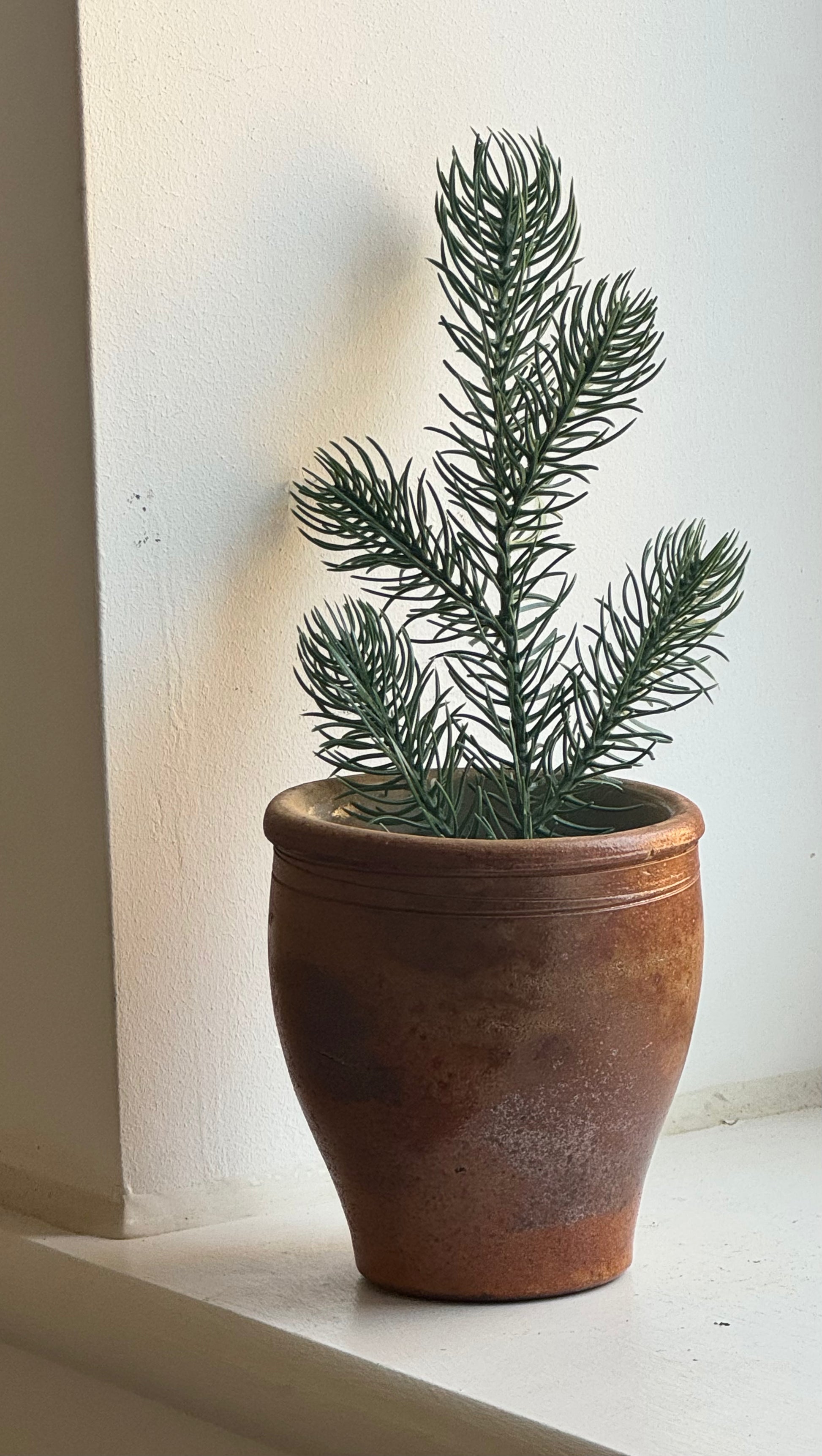 This small vintage tapered pot features a warm amber-brown glaze and a subtle line detail around the opening. The inside base of the pot features ink staining, predominantly blue and purple tones.