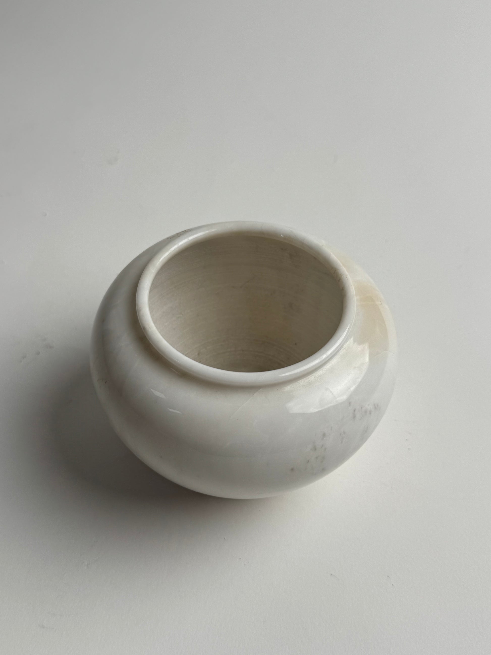 A Vintage marble pot with a white base colour and subtle beige and neutral veining throughout, a beautiful piece for styling.