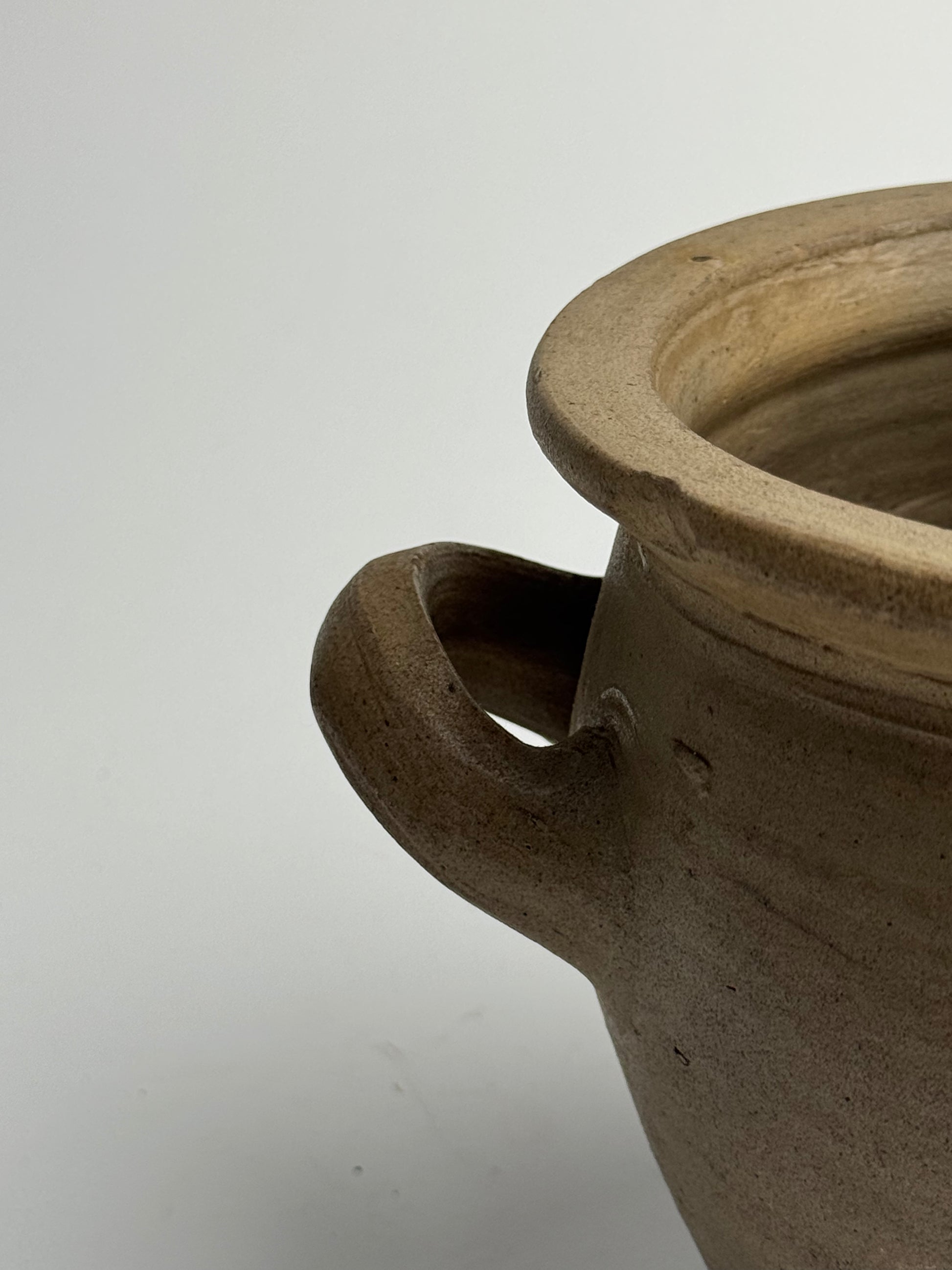 This soft brown French pot features a low, wide stature with twin handles. A lovely rustic piece, perfect for farmhouse inspired interiors or simply lovers of timeless decor!