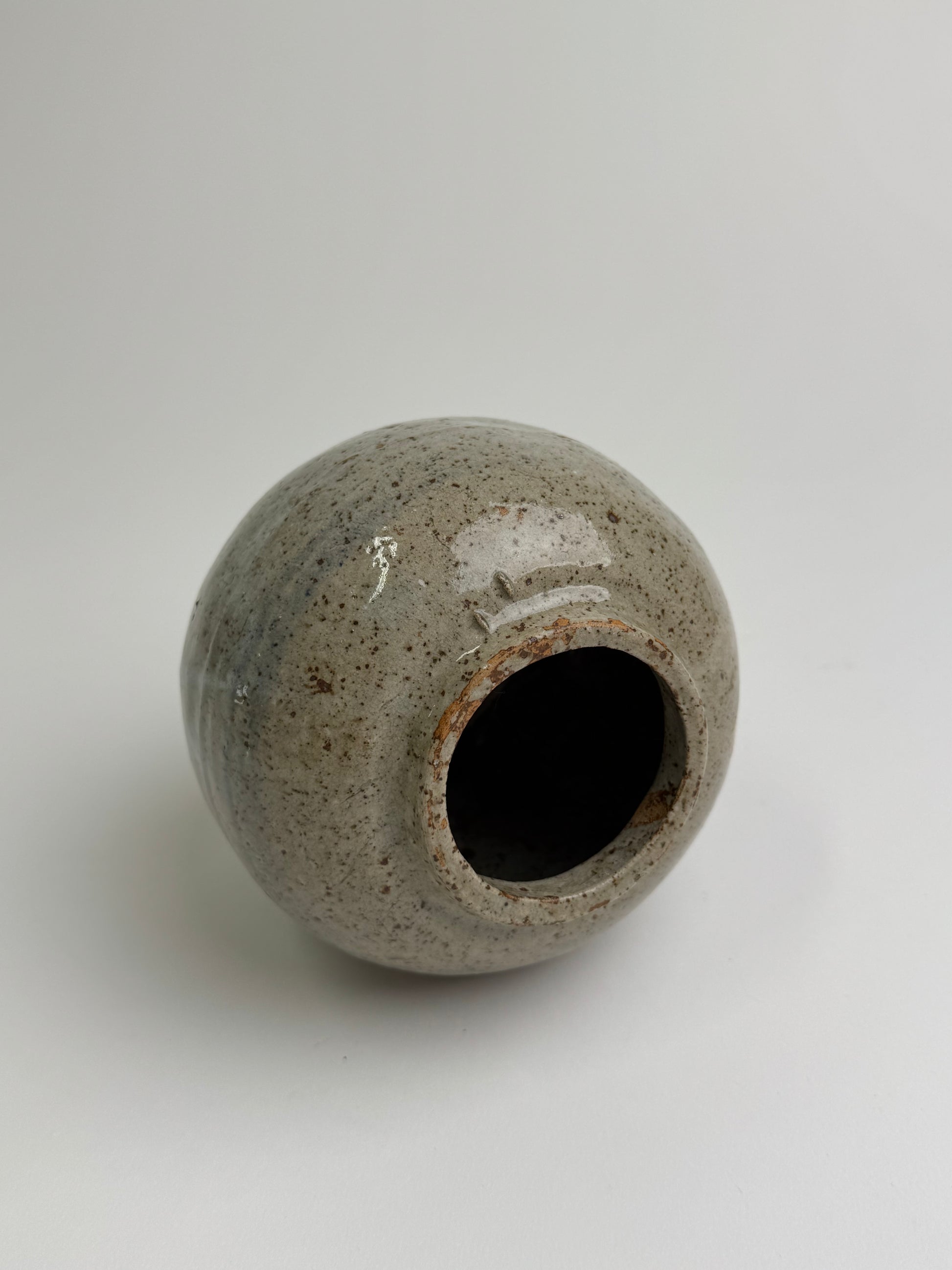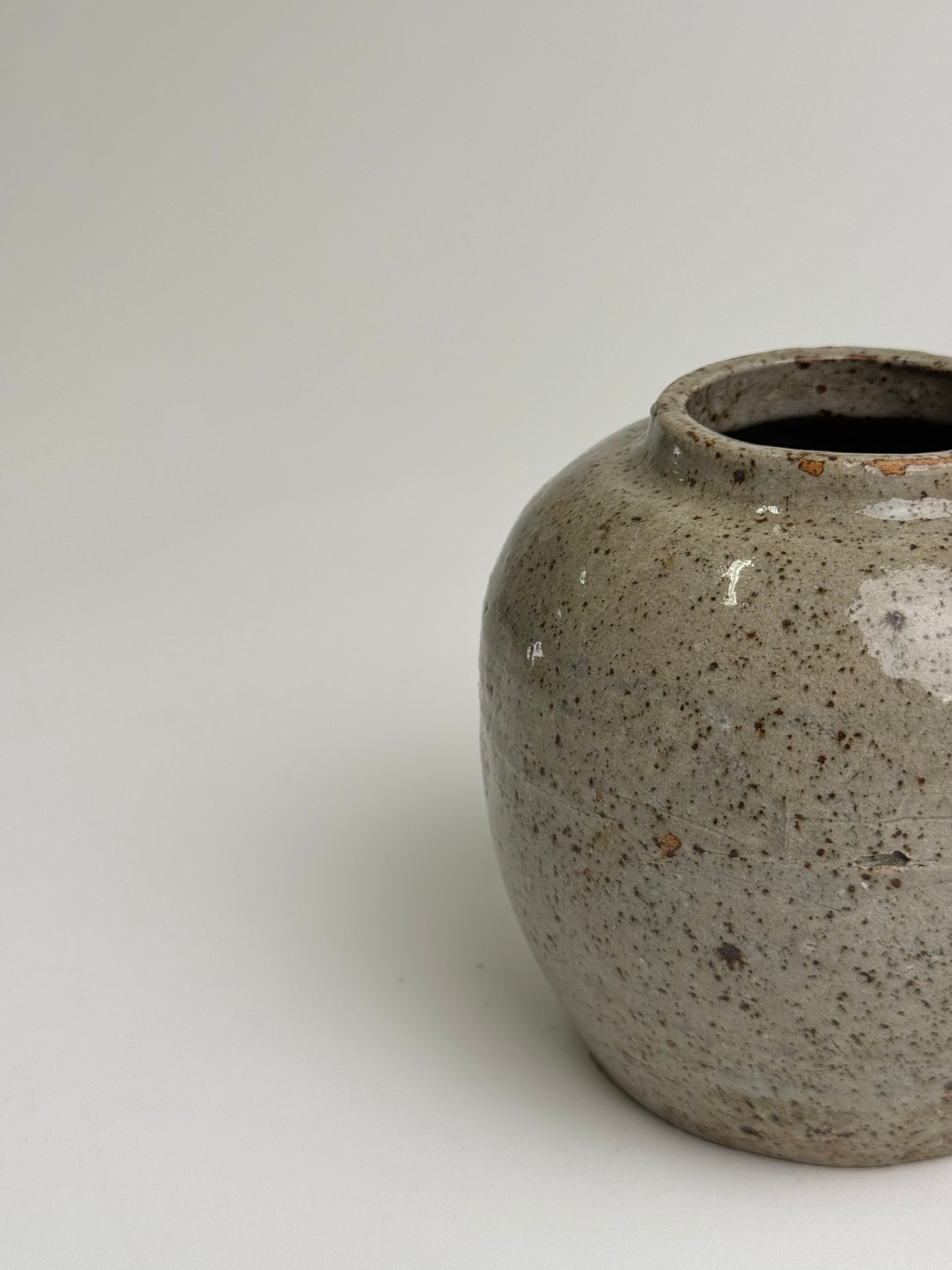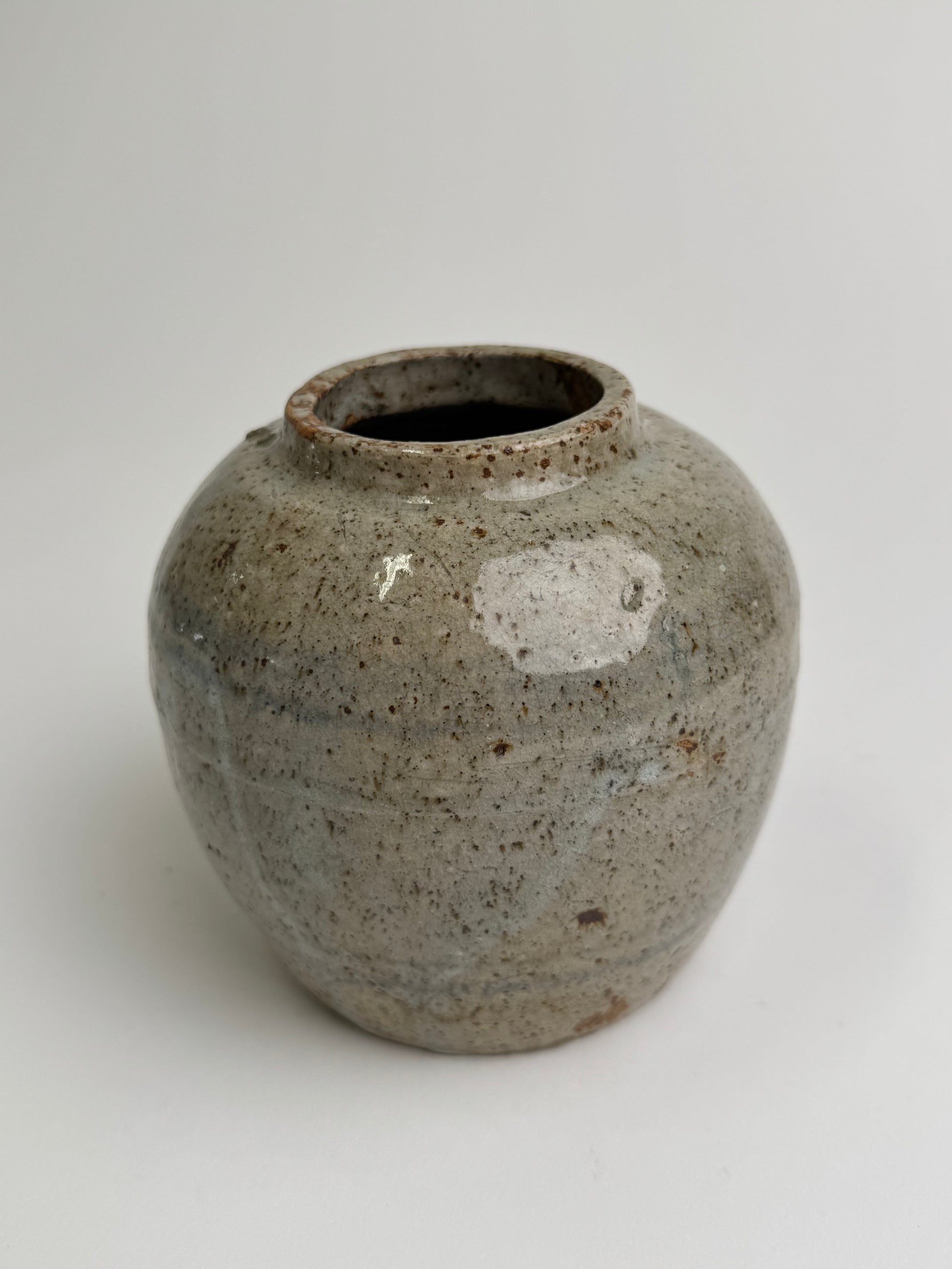 This antique ginger jar features a speckled glaze and subtle line detailing. A beautiful quality piece with muted green undertones.