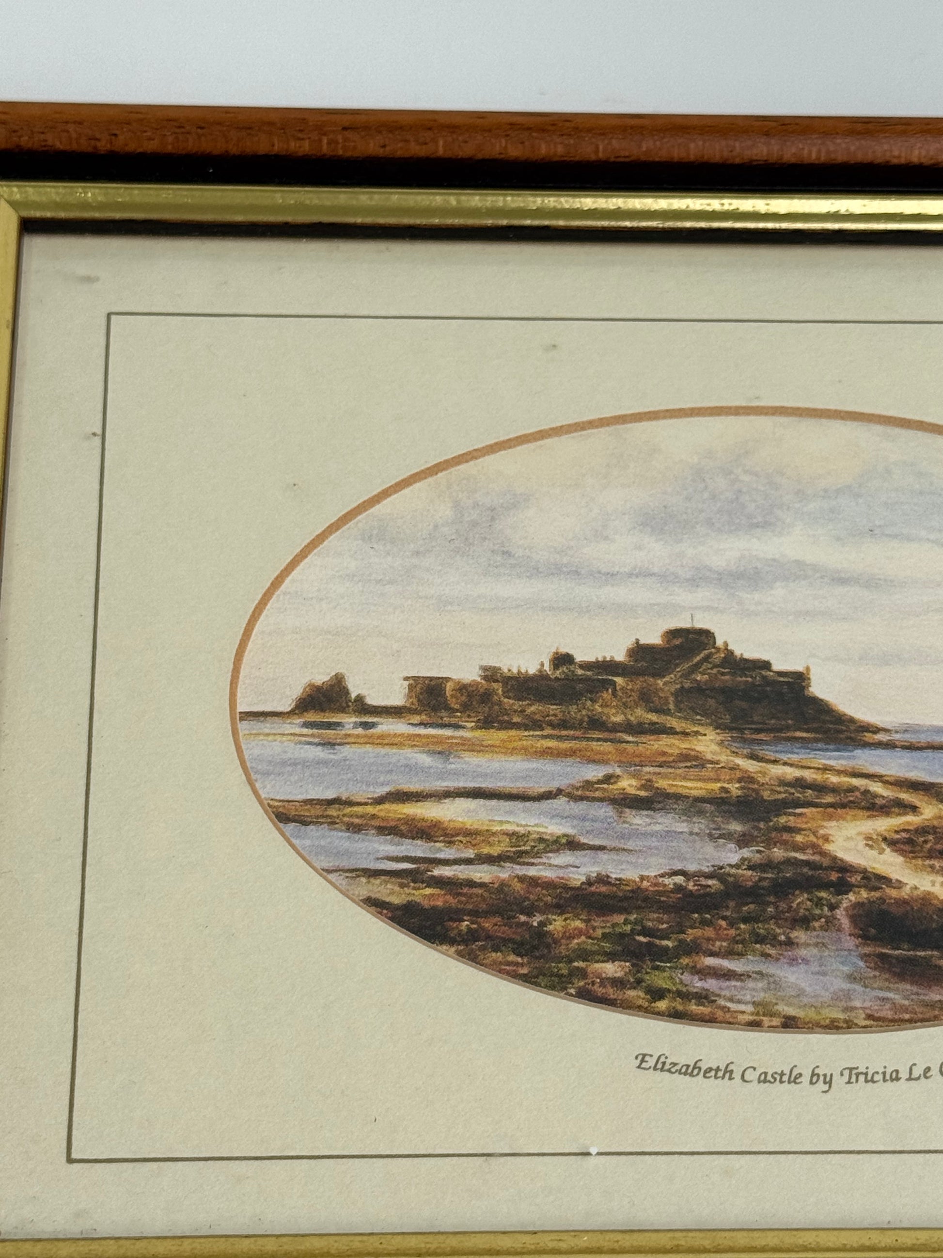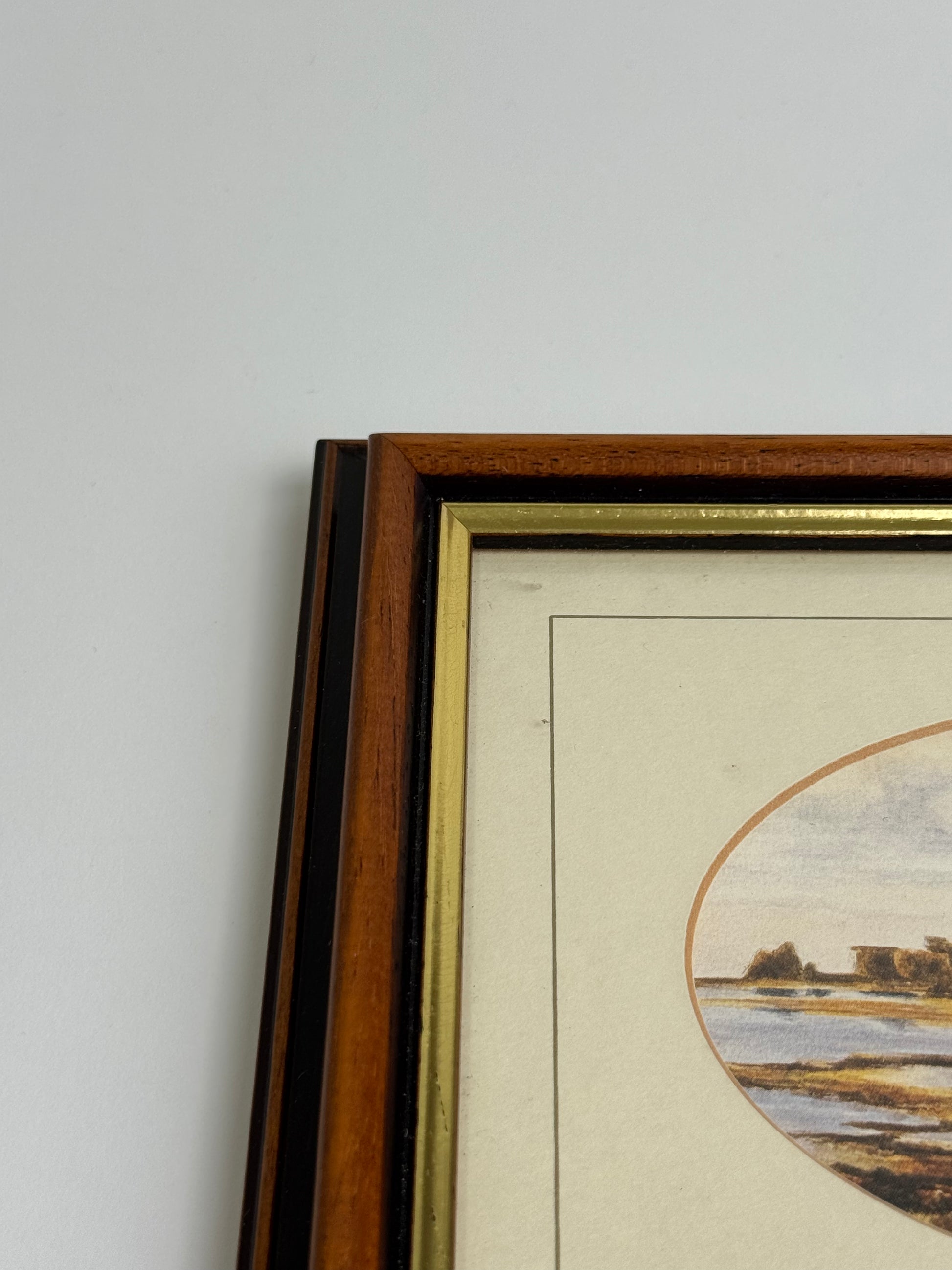 Mid sized traditional vintage artwork. A landscape piece in an oval mounted frame. Walnut frame with gold inner detail.