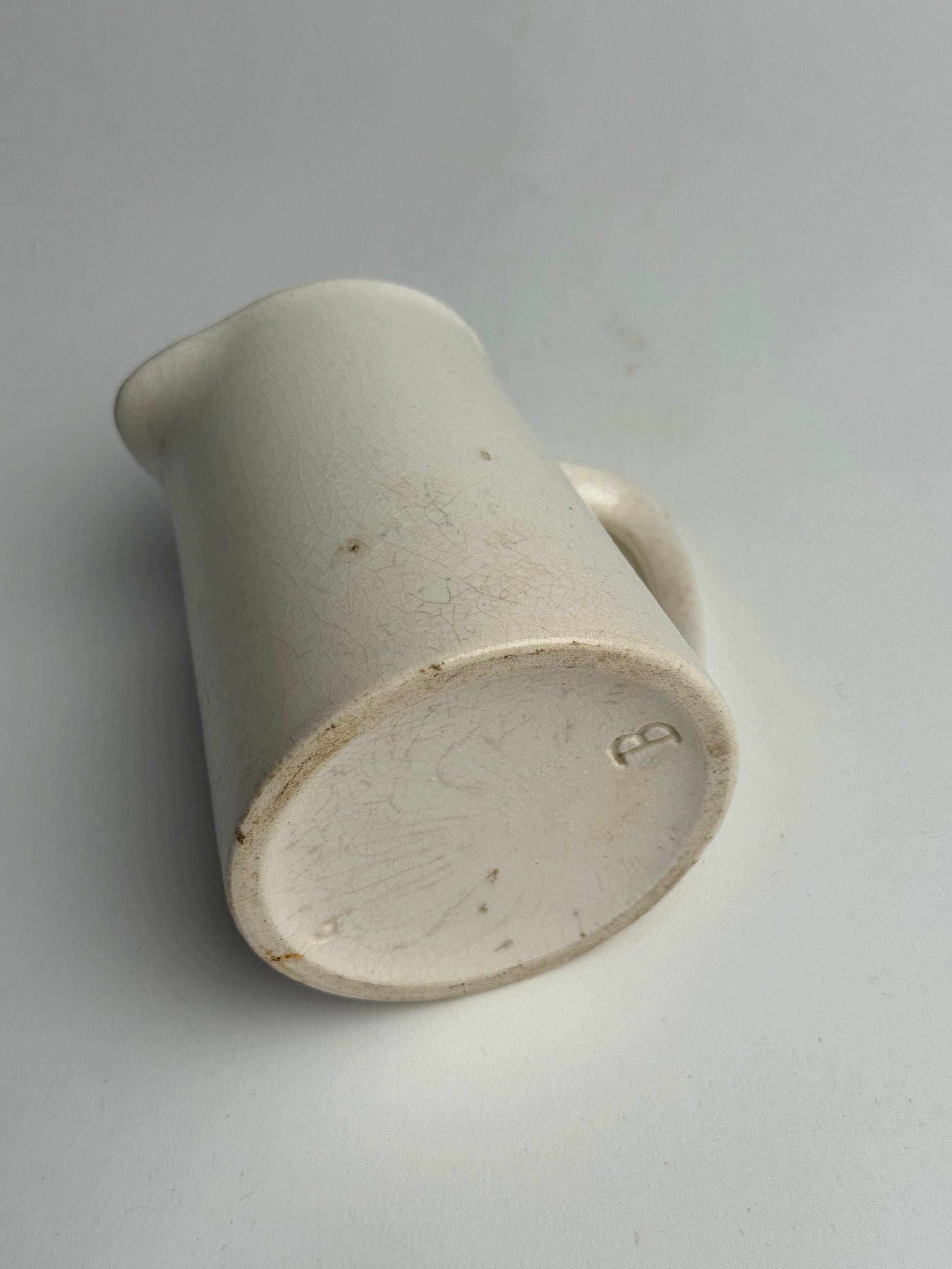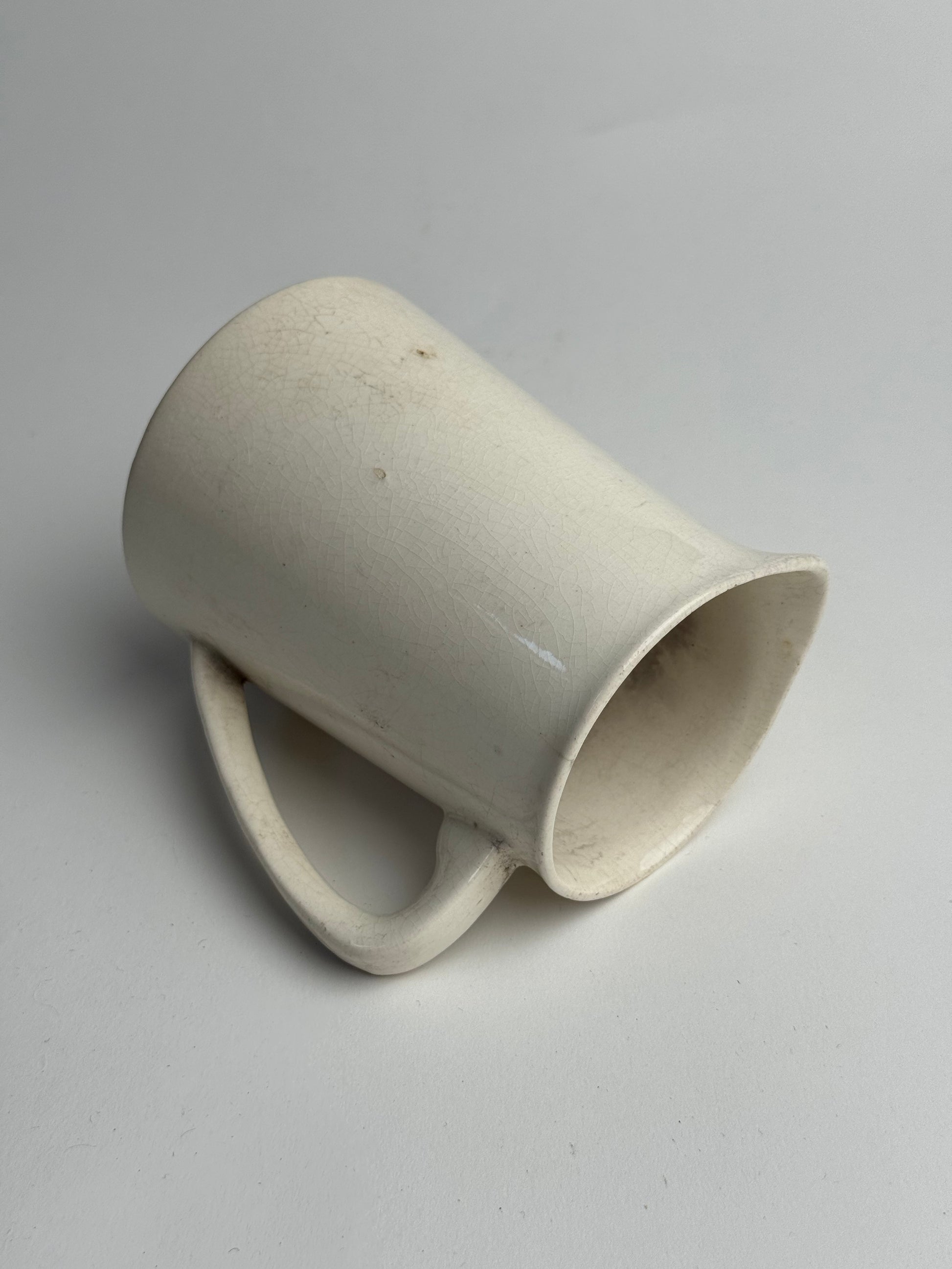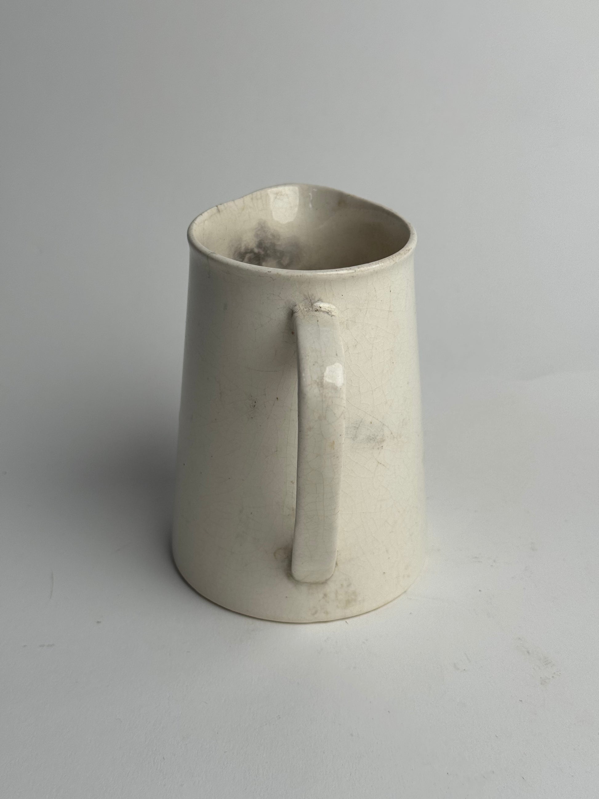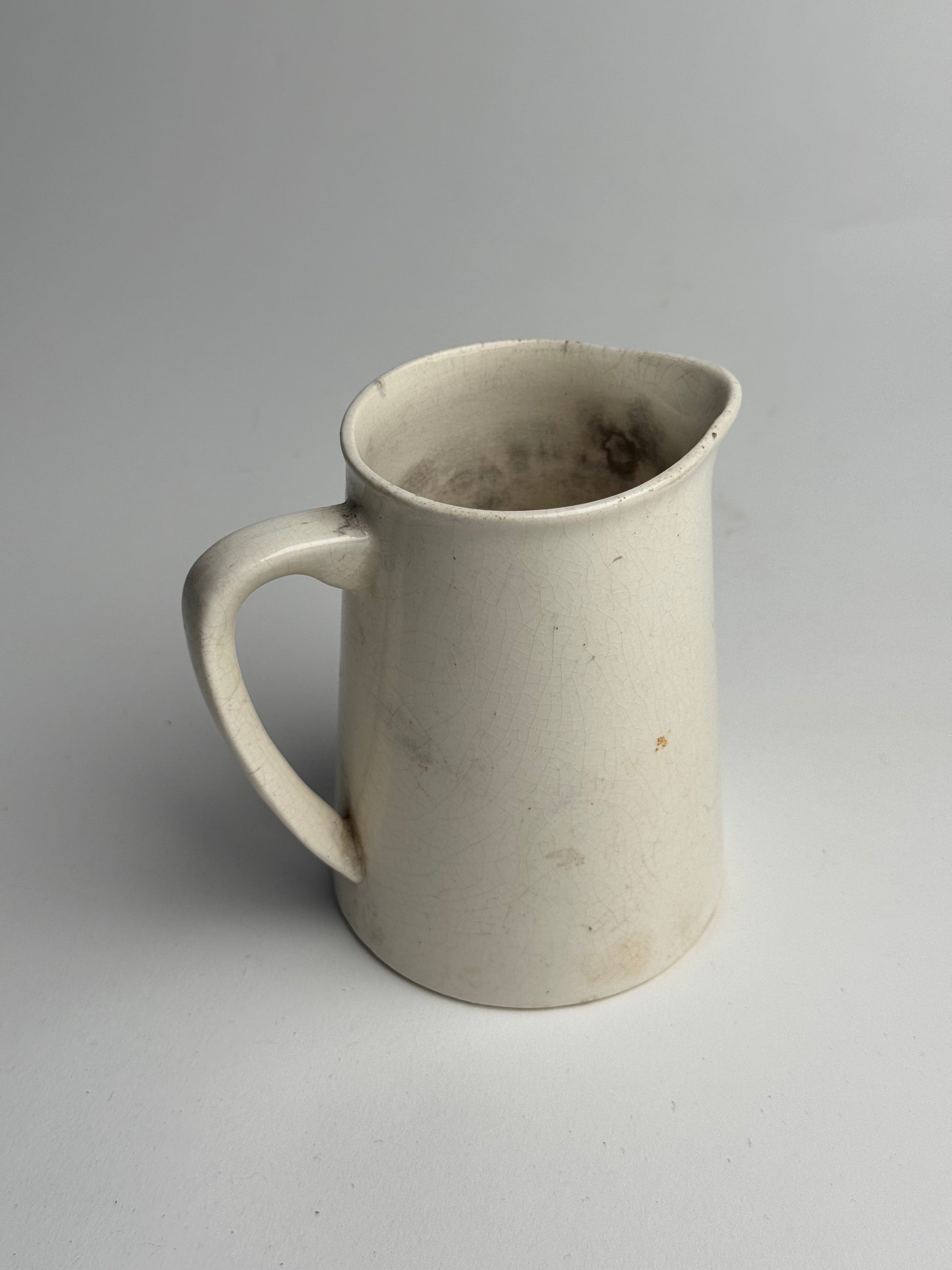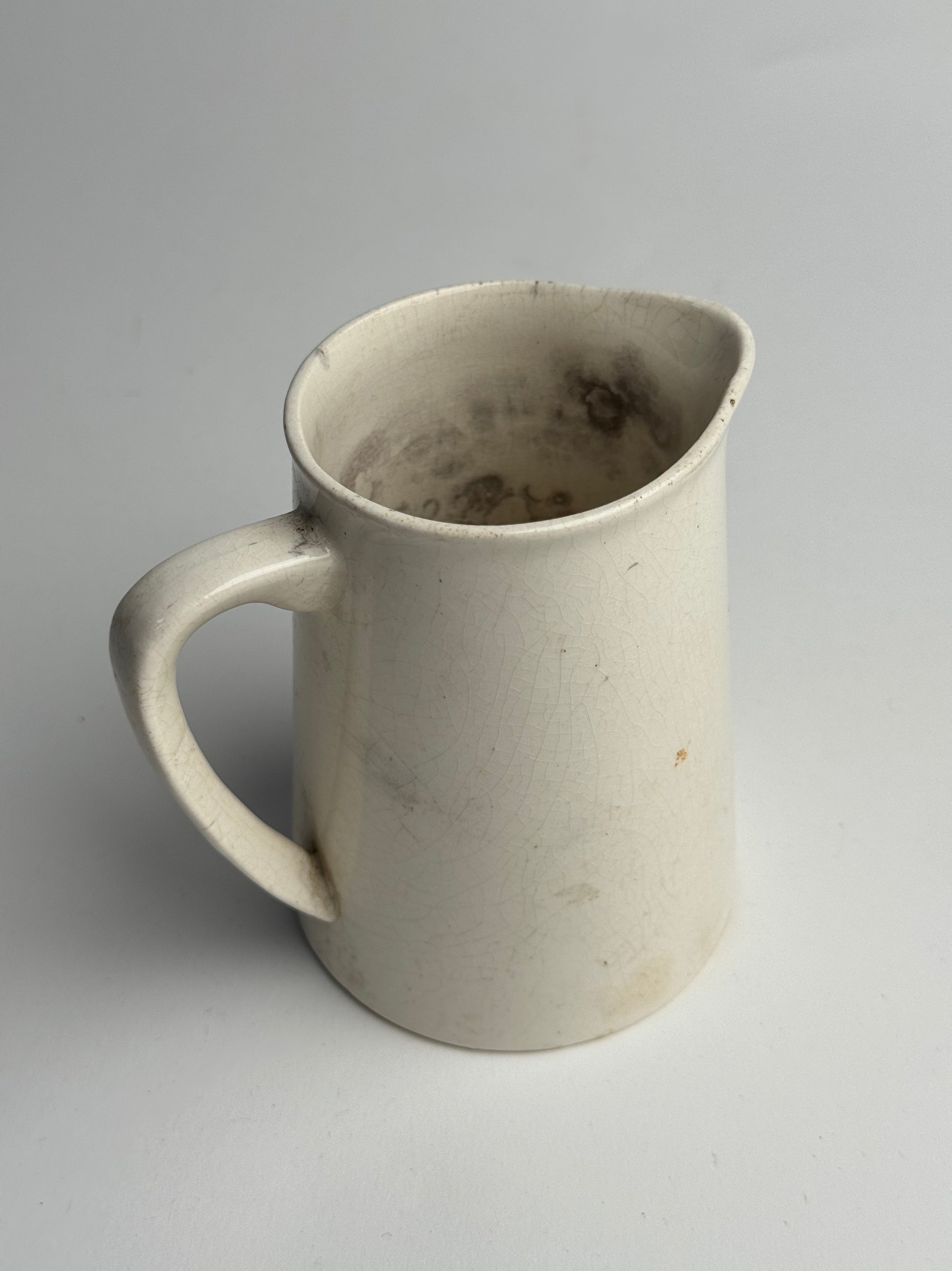 This Vintage jug features a traditional style and a soft, crackle glaze. Visible signs of wear and possible ink stains inside the jug, adding to its character. Style alone or with some dried stems.