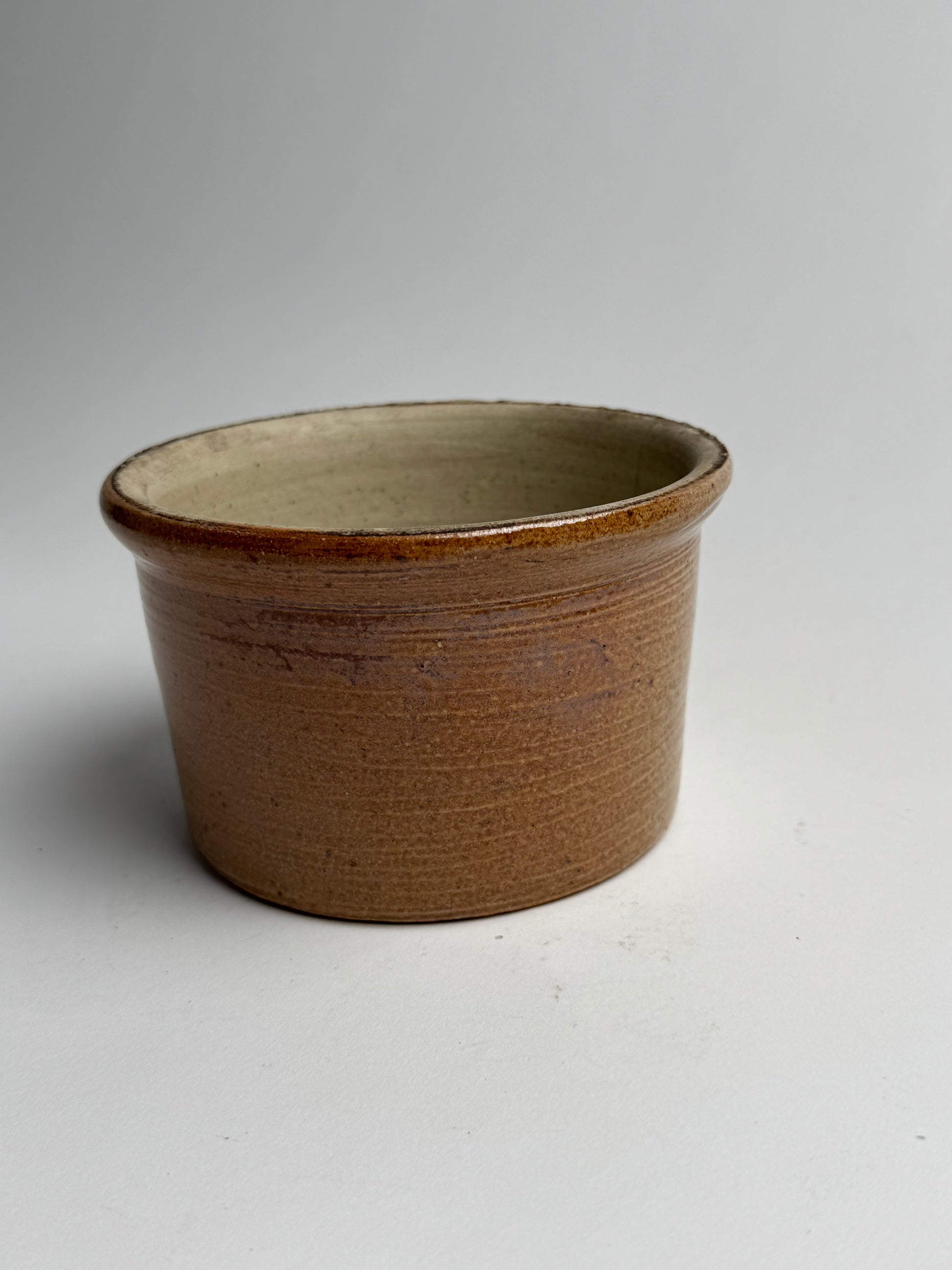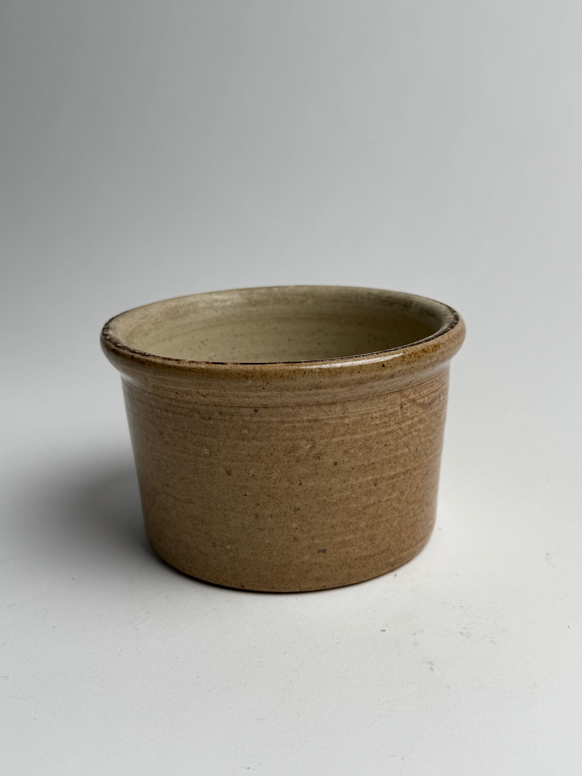 This French preserve pot features a two-toned brown-beige glaze with a cylindrical form. Originally used in rural French kitchens for jam, cream or butter.