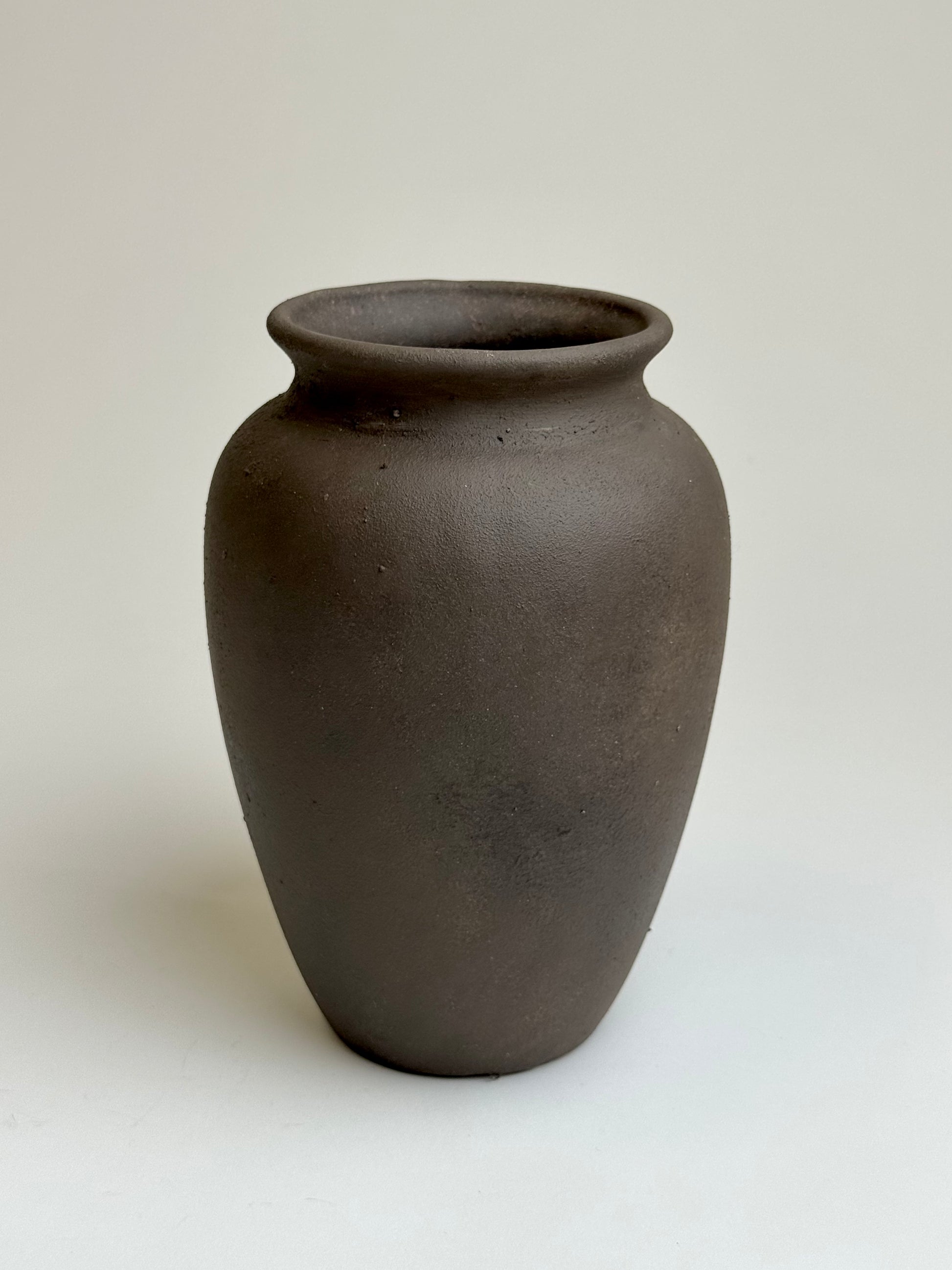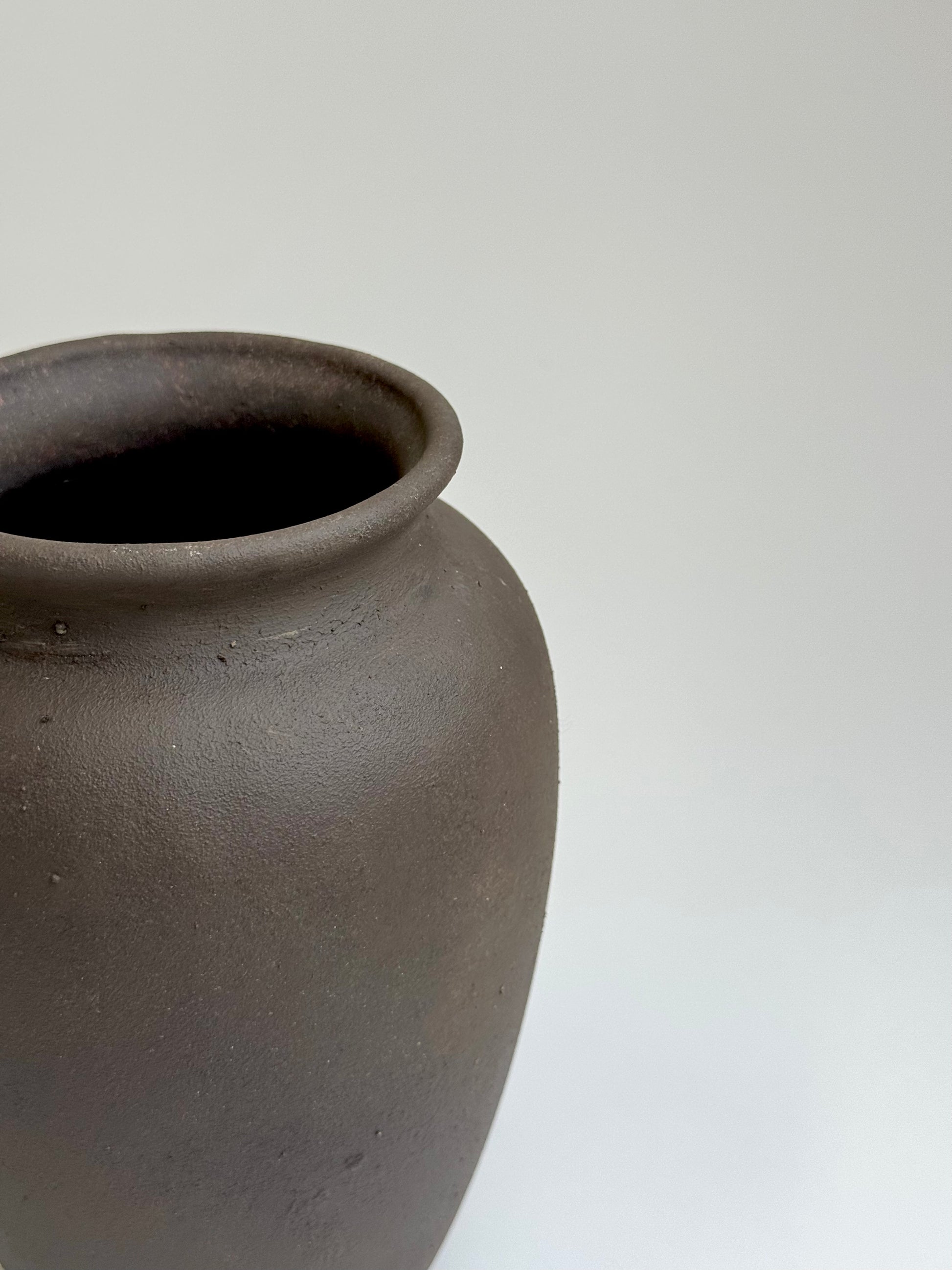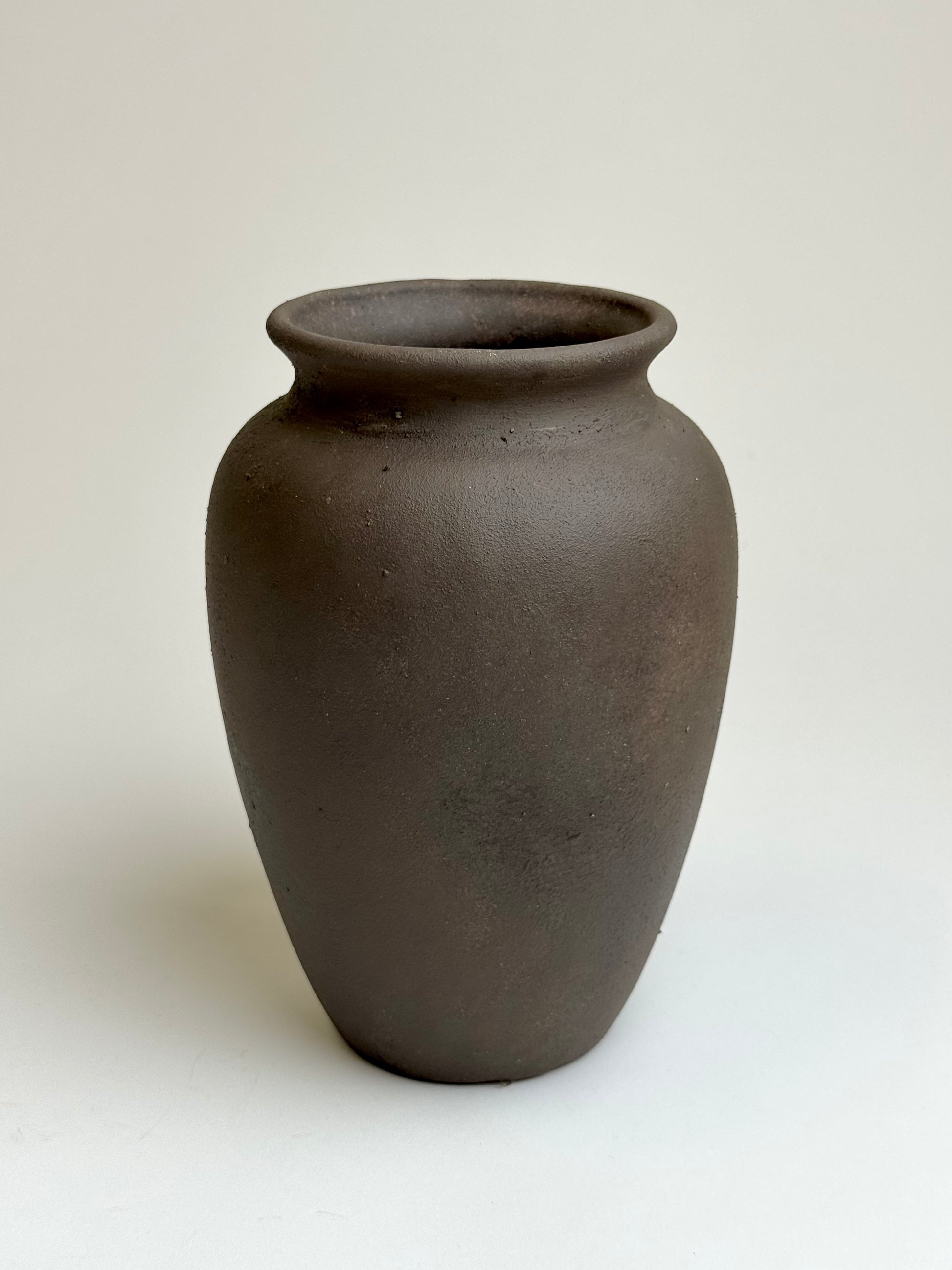 Dark earthy brown pot, a classic urn shape with a smooth, deep chocolate-brown finish. Subtle faux patina effect, a one-off beauty in the world of earthy interiors.