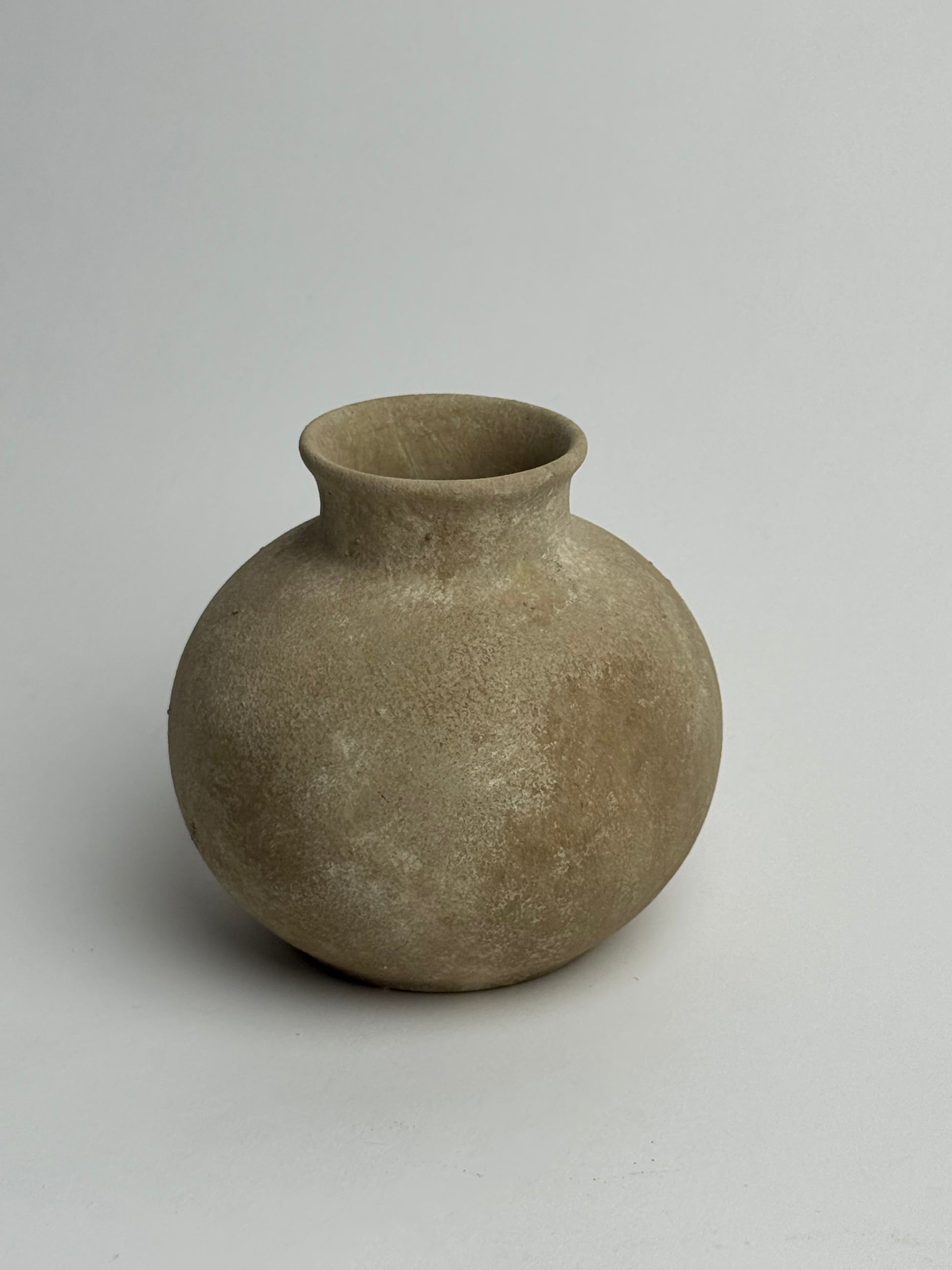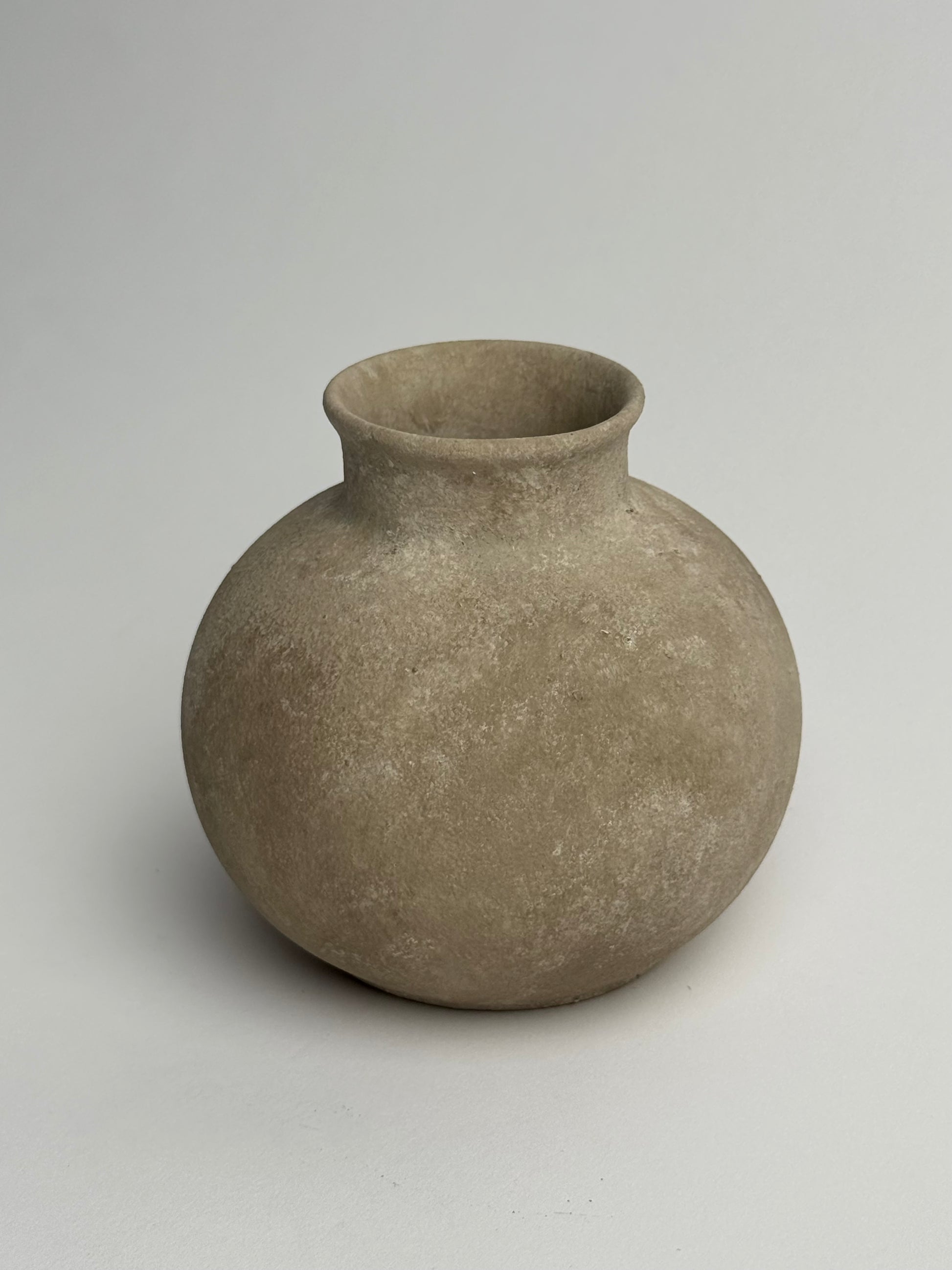 This small rounded pot is finished in a beige-brown with soft patina effect. A perfect piece for shelf styling. Another lighter version available, for the perfect styling duo.