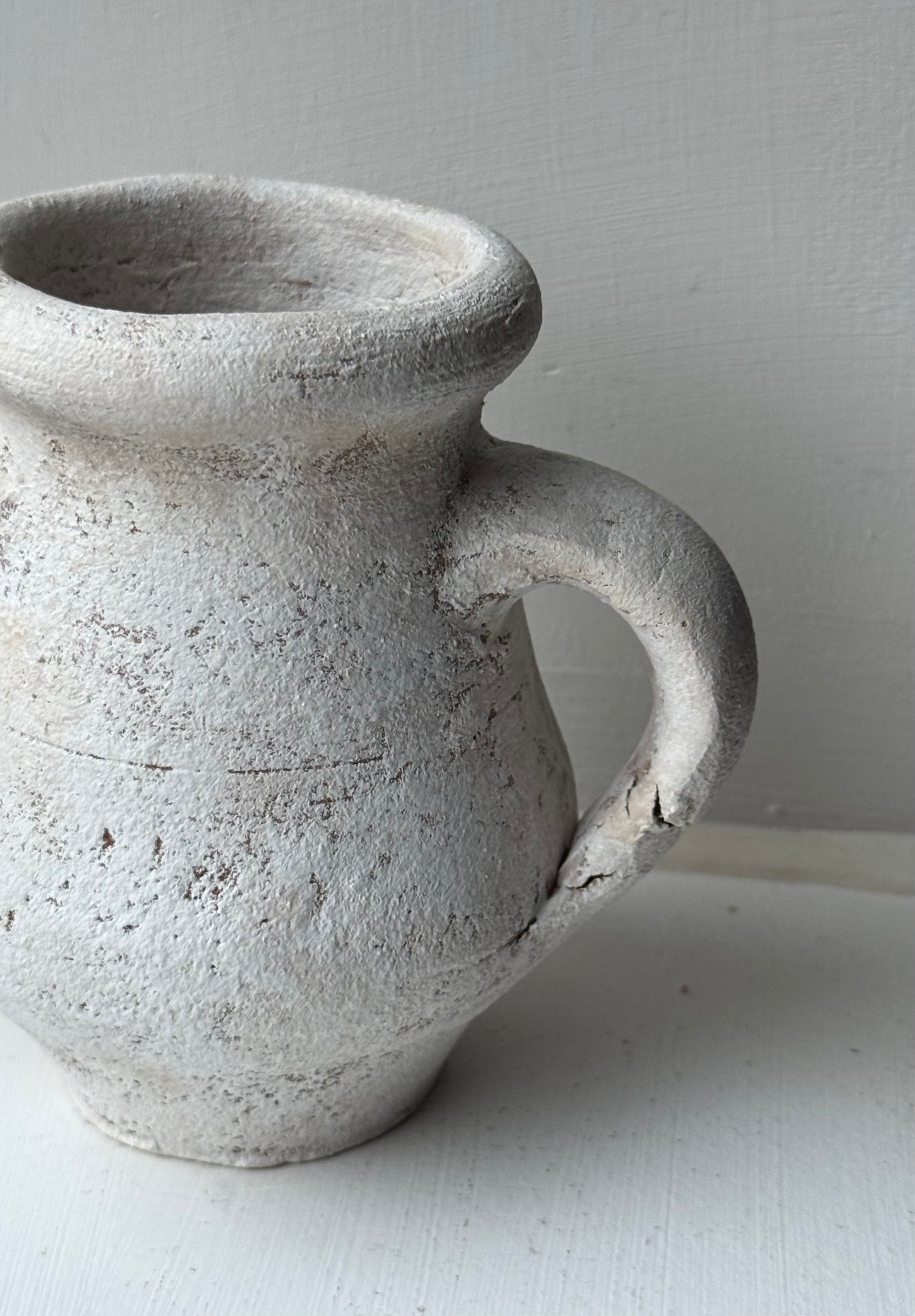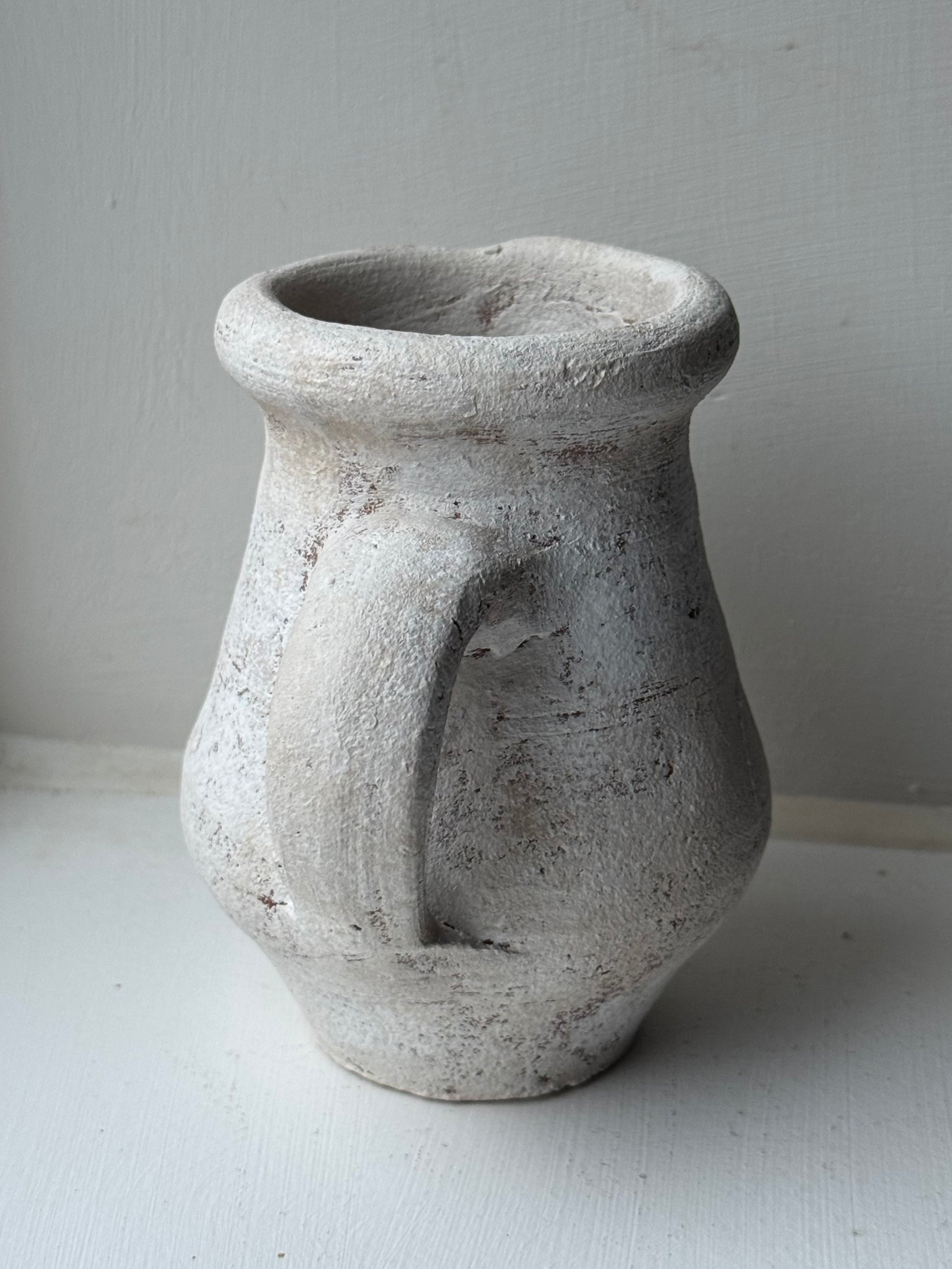 This small twin handle pot is finished in an off-white patina style, with pink-beige undertones. A perfect small staple for the home.