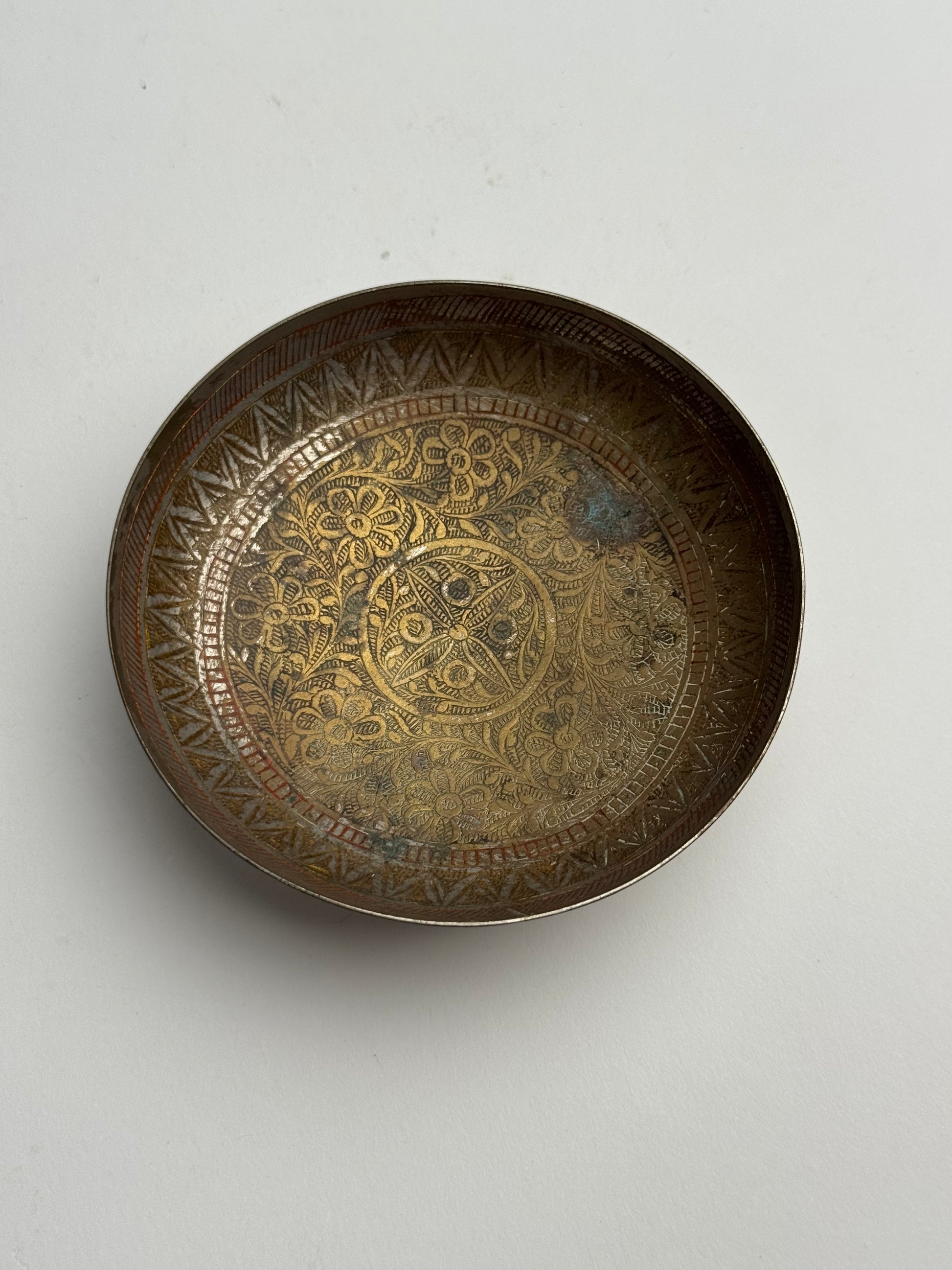 This Vintage silver dish features an aztec, intricate pattern detailing and a pedestal form. Signs of wear and aged patina, making for a soulful piece. Perfect used as a trinket dish.