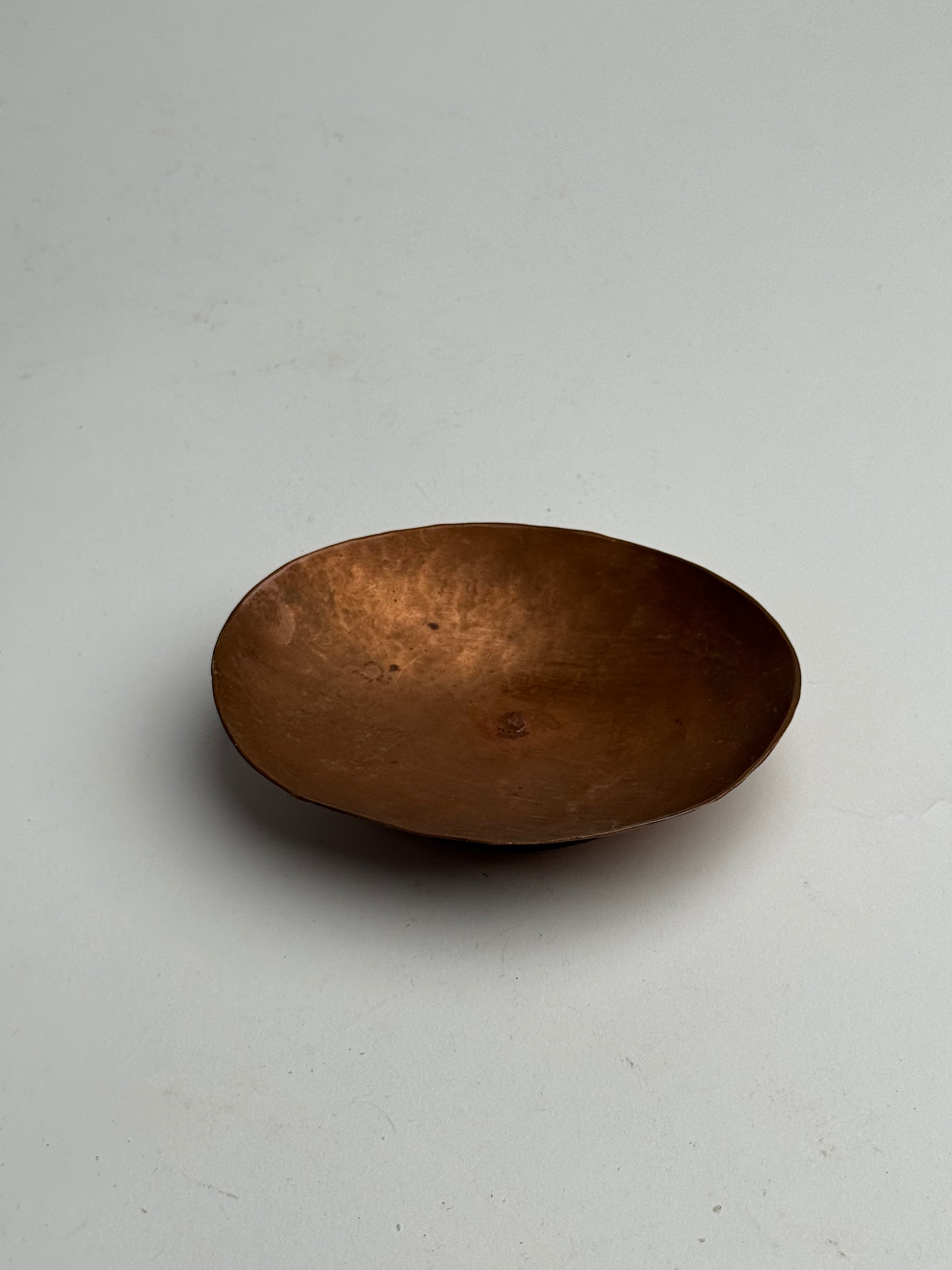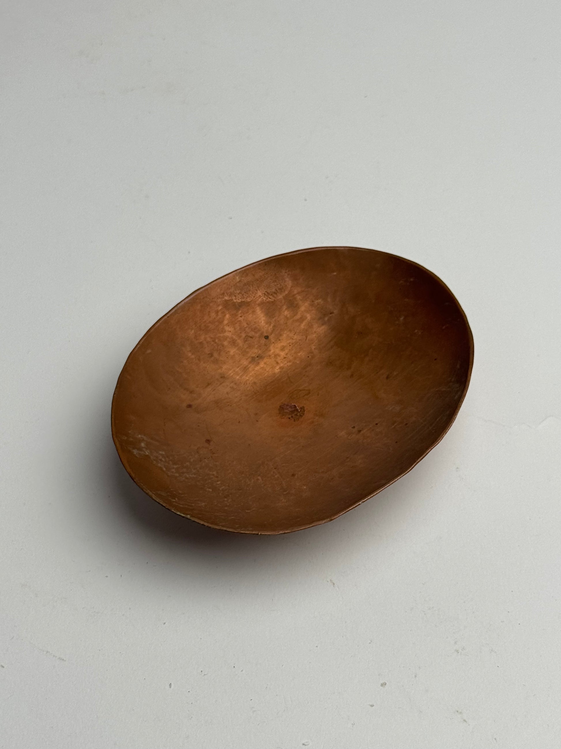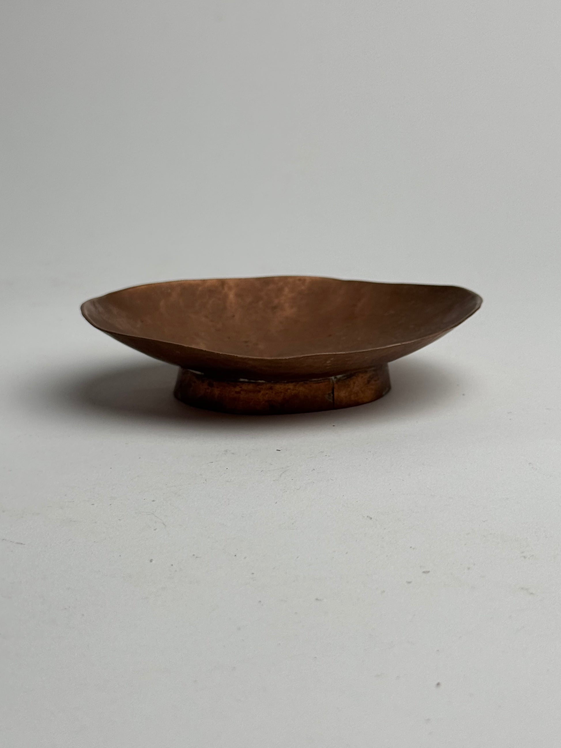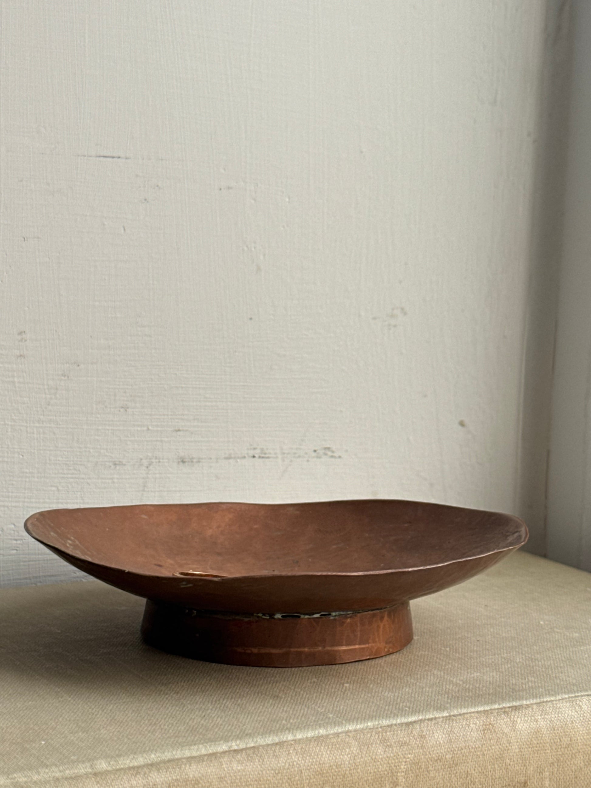This pedestal copper dish, with its subtly irregular shape, is a lovely unique find. Signs of wear and oxidising, a piece where its' age and past life shines through. Perfect as a trinket/coin dish or for styling on shelves & admiring the pedestal form.