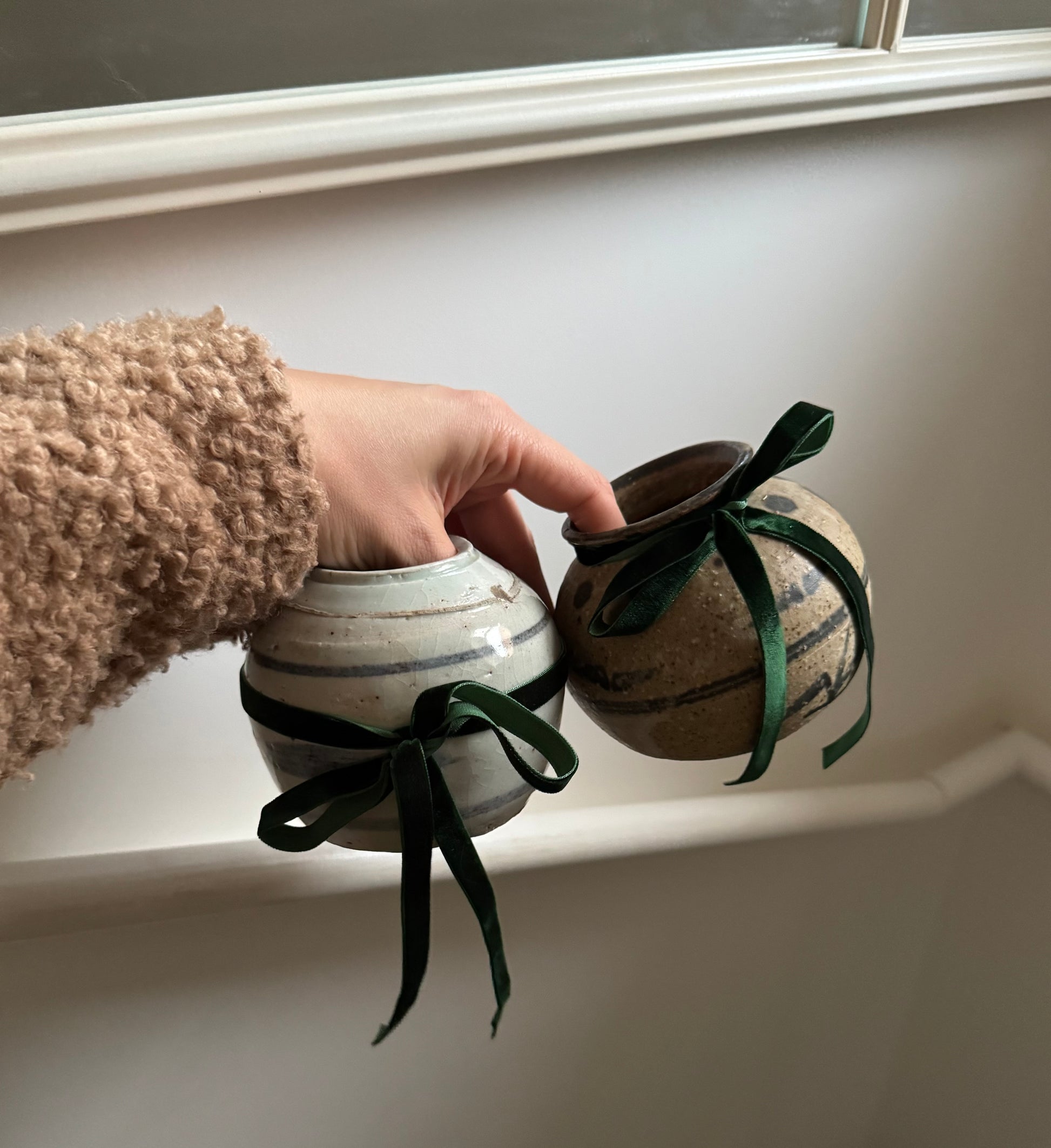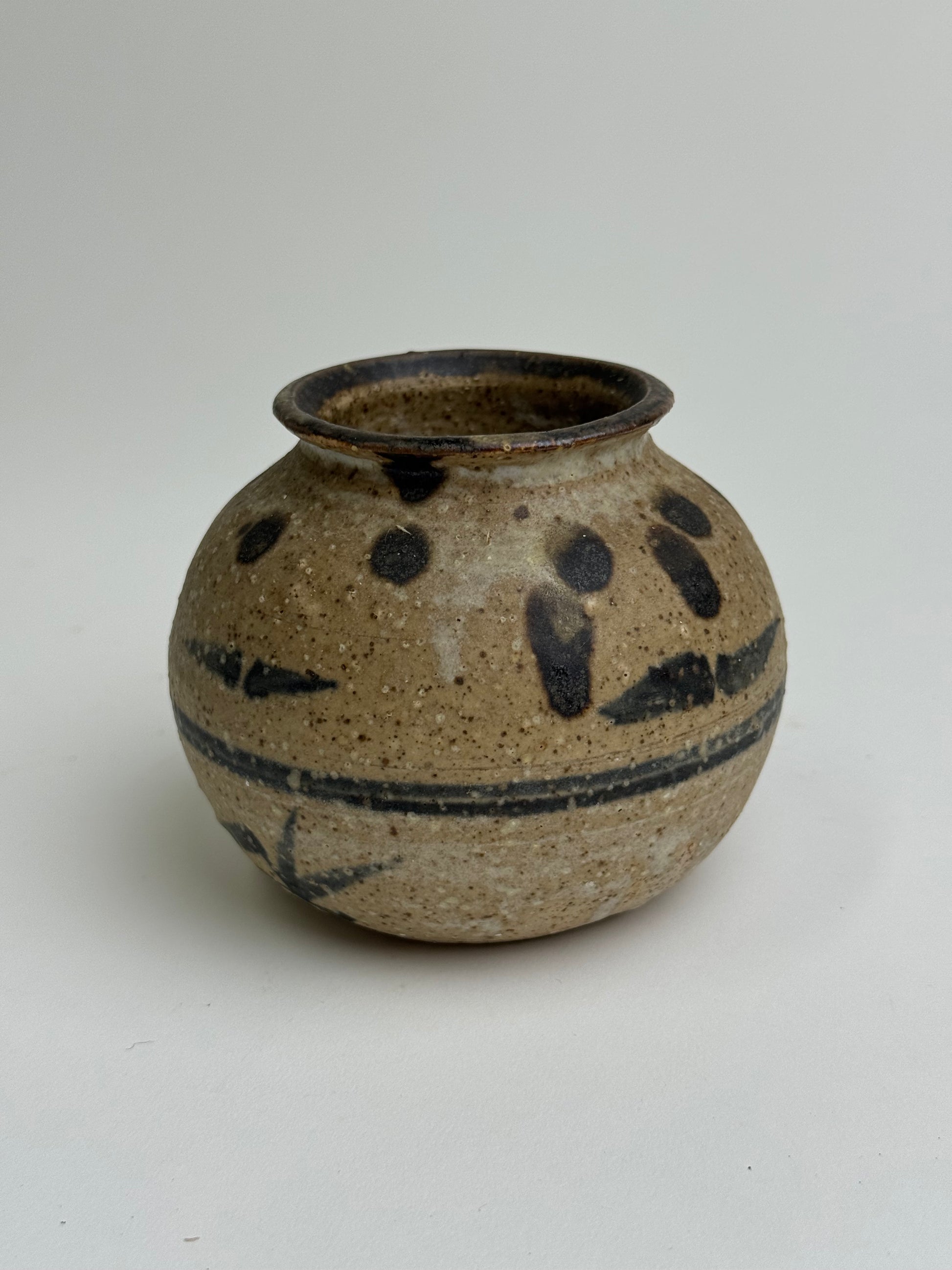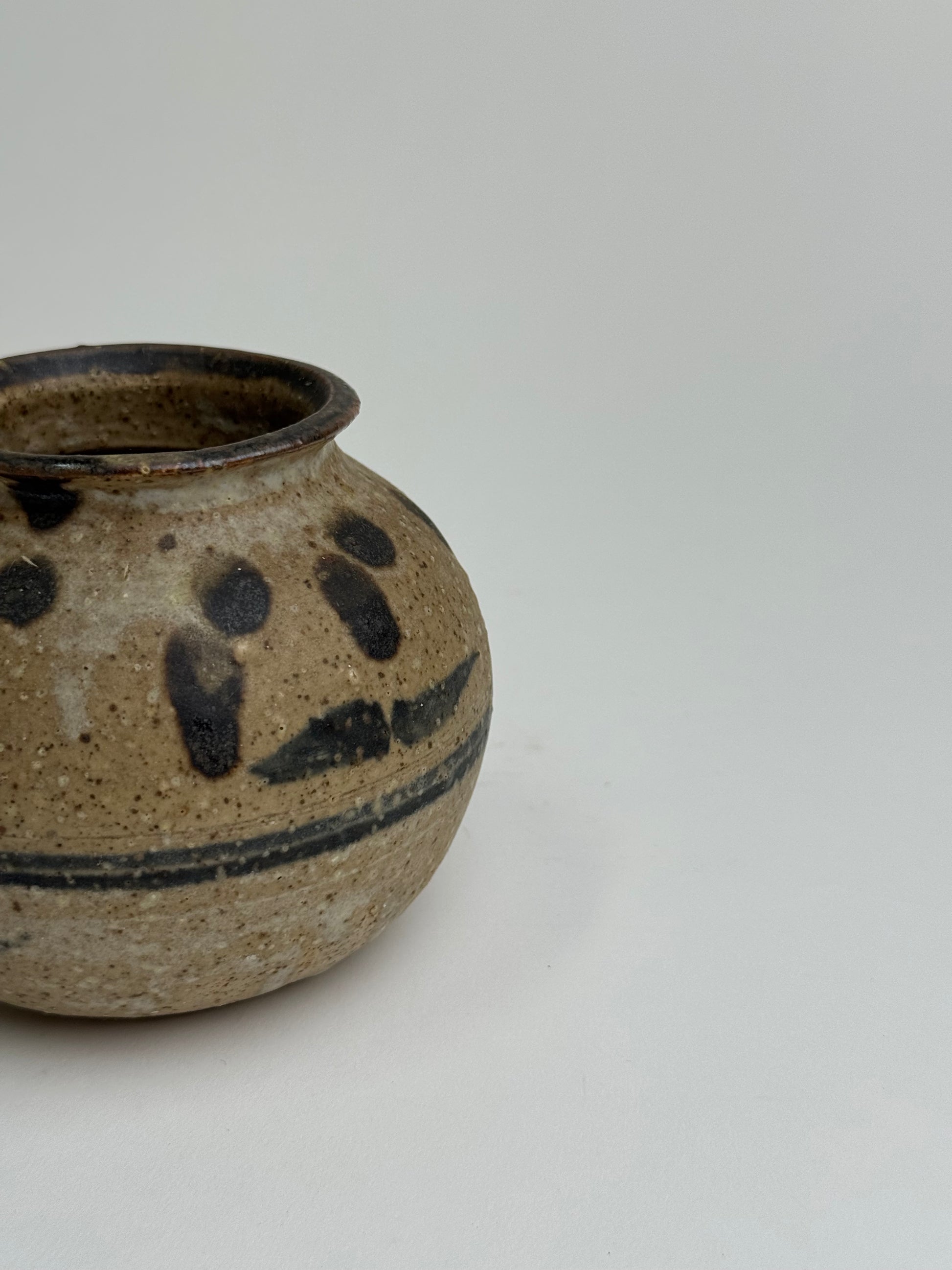 This vintage earthenware pot features a low, rounded shape and abstract pattern detail. Perfect for styling on rustic shelves.