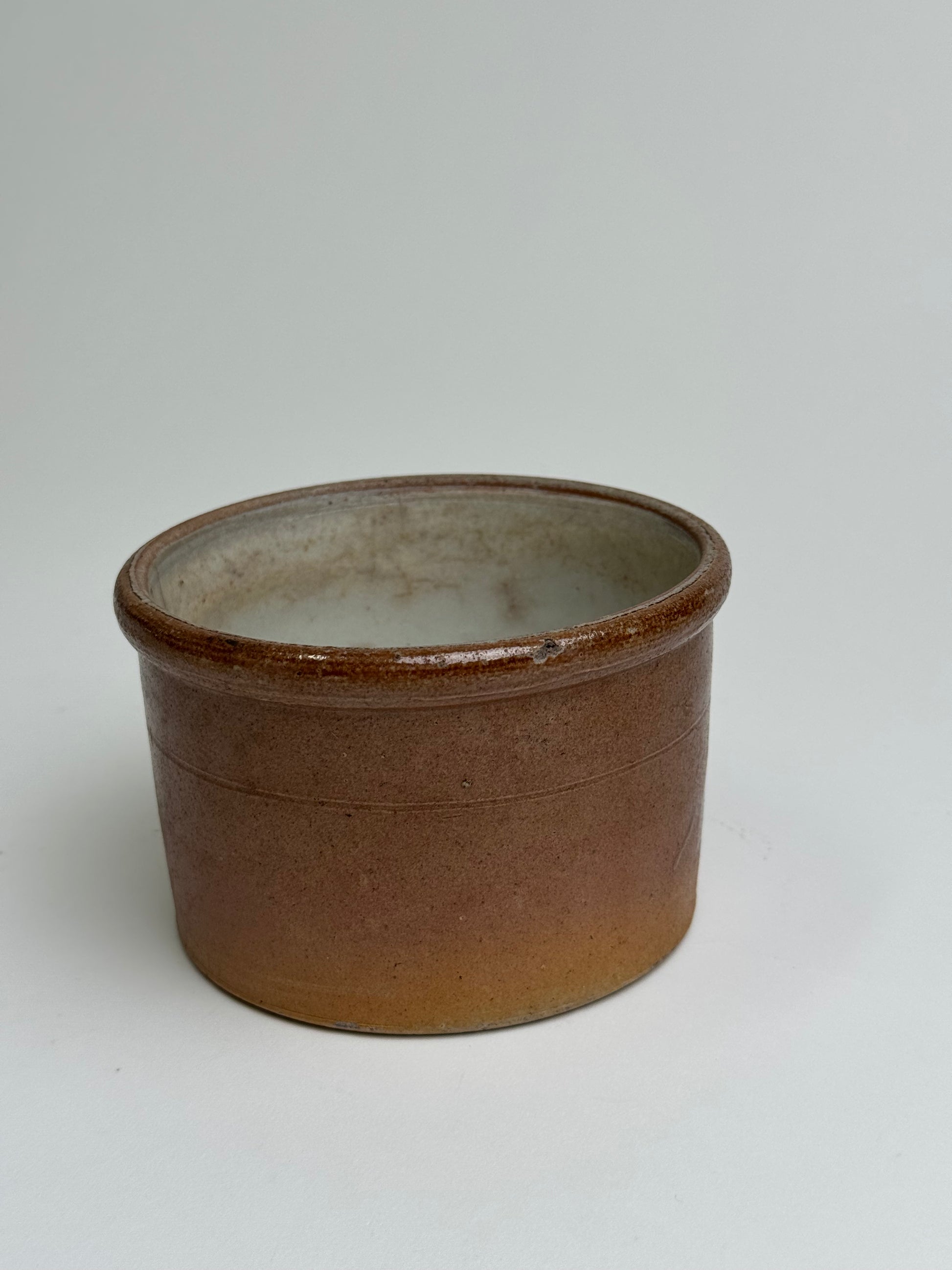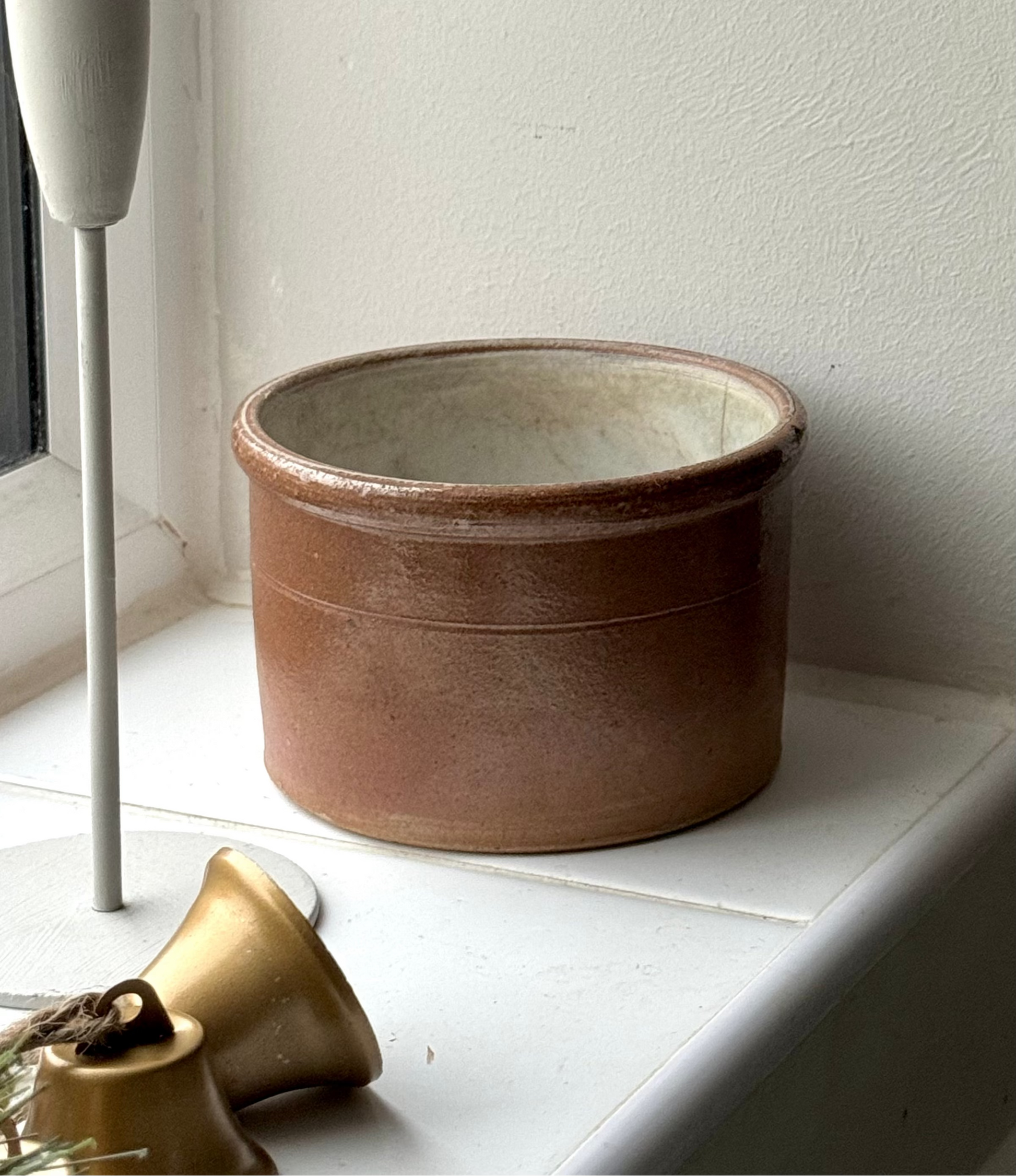 This vintage French preserve pot has a cylindrical form, a terracotta body with an inner soft pale glaze. Originally used in rural French kitchens for jam, cream or butter. Fine cracks noted in images.