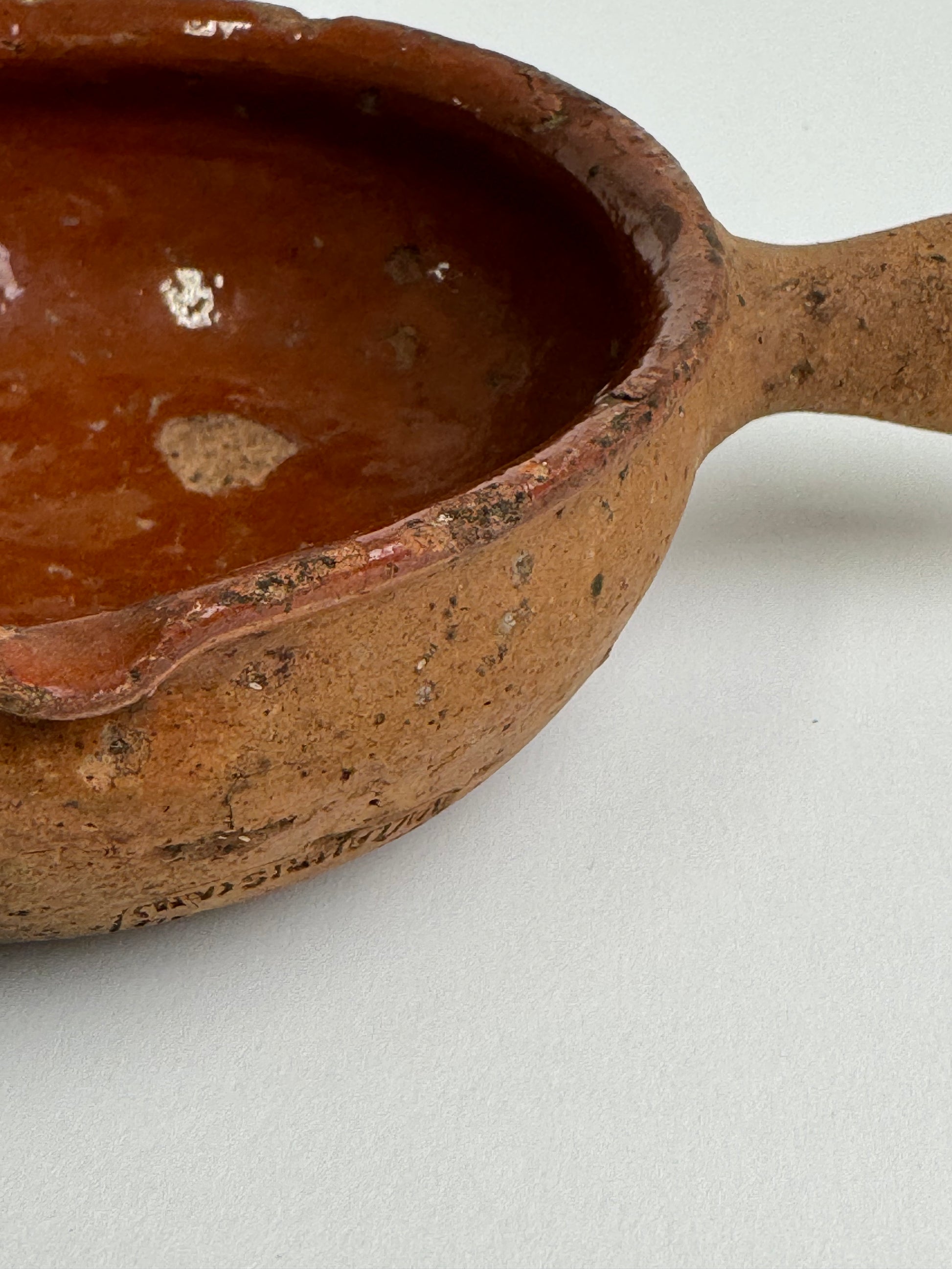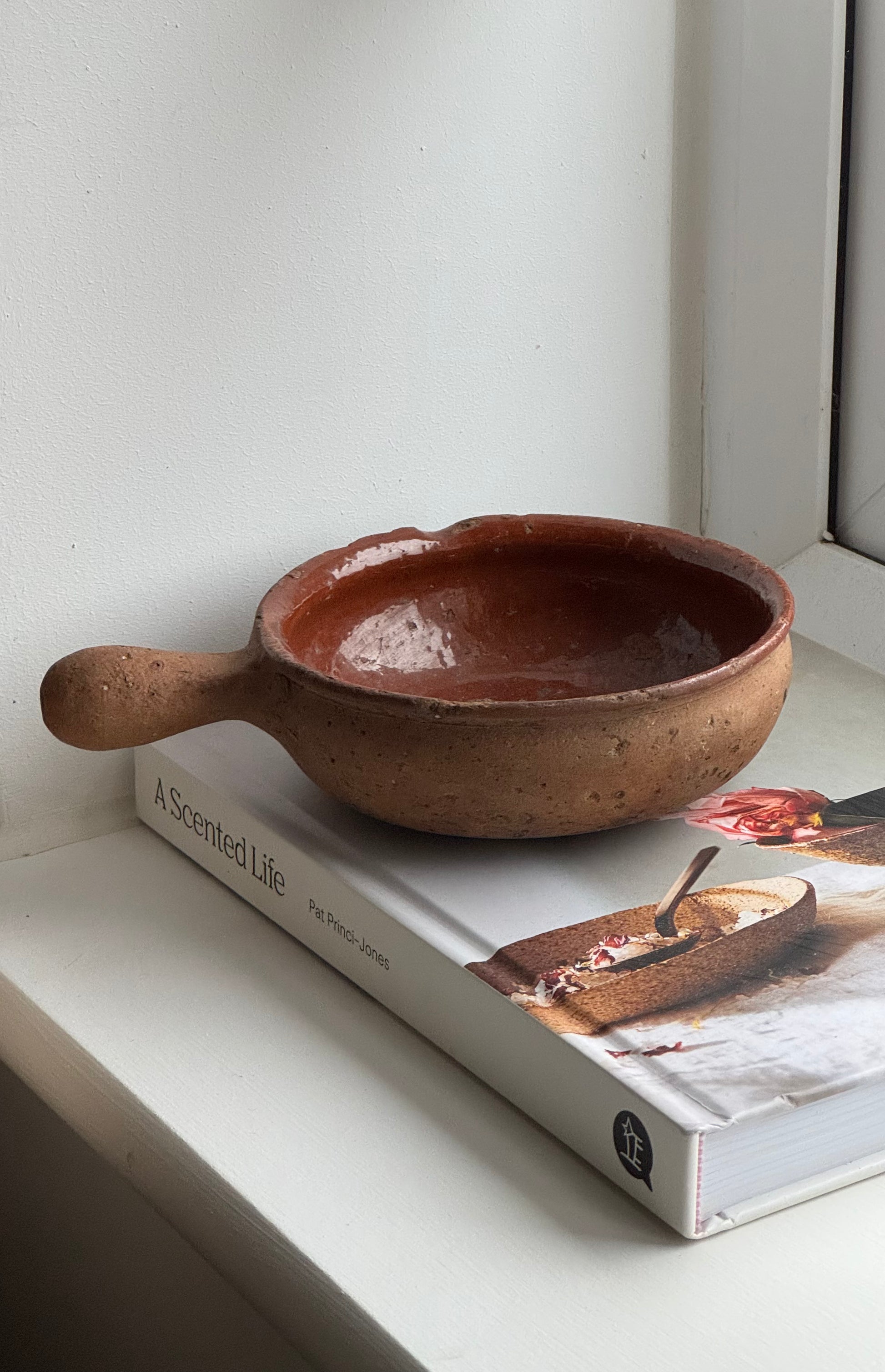 This vintage terracotta skillet features a deep, warm glaze and was traditionally used in kitchens for roasting garlic, baking eggs, warming sauces or serving small dishes from oven to table. Now, a beautiful rustic piece to display on open shelving or use as a candle dish.