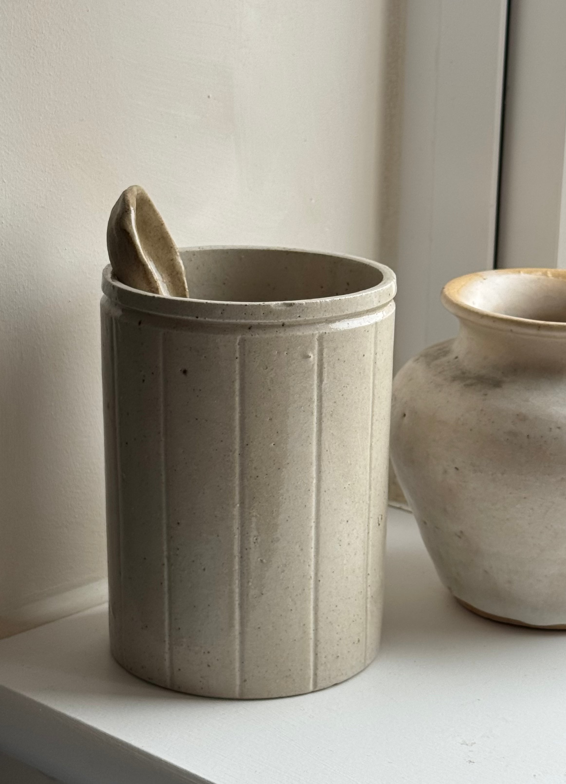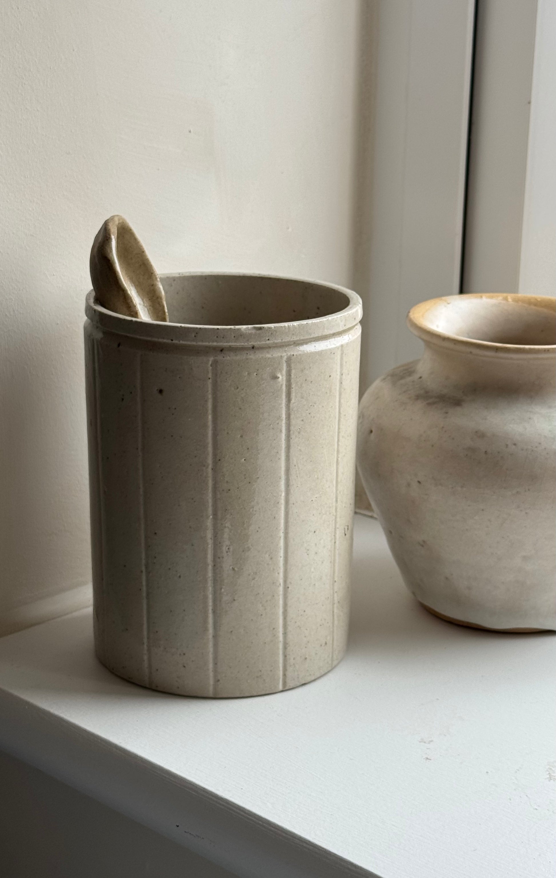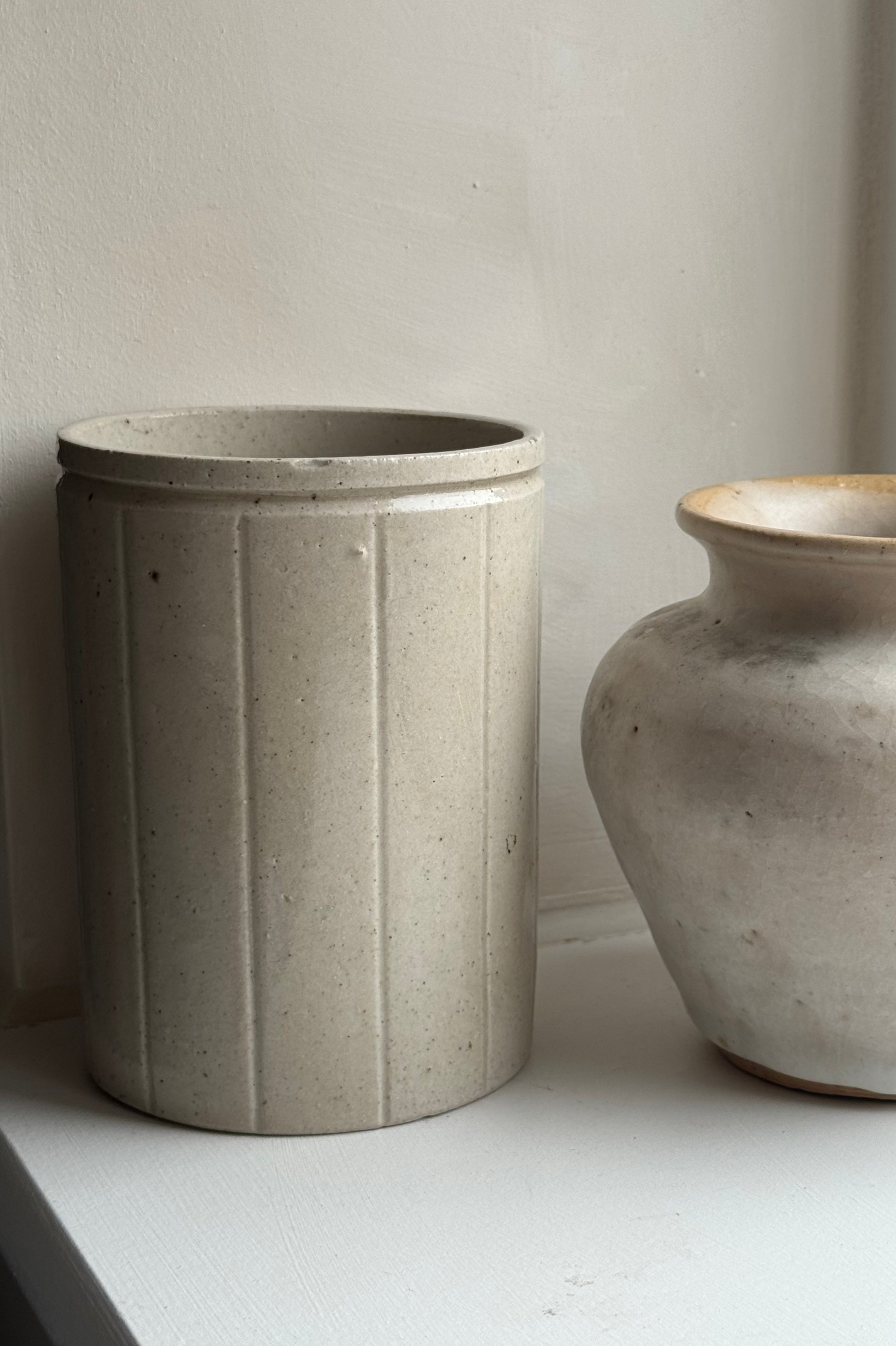 This Vintage marmalade jar once served a culinary purpose, now a beautiful glazed piece great for use as brush holders and pen pots. Lovely vertical line detailing on a neutral base.