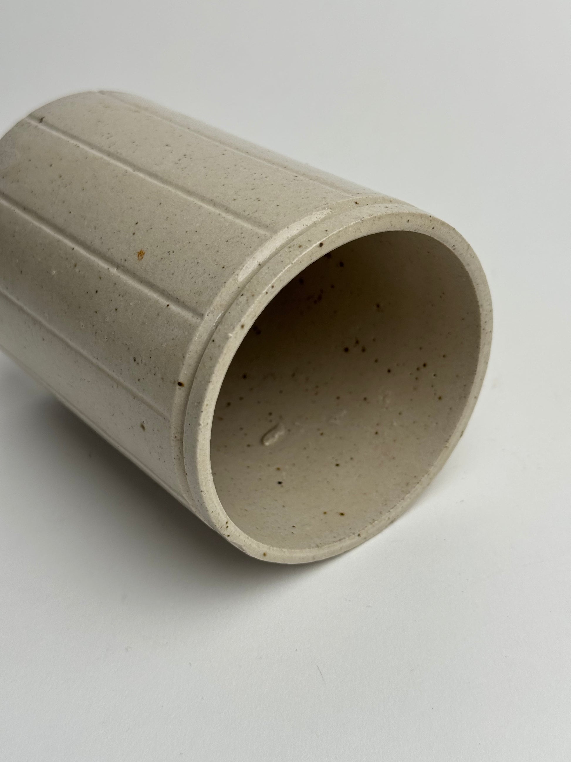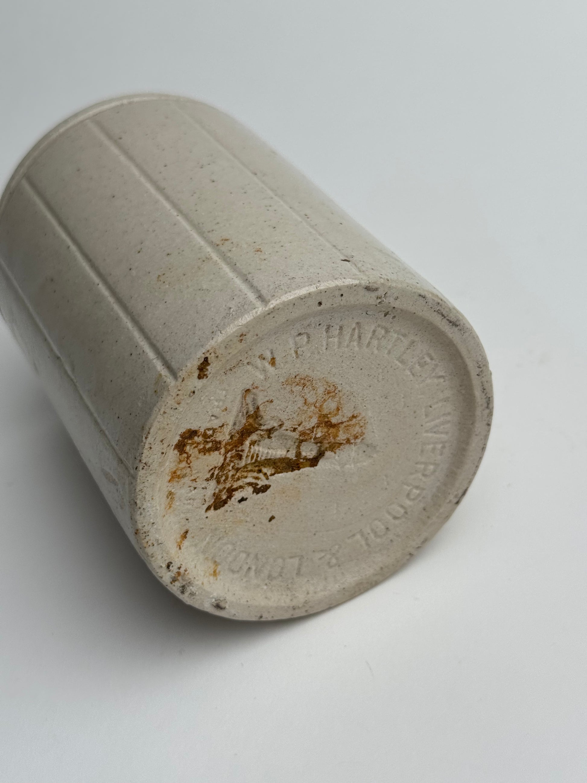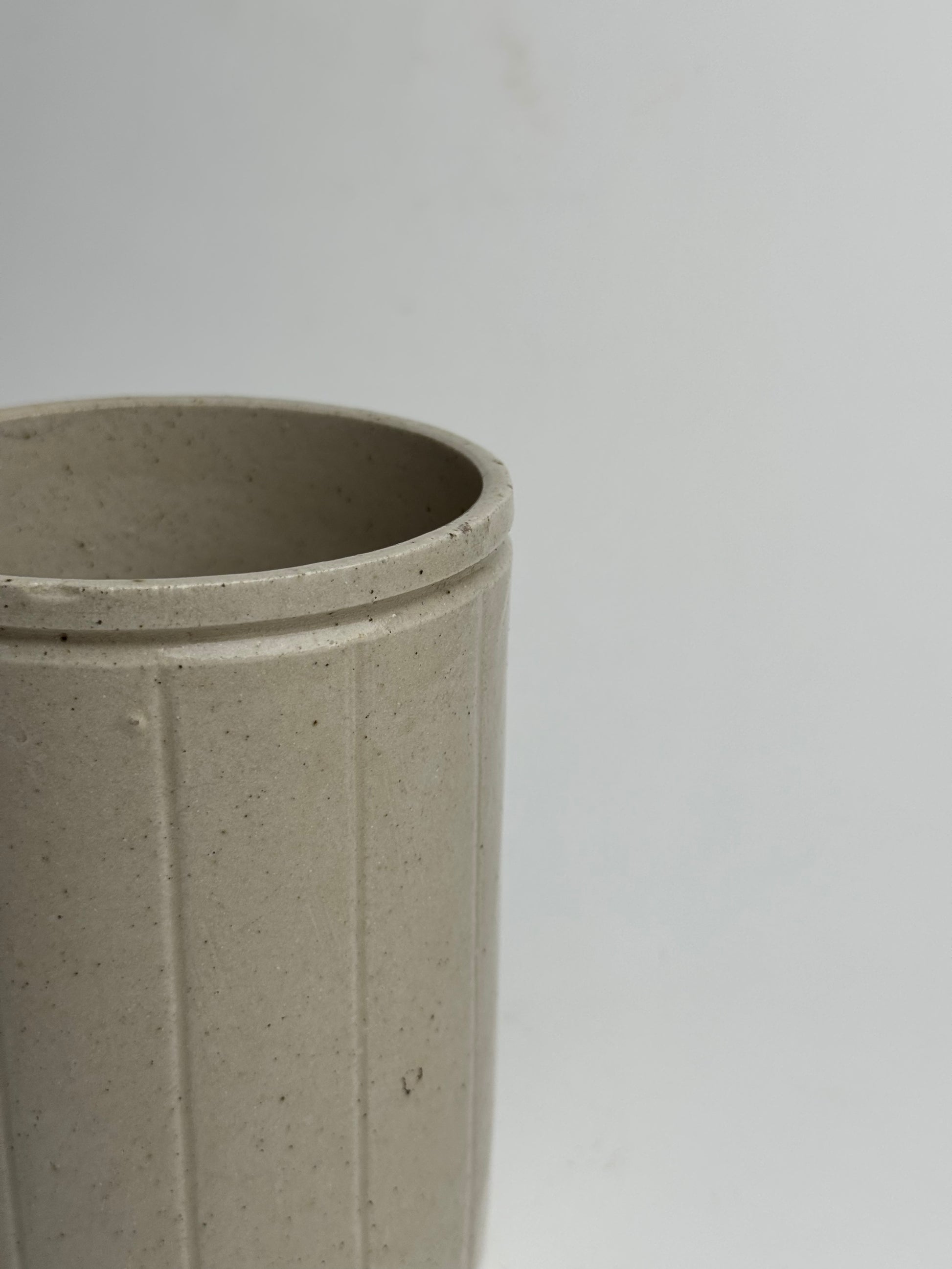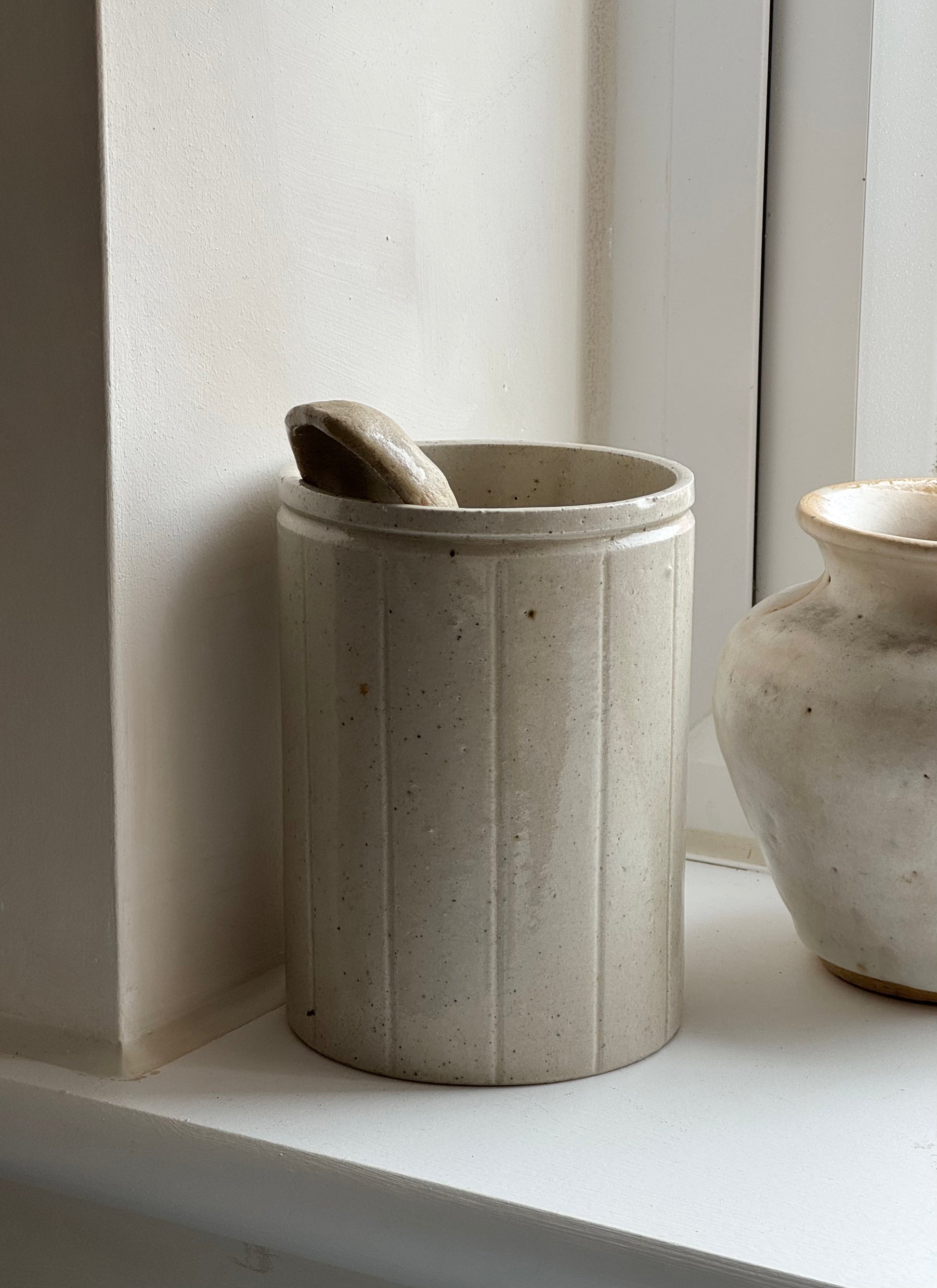 This Vintage marmalade jar once served a culinary purpose, now a beautiful glazed piece great for use as brush holders and pen pots. Lovely vertical line detailing on a neutral base.