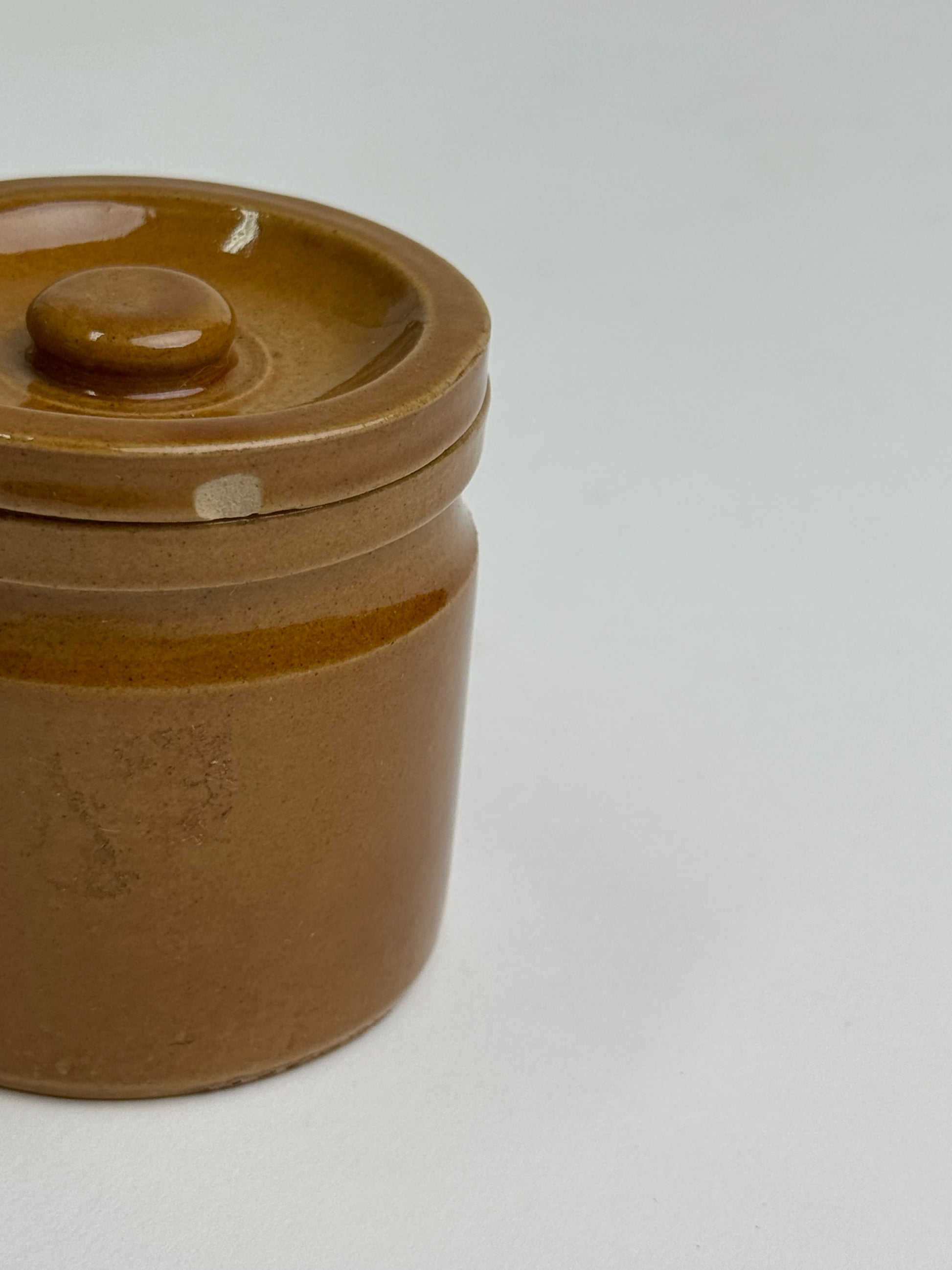 This vintage lidded storage jar features a mustard-brown glaze, simple in form. Once used as a preserve pot, now perfect for displaying as a standalone piece or storing dry goods.