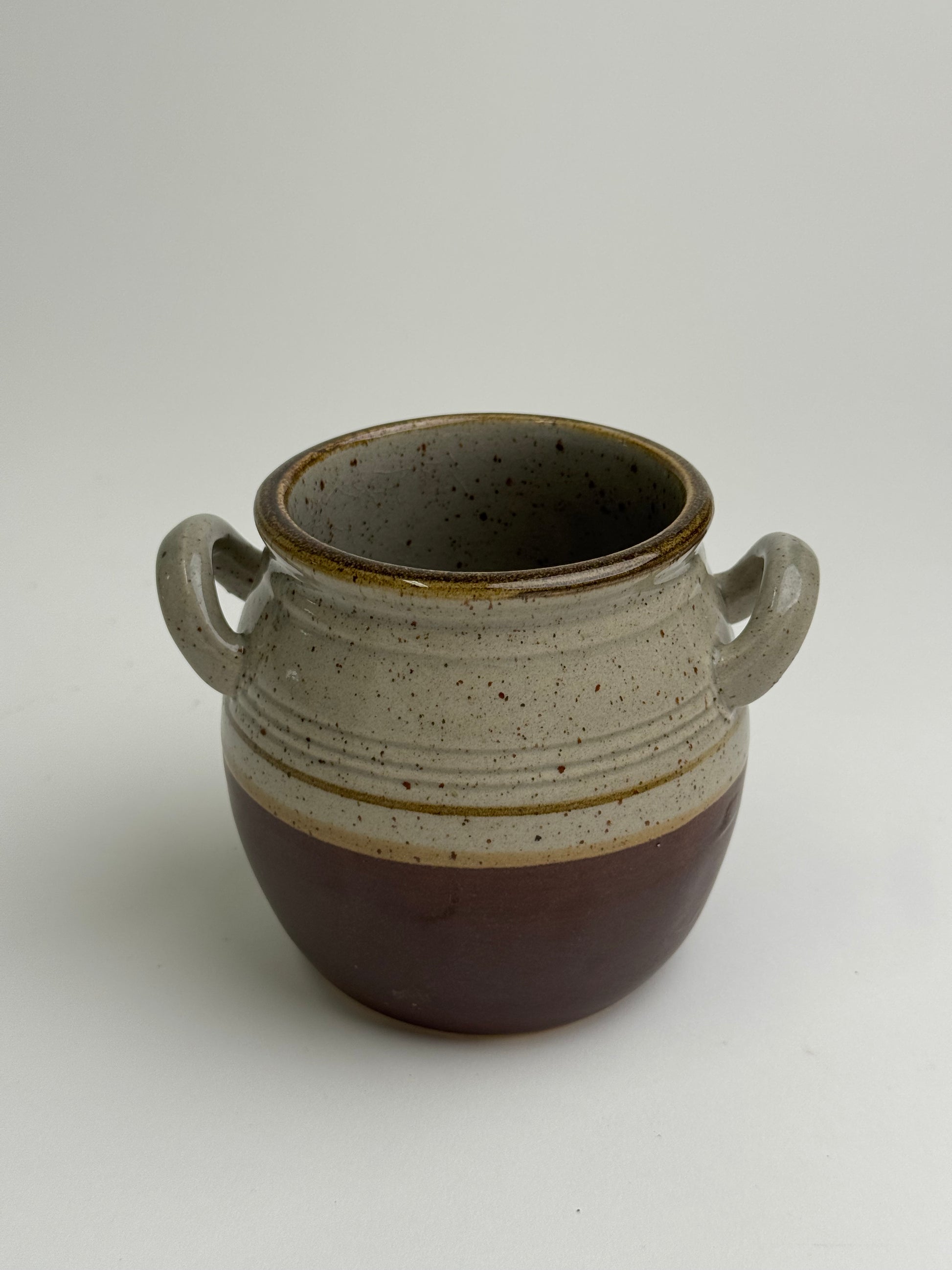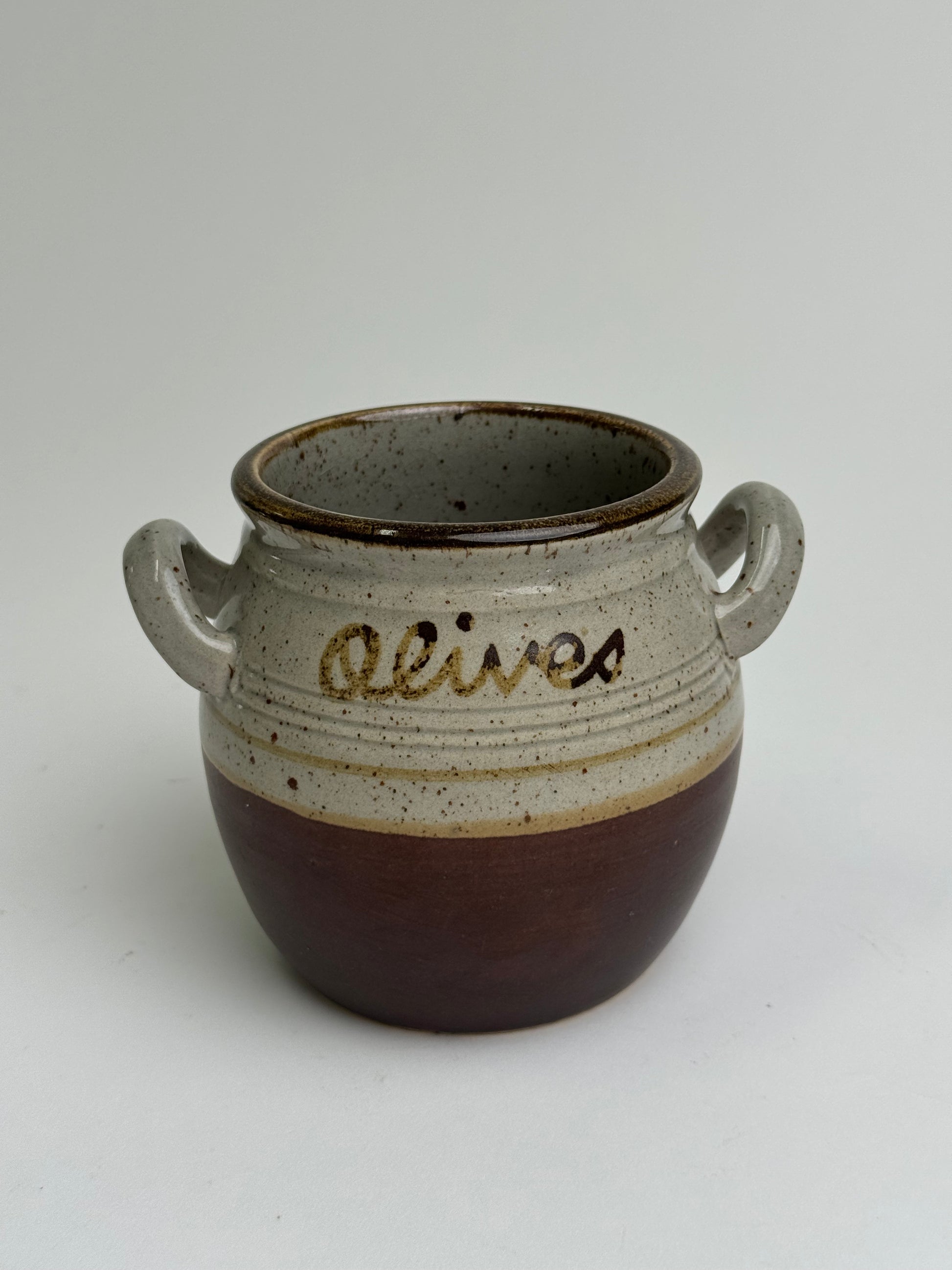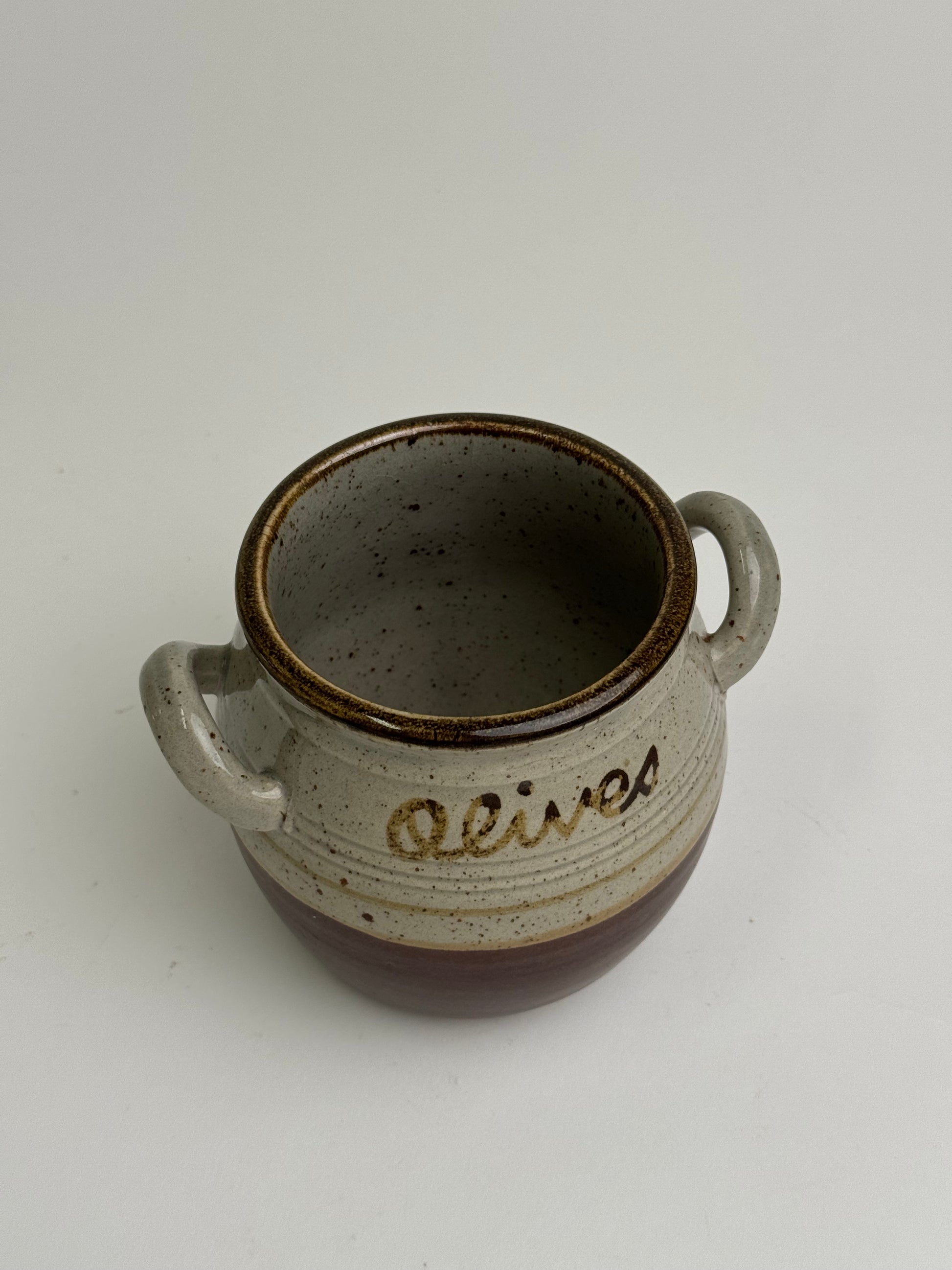 This vintage twin handle olive pot features soft, earthy glaze and hand-lettered with the words " olives ". Originally made for serving/storing olives, wonderful as a characterful shelf piece.
